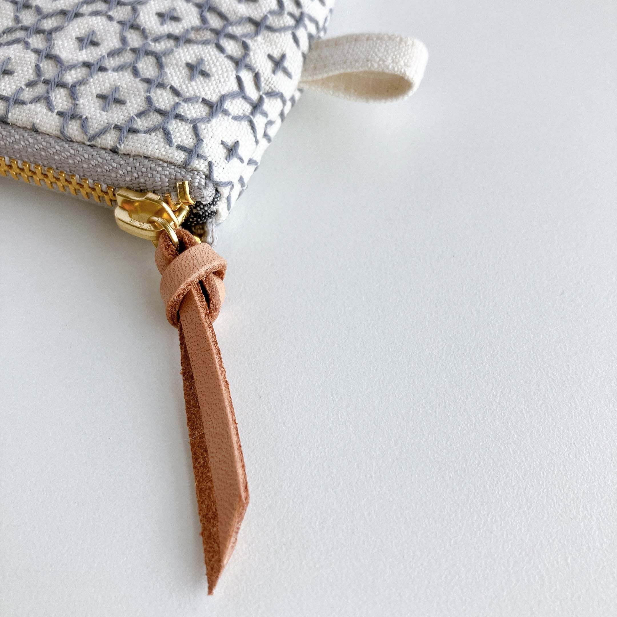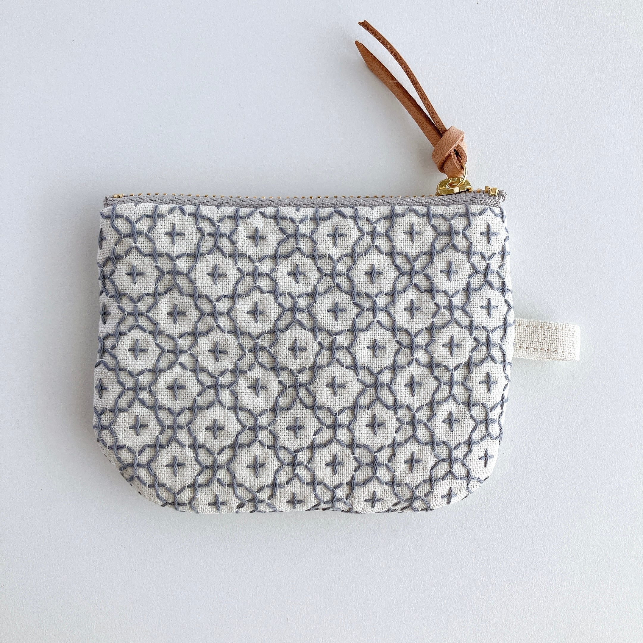 オフホワイト色のリネン生地に刺し子をして作った、小さなファスナーポーチです。