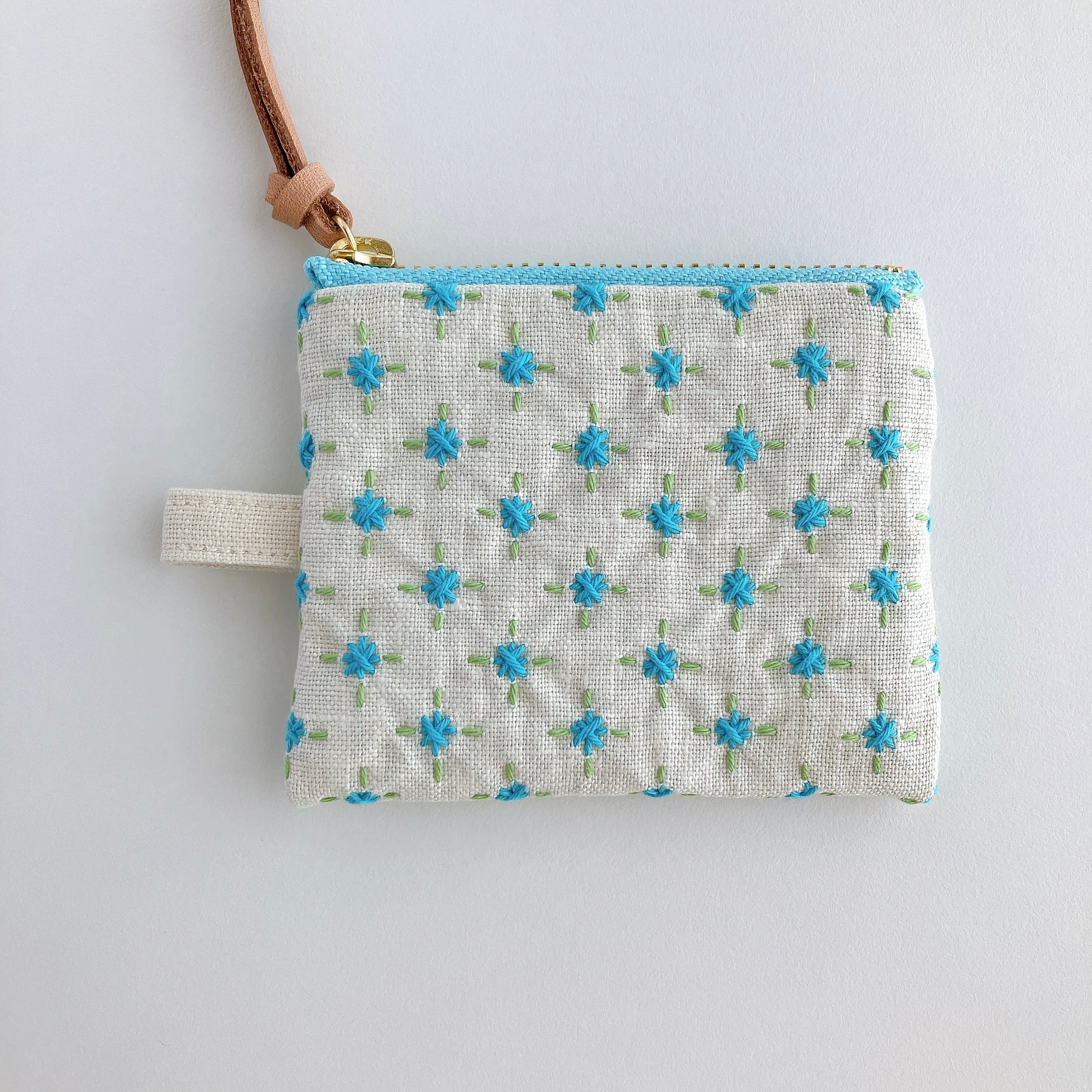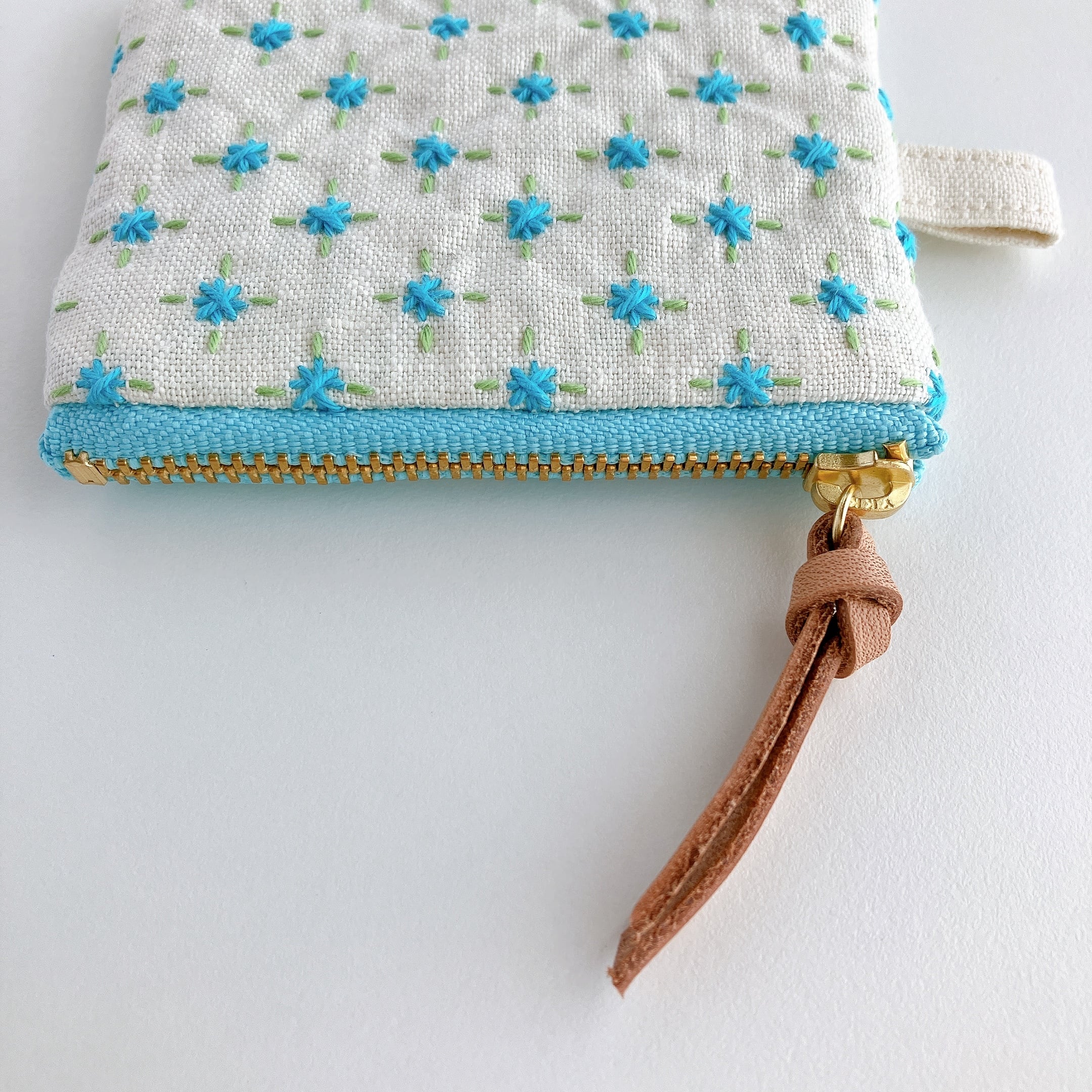 アイボリー色のリネン生地に刺し子をして作ったミニサイズのファスナーポーチです。