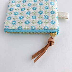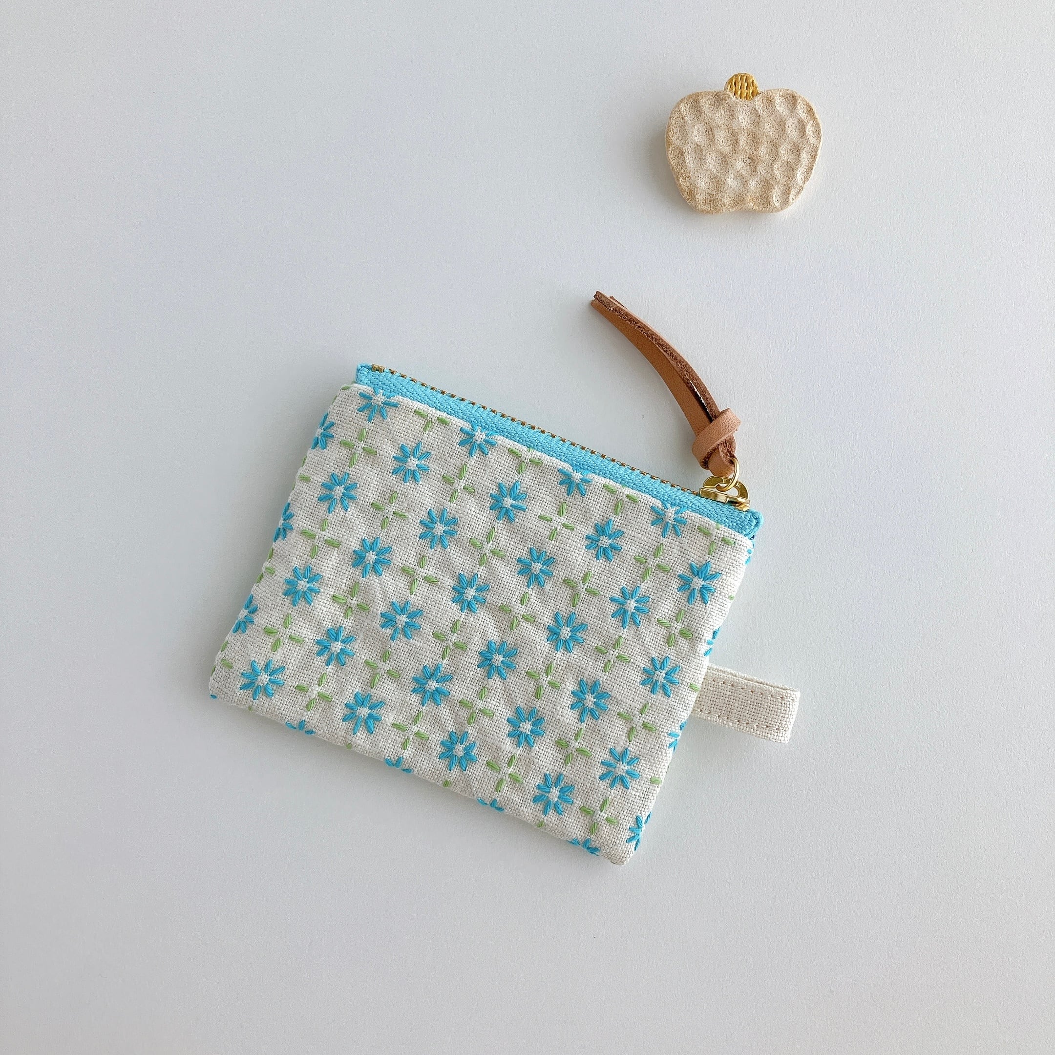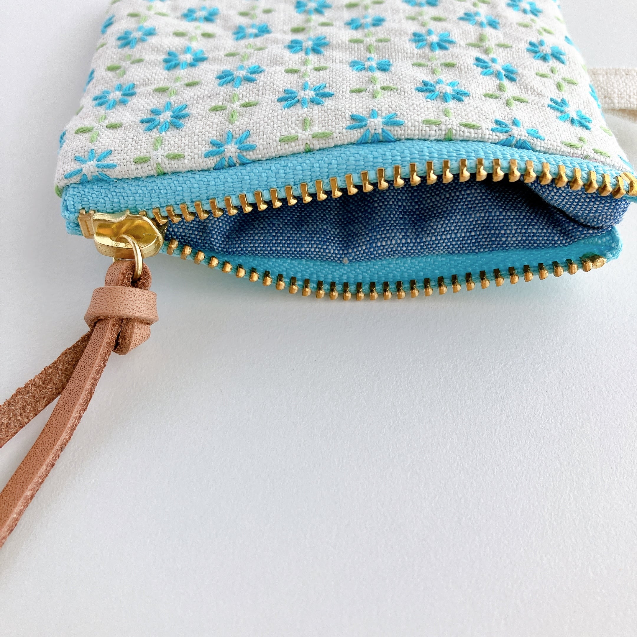 アイボリー色のリネン生地に刺し子をして作ったミニサイズのファスナーポーチです。