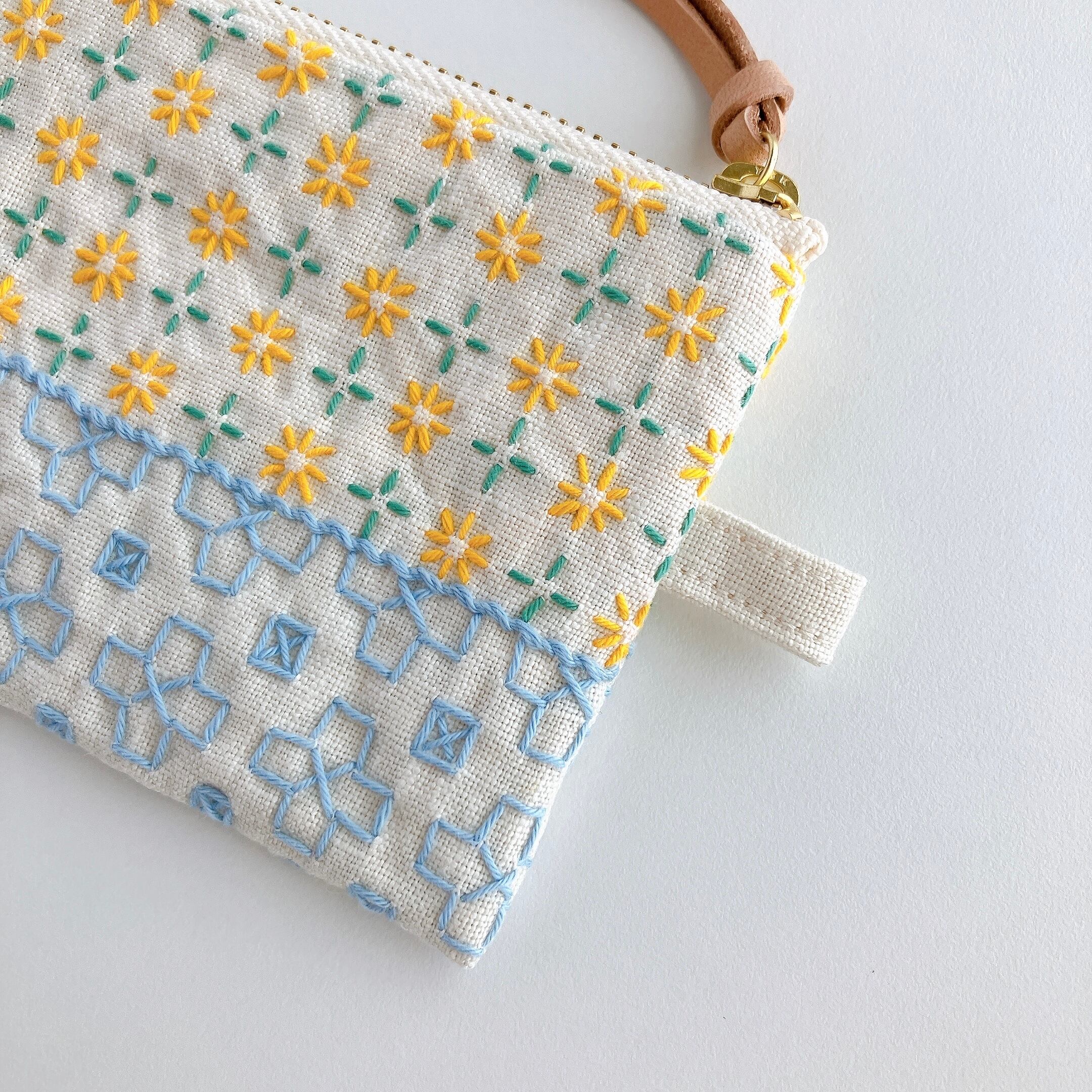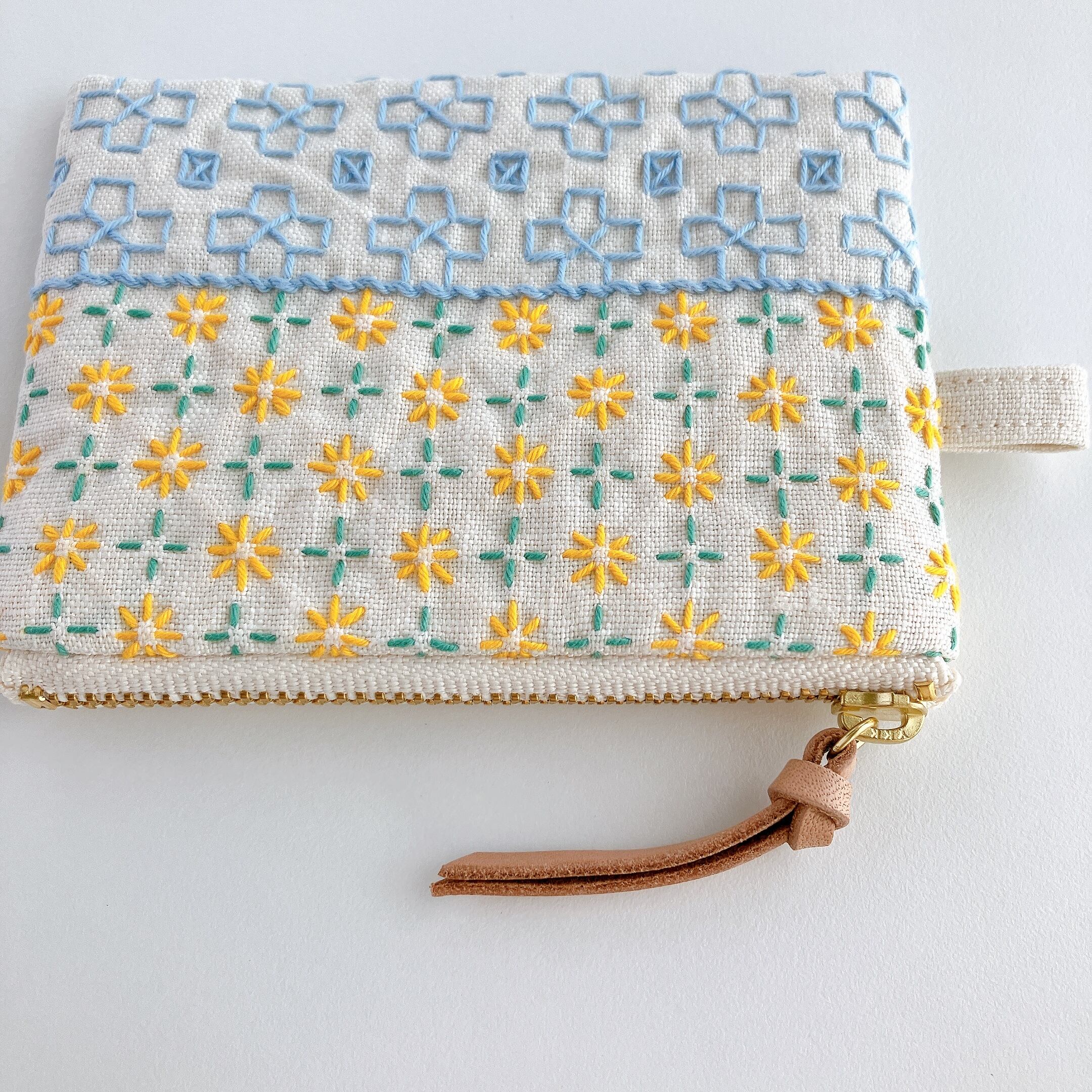 アイボリー色のリネン生地に刺し子をして作った、小さなファスナーポーチです。