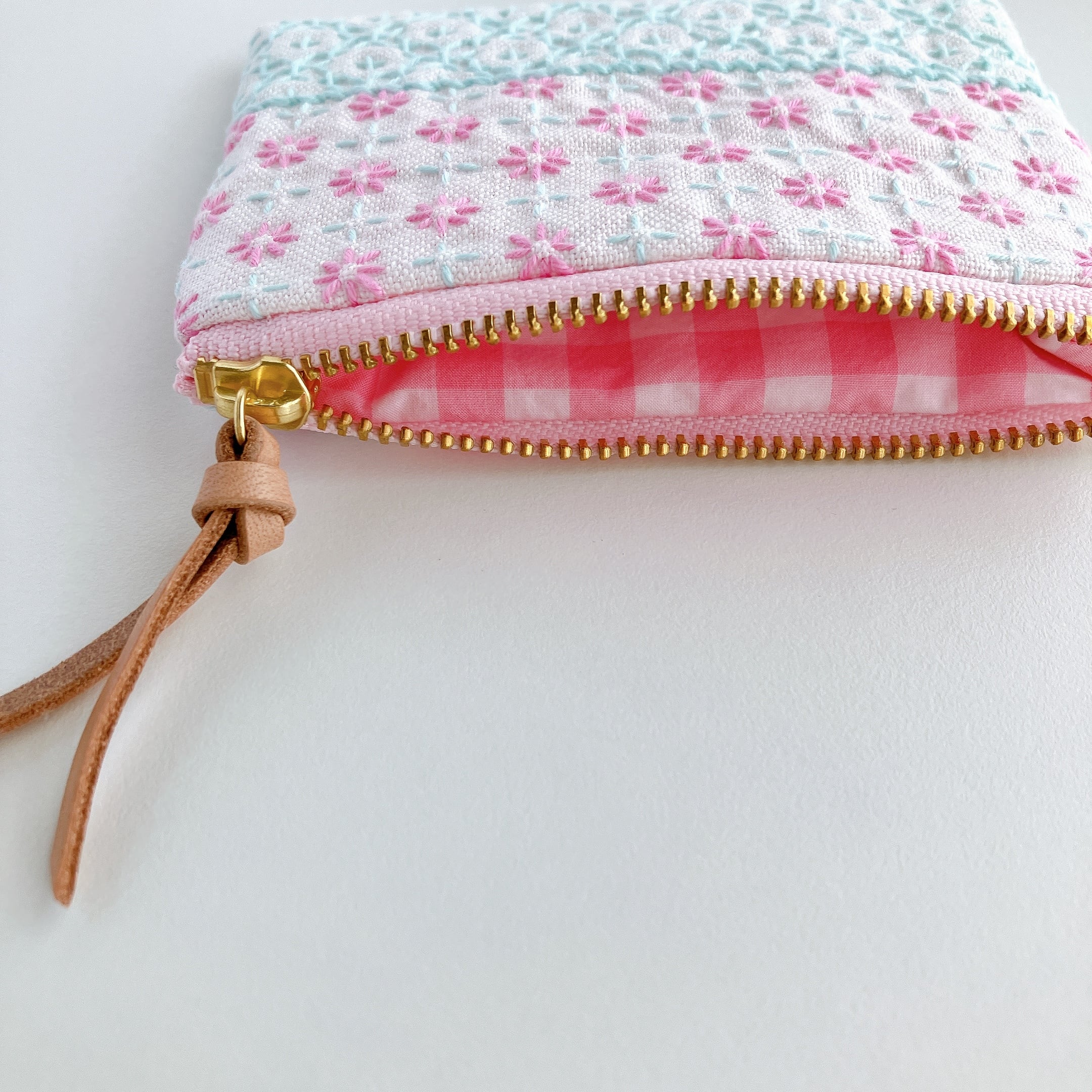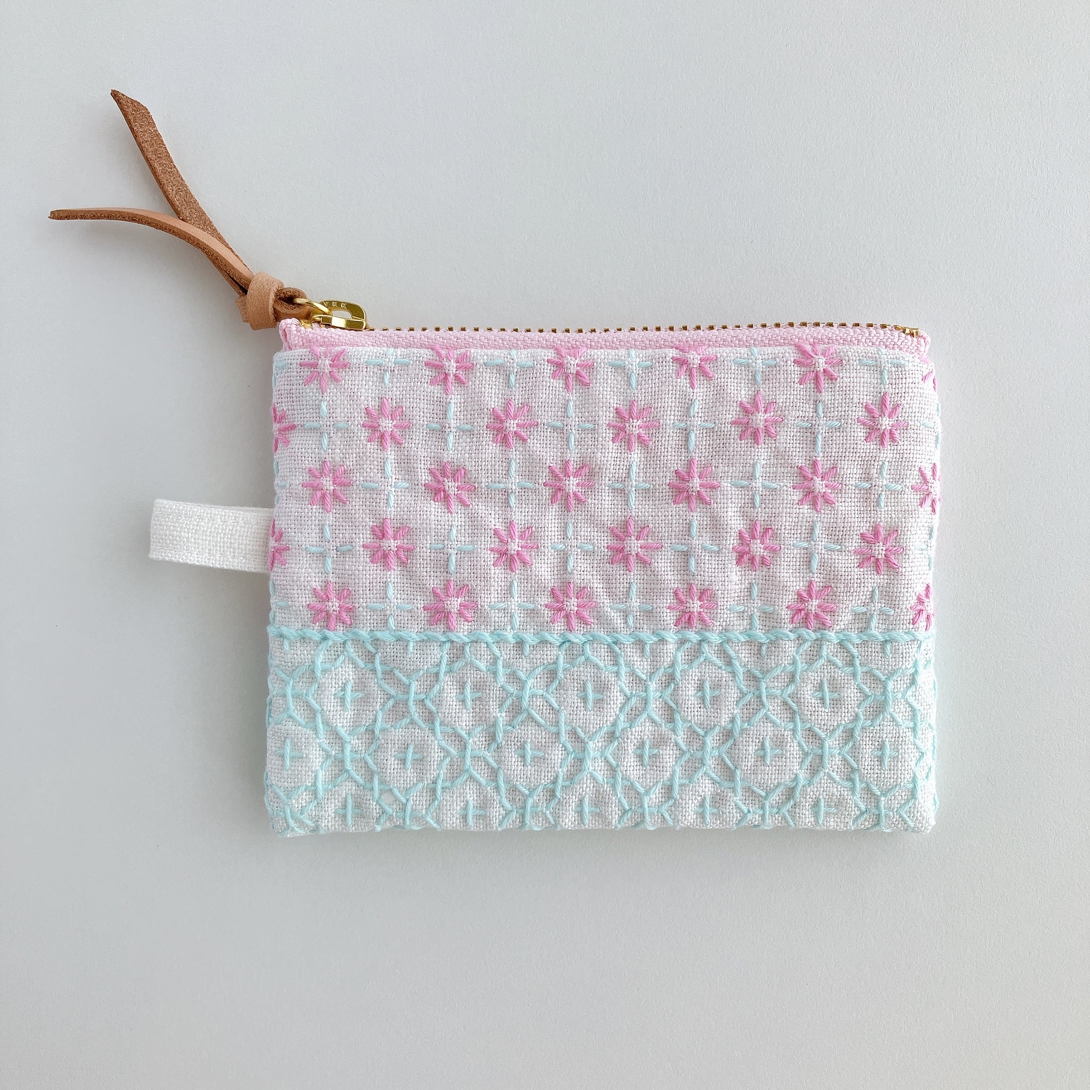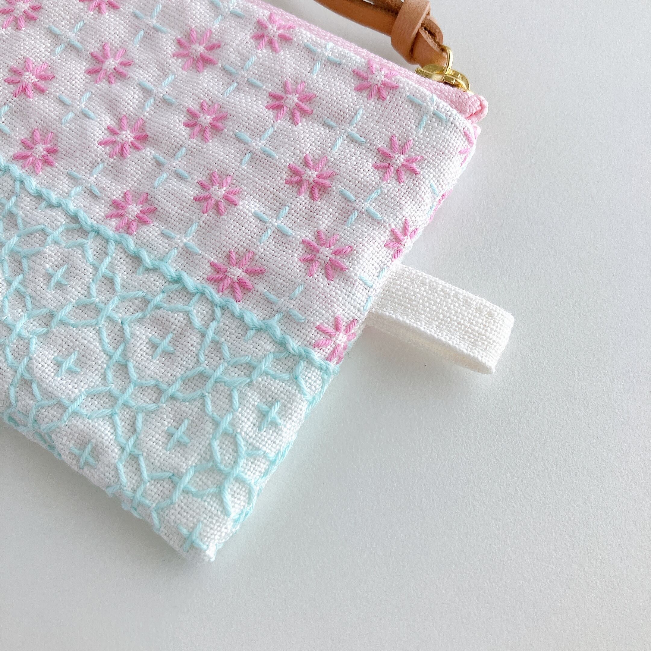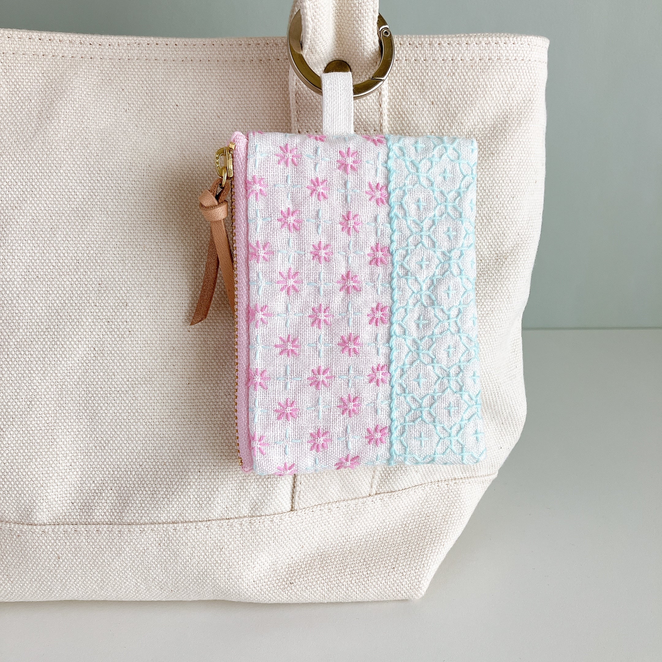 ホワイト色のリネン生地に刺し子をして作った、小さなファスナーポーチです。