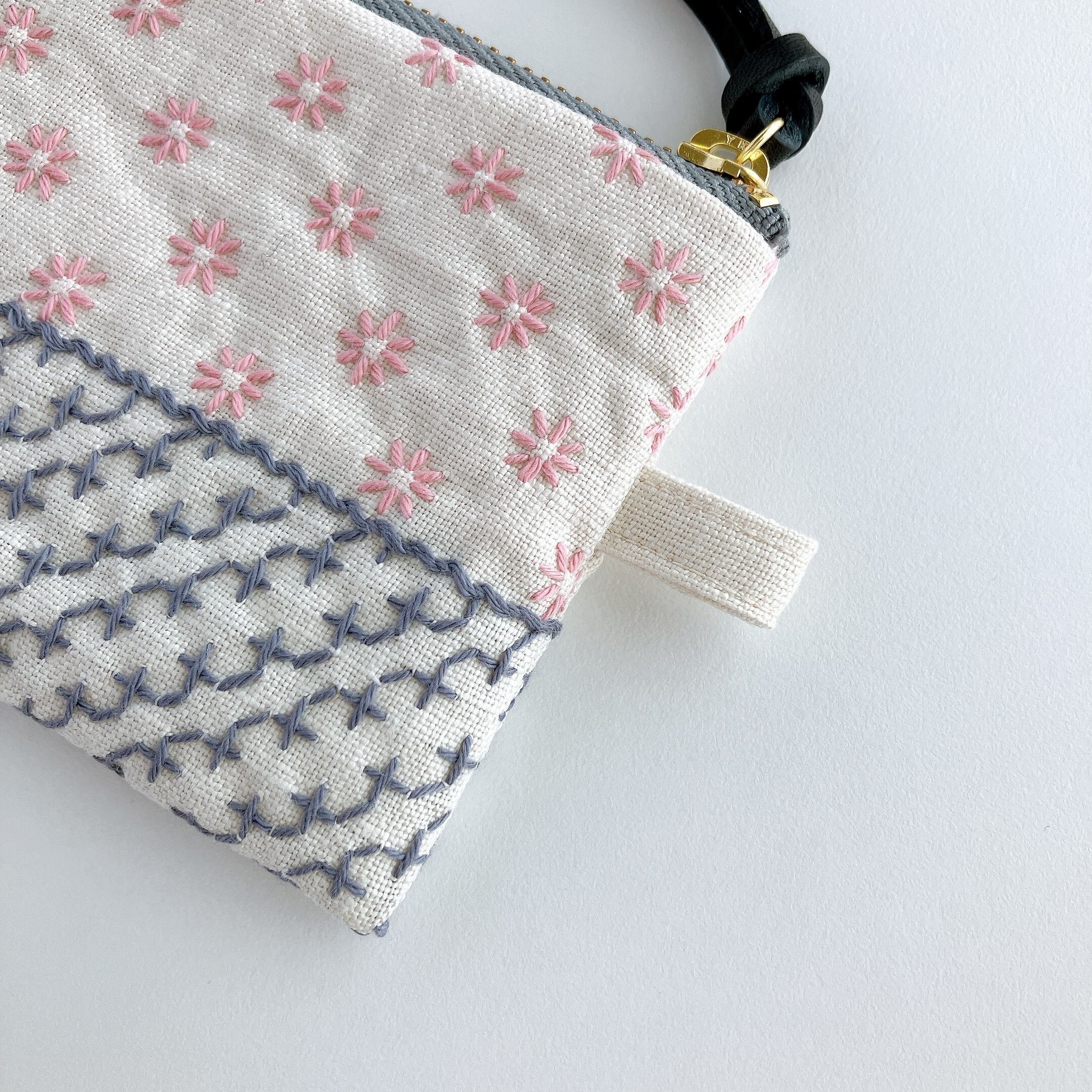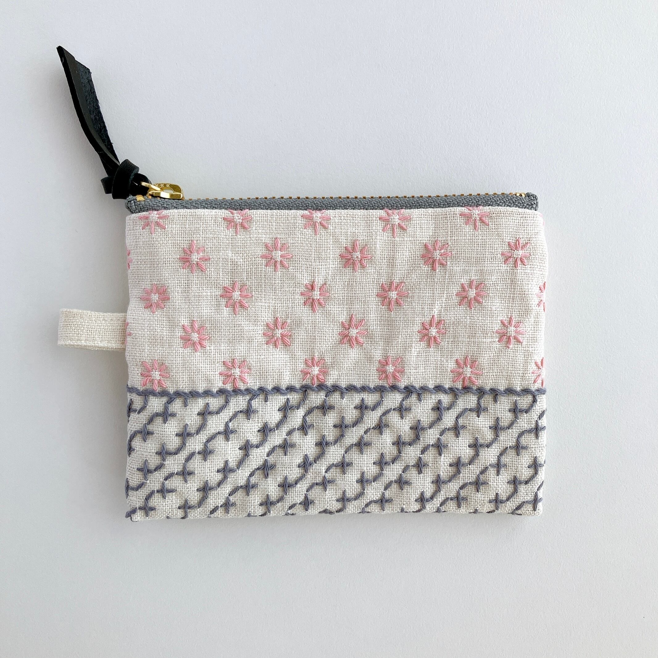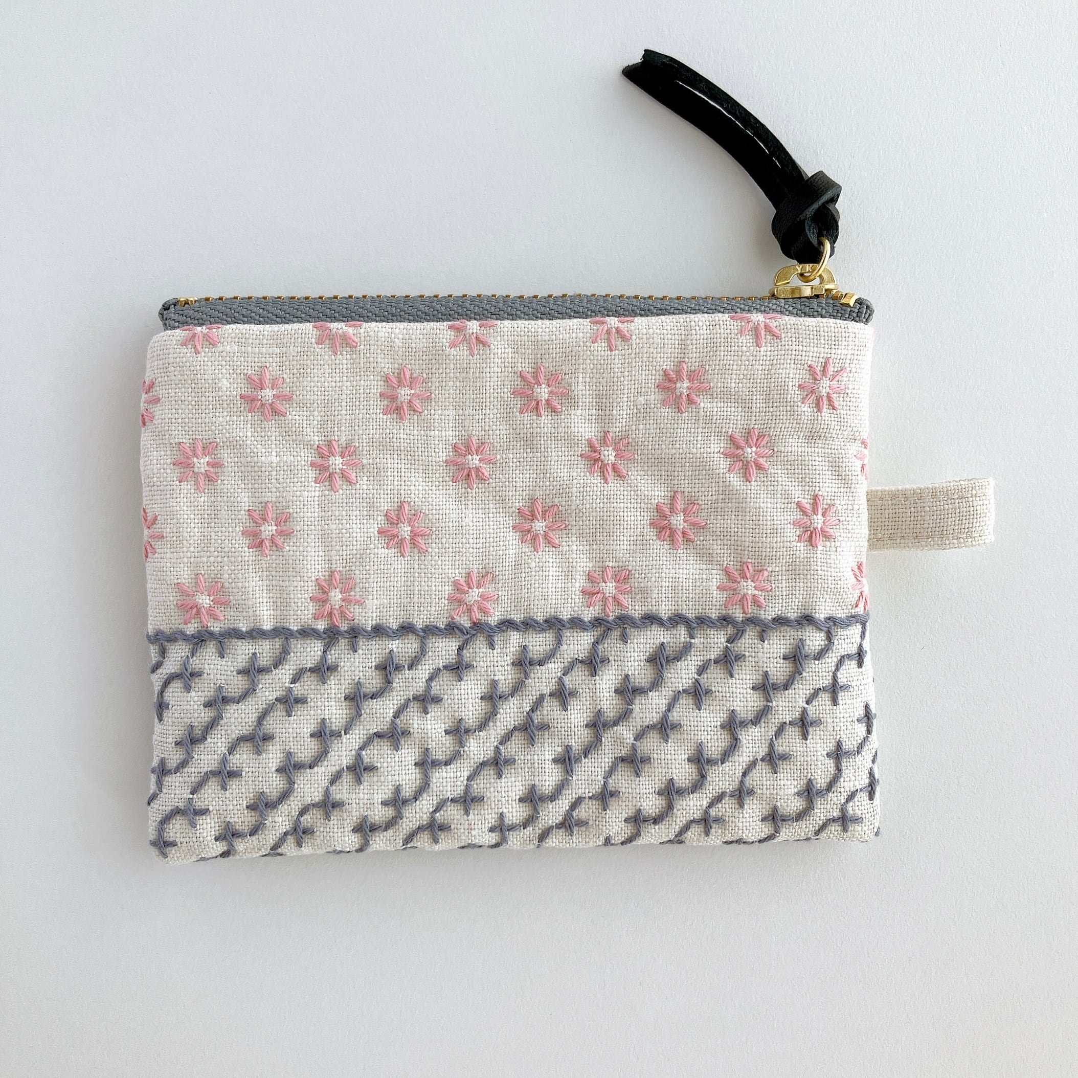 アイボリー色のリネン生地に刺し子をして作った、小さなファスナーポーチです。