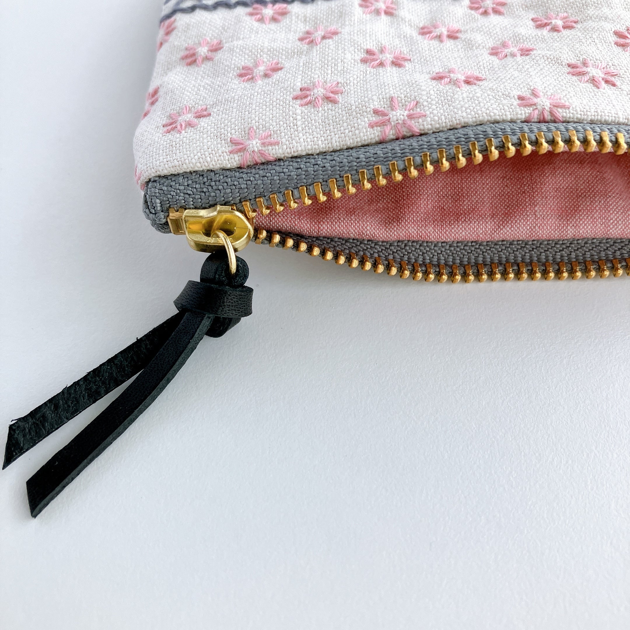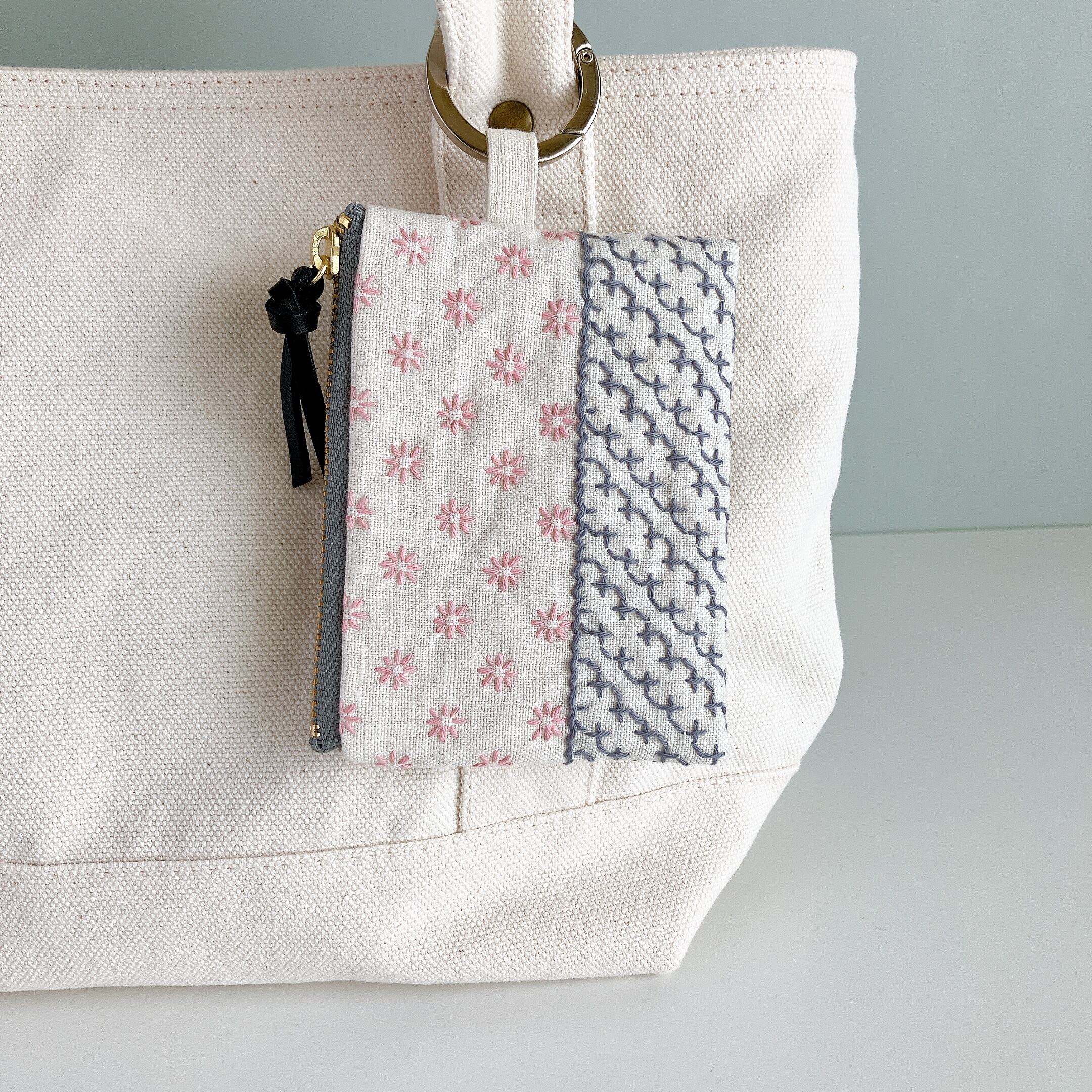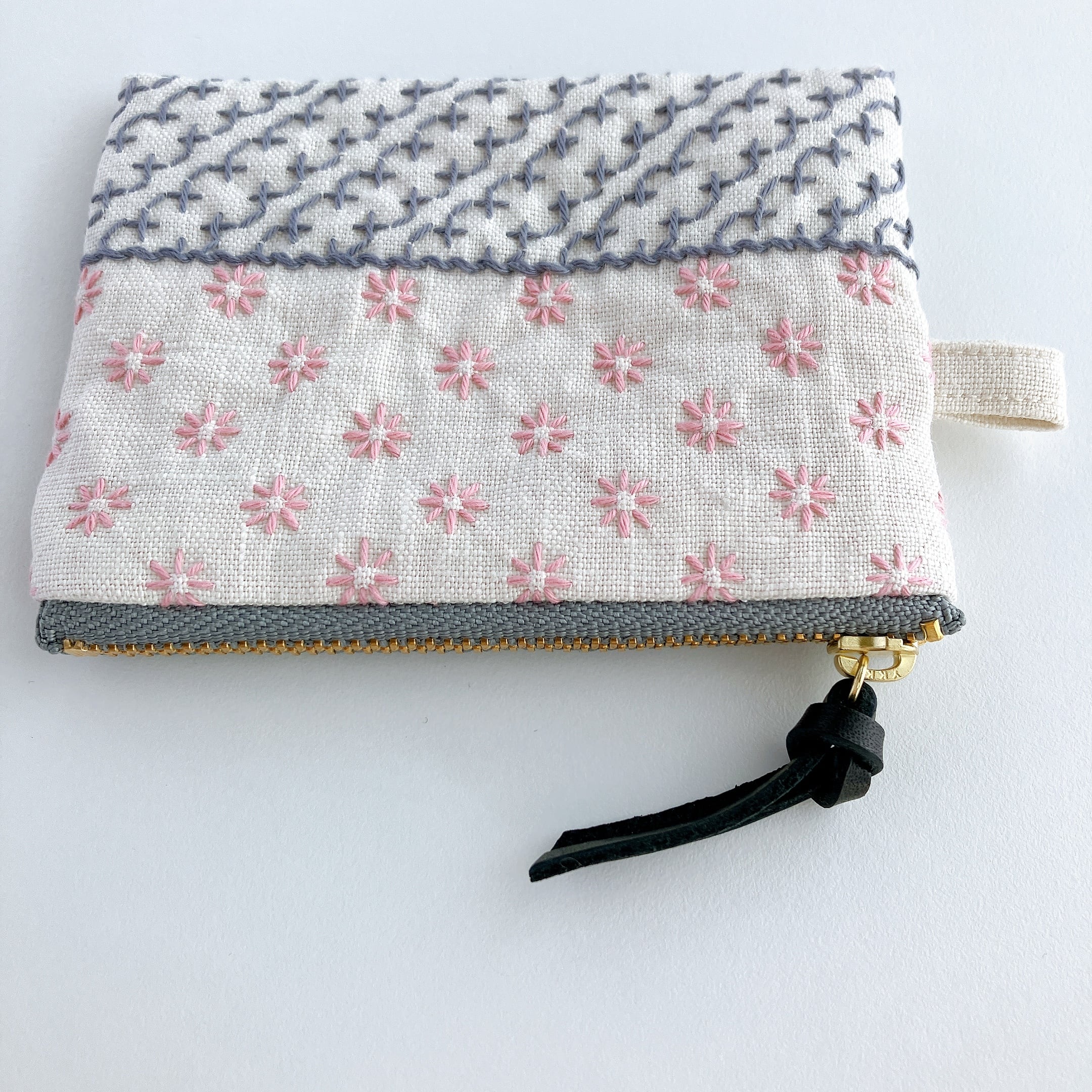 アイボリー色のリネン生地に刺し子をして作った、小さなファスナーポーチです。