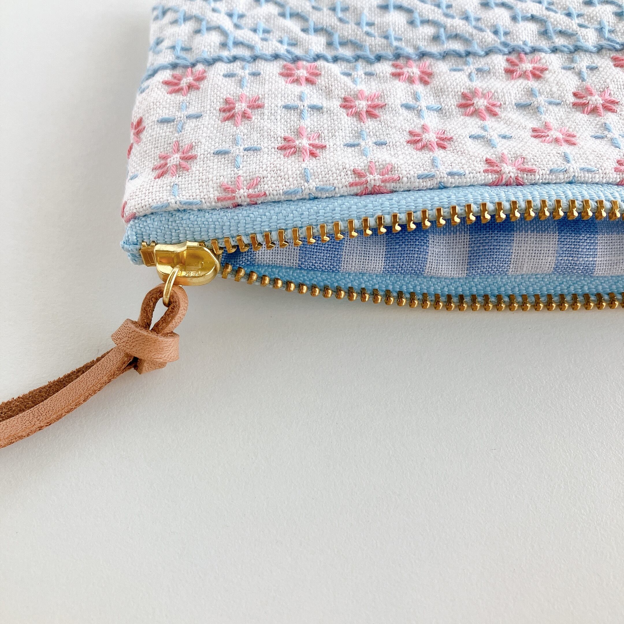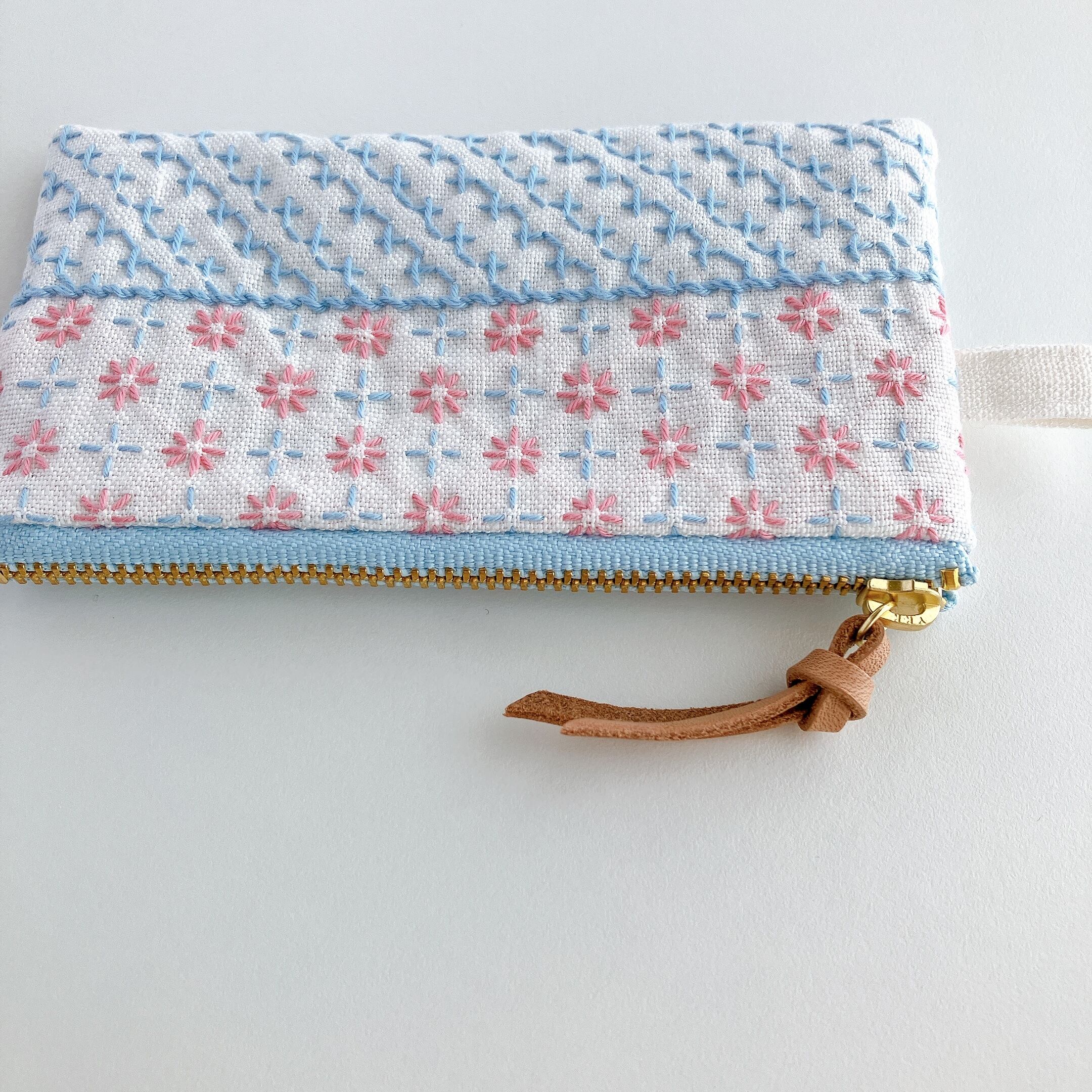ホワイト色のリネン生地に刺し子をして作ったファスナーポーチです。