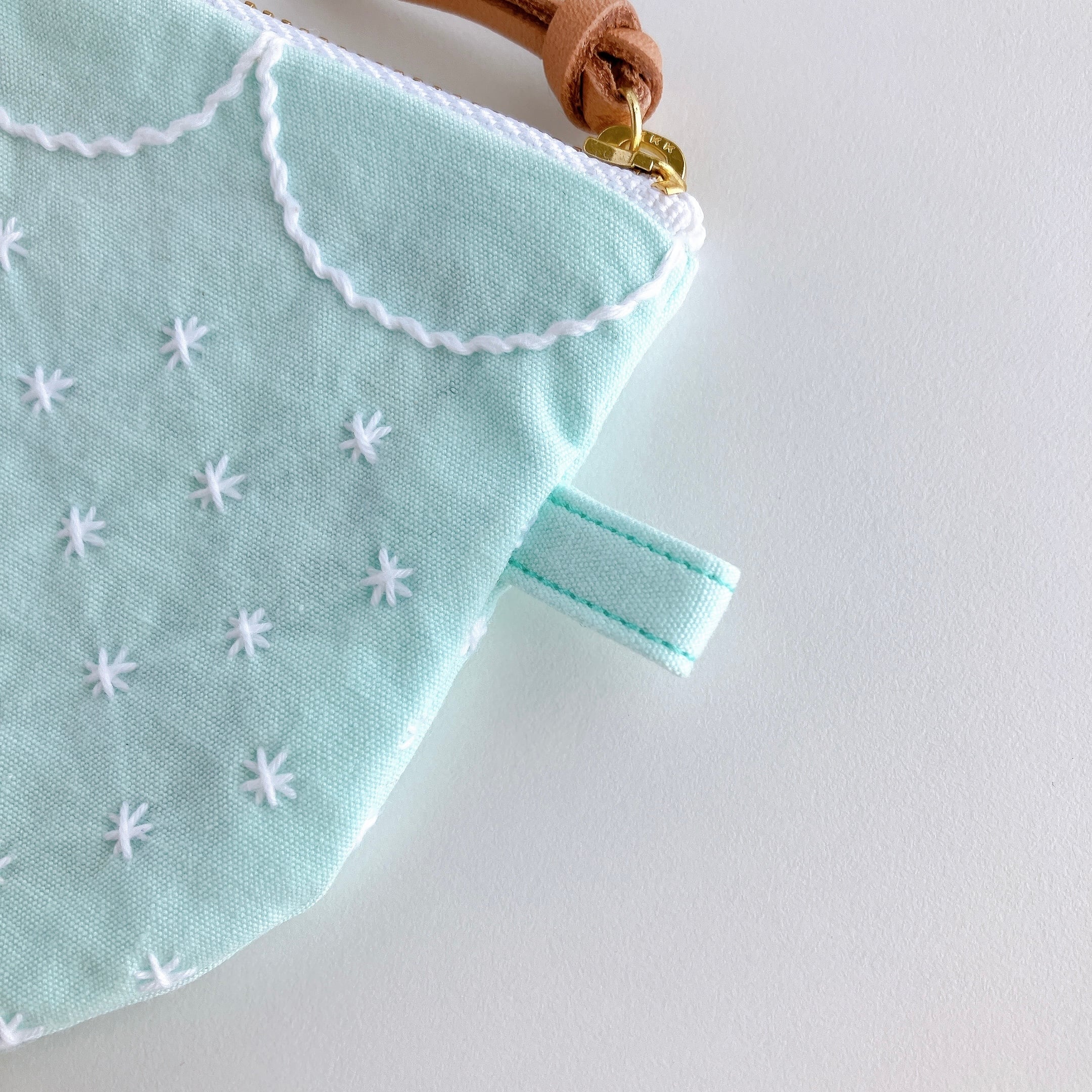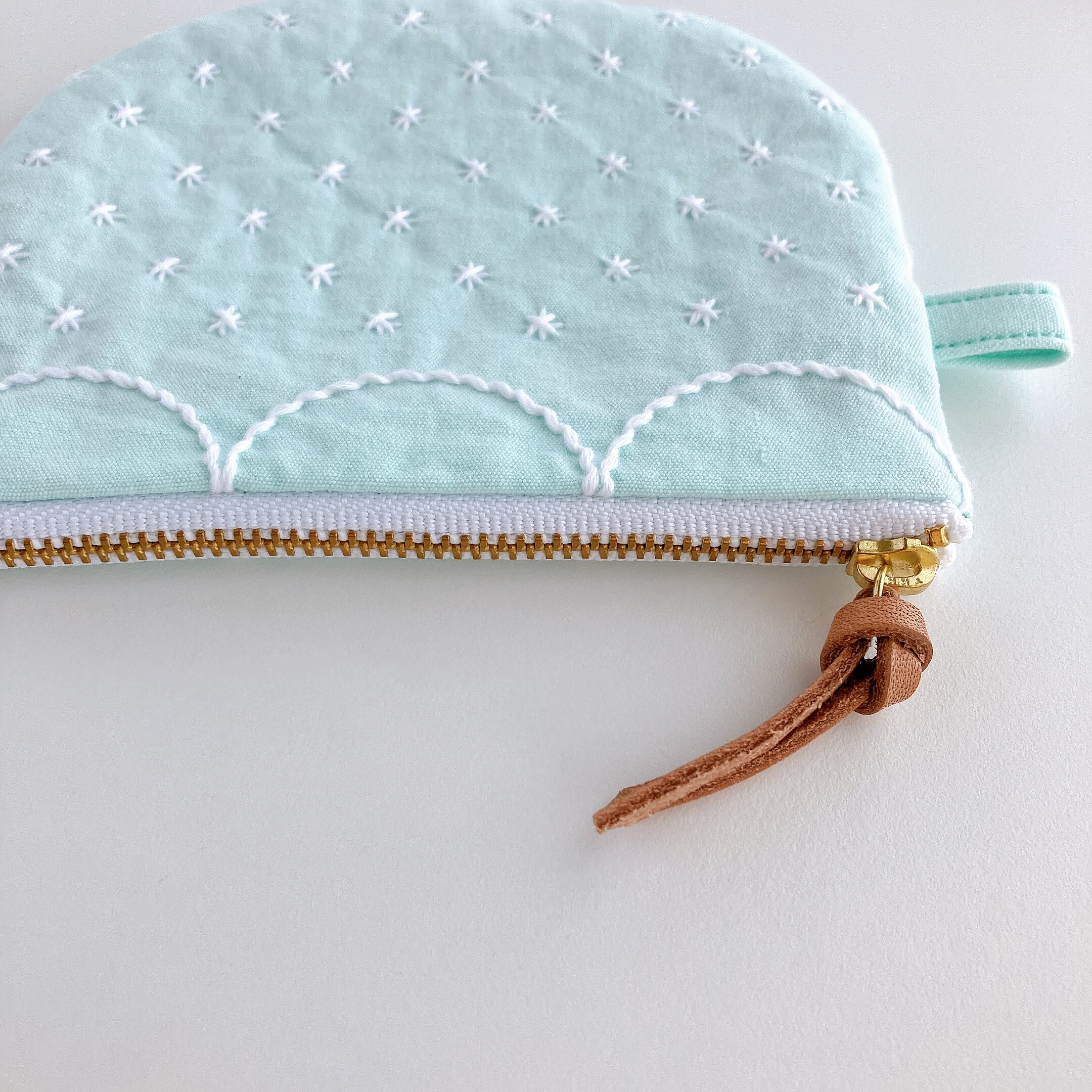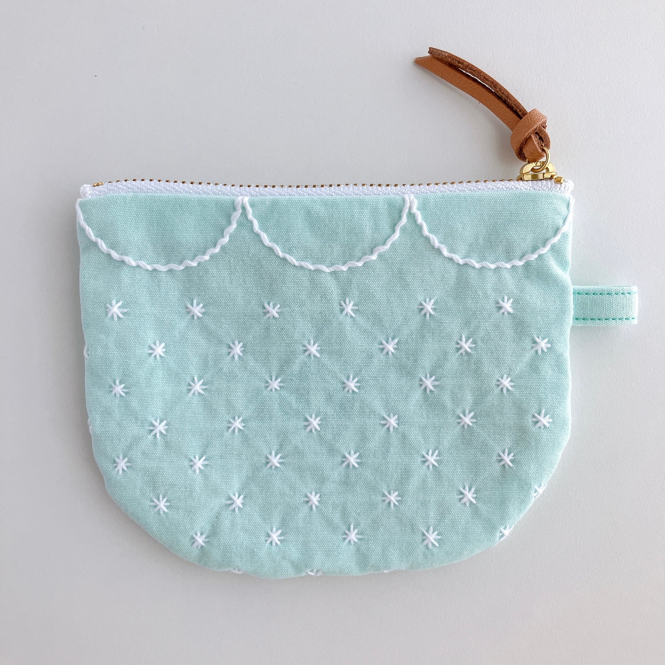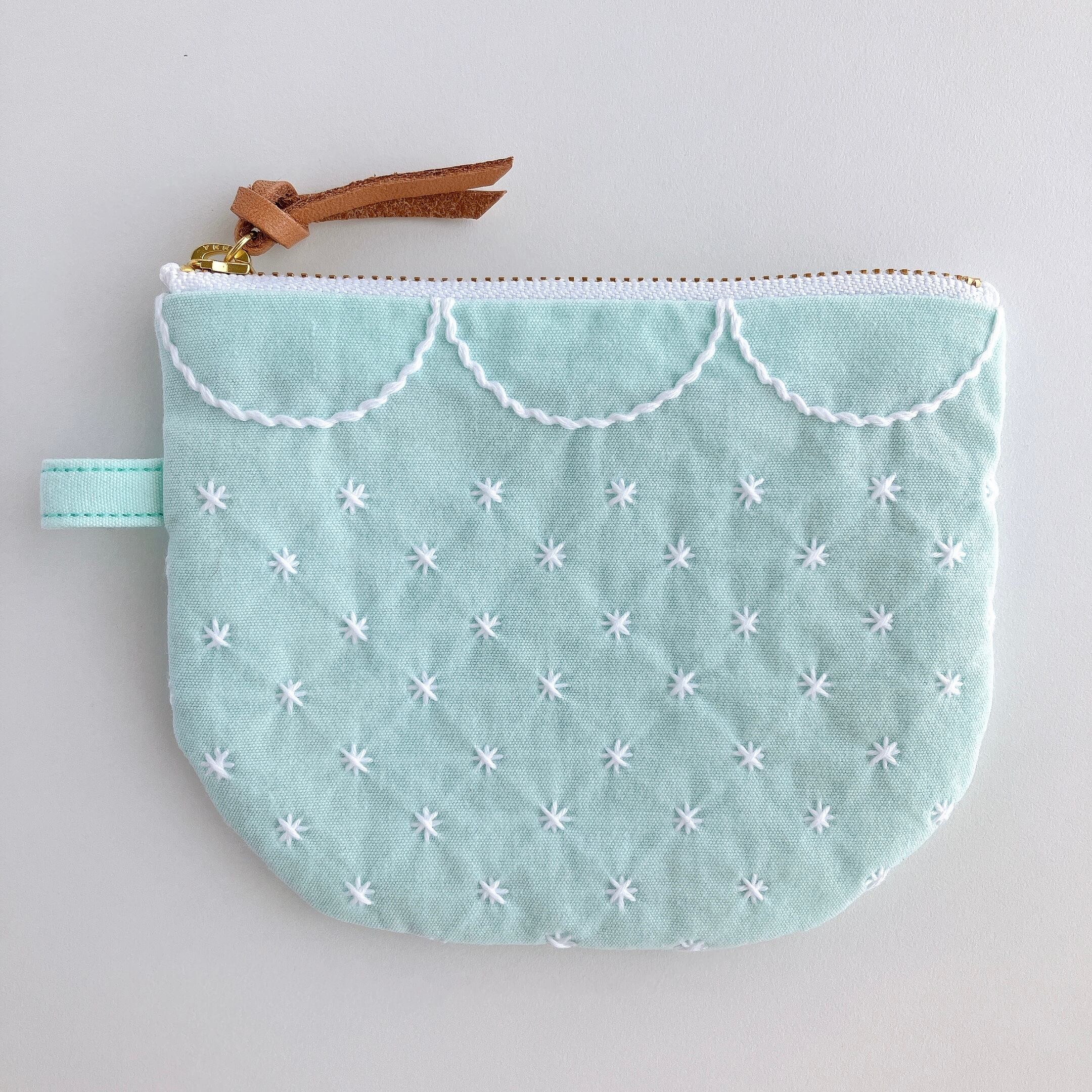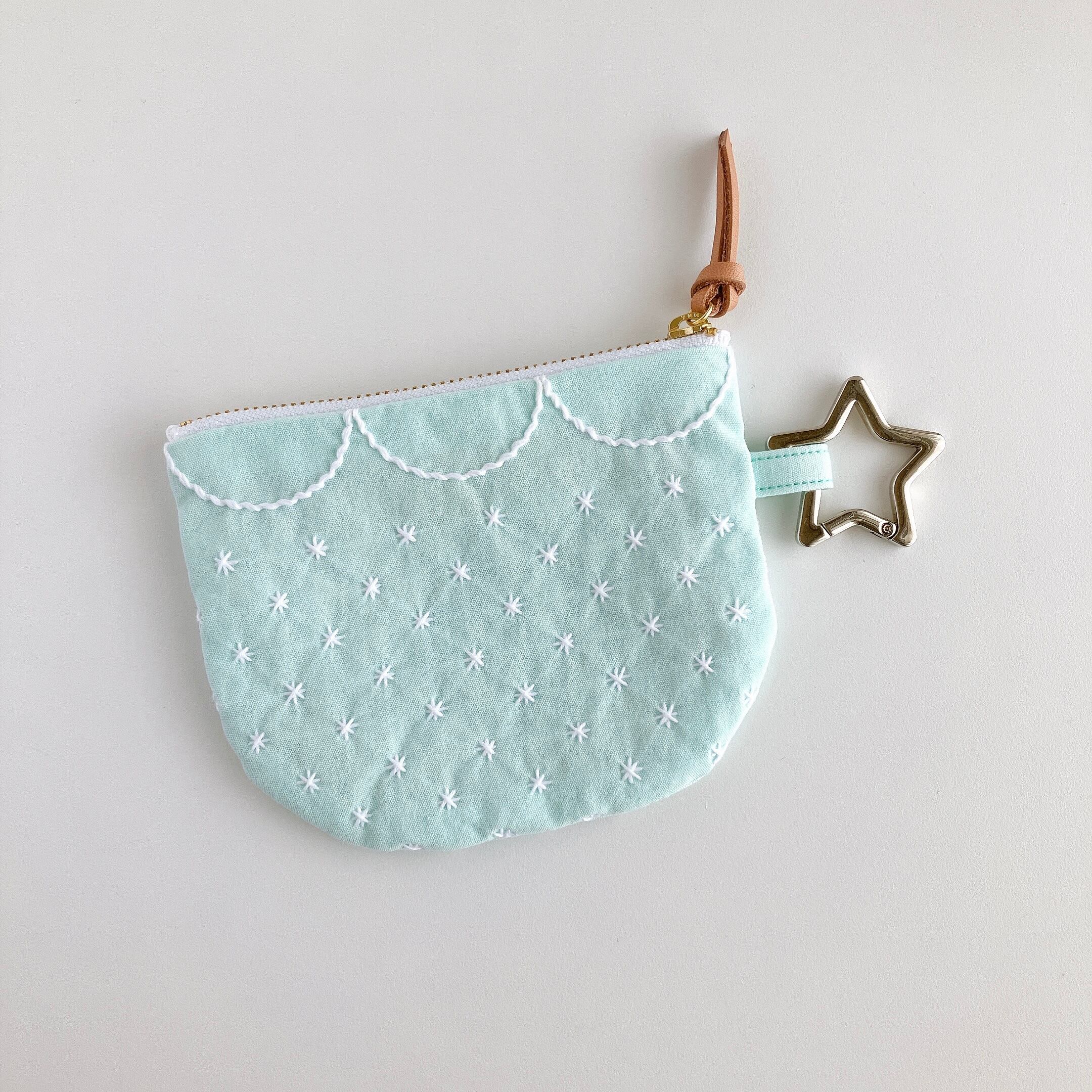 ミント色のコットン生地に刺し子をして作ったファスナーポーチです。