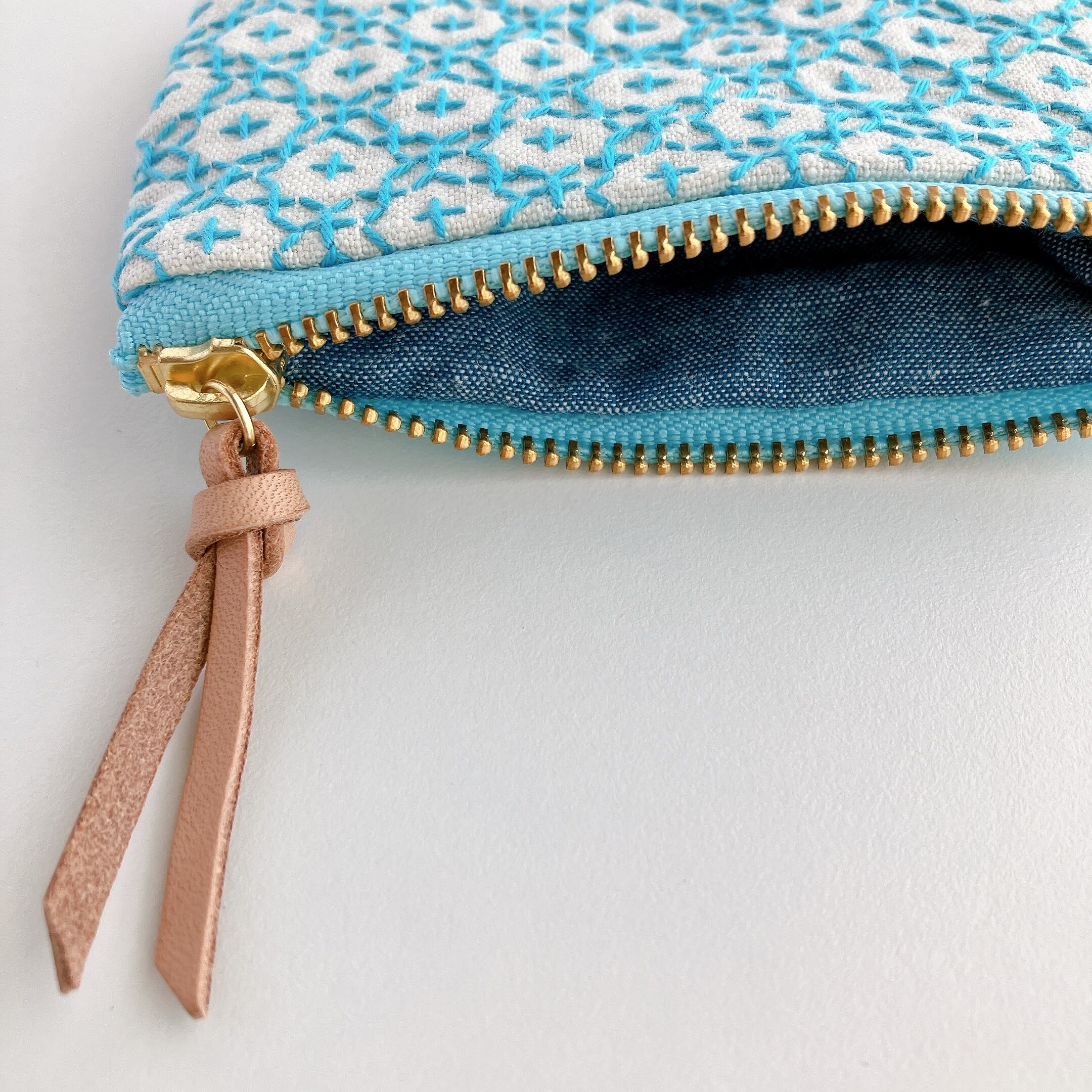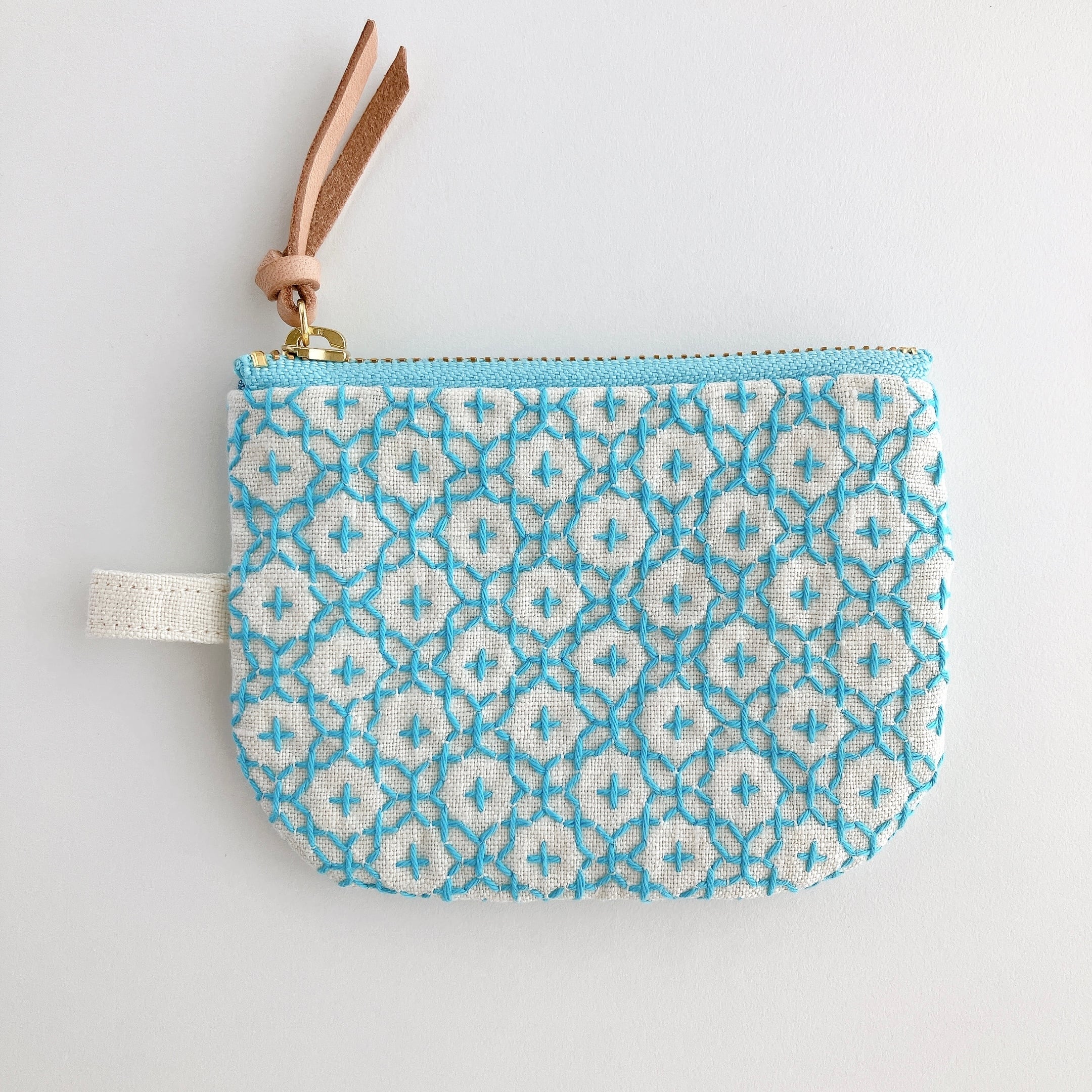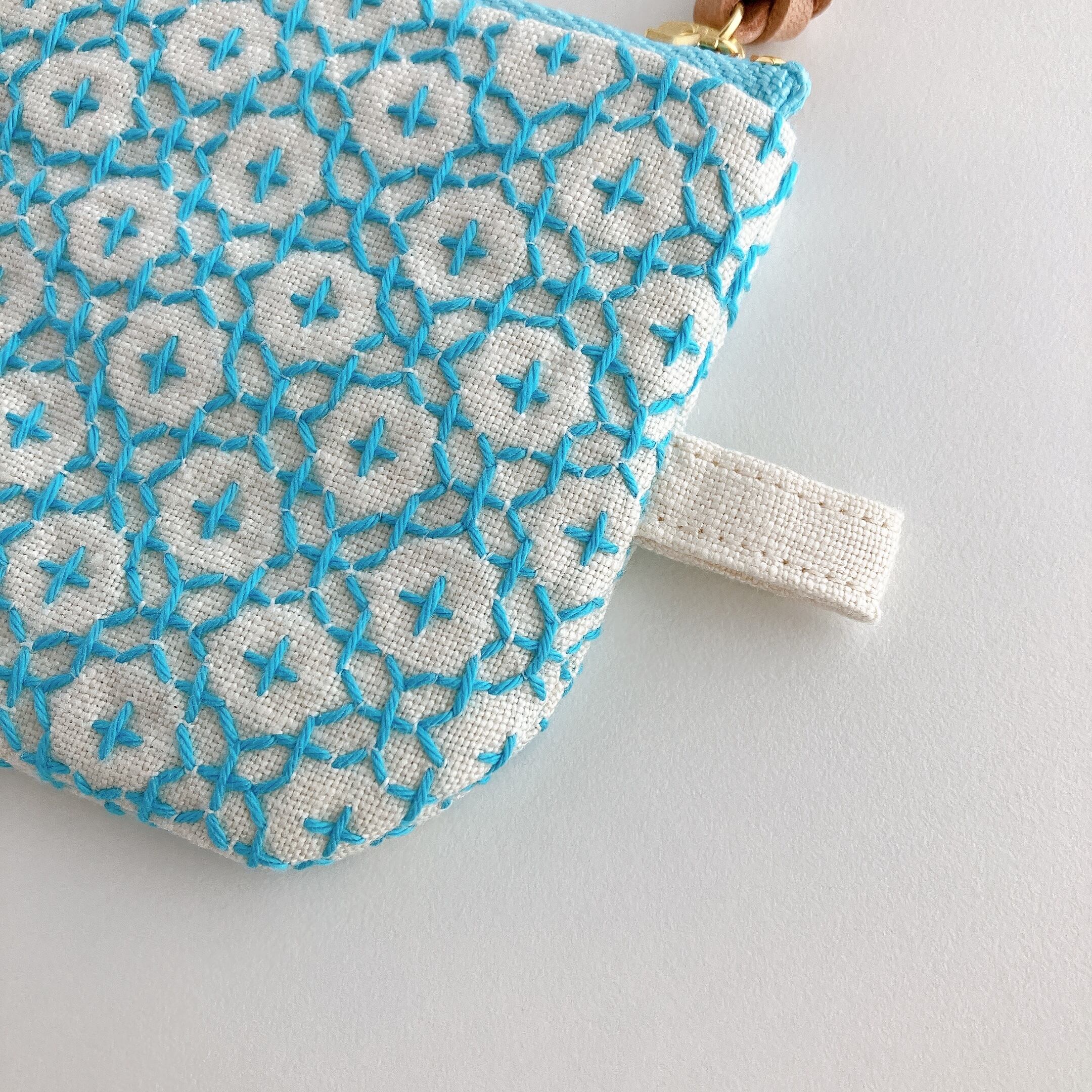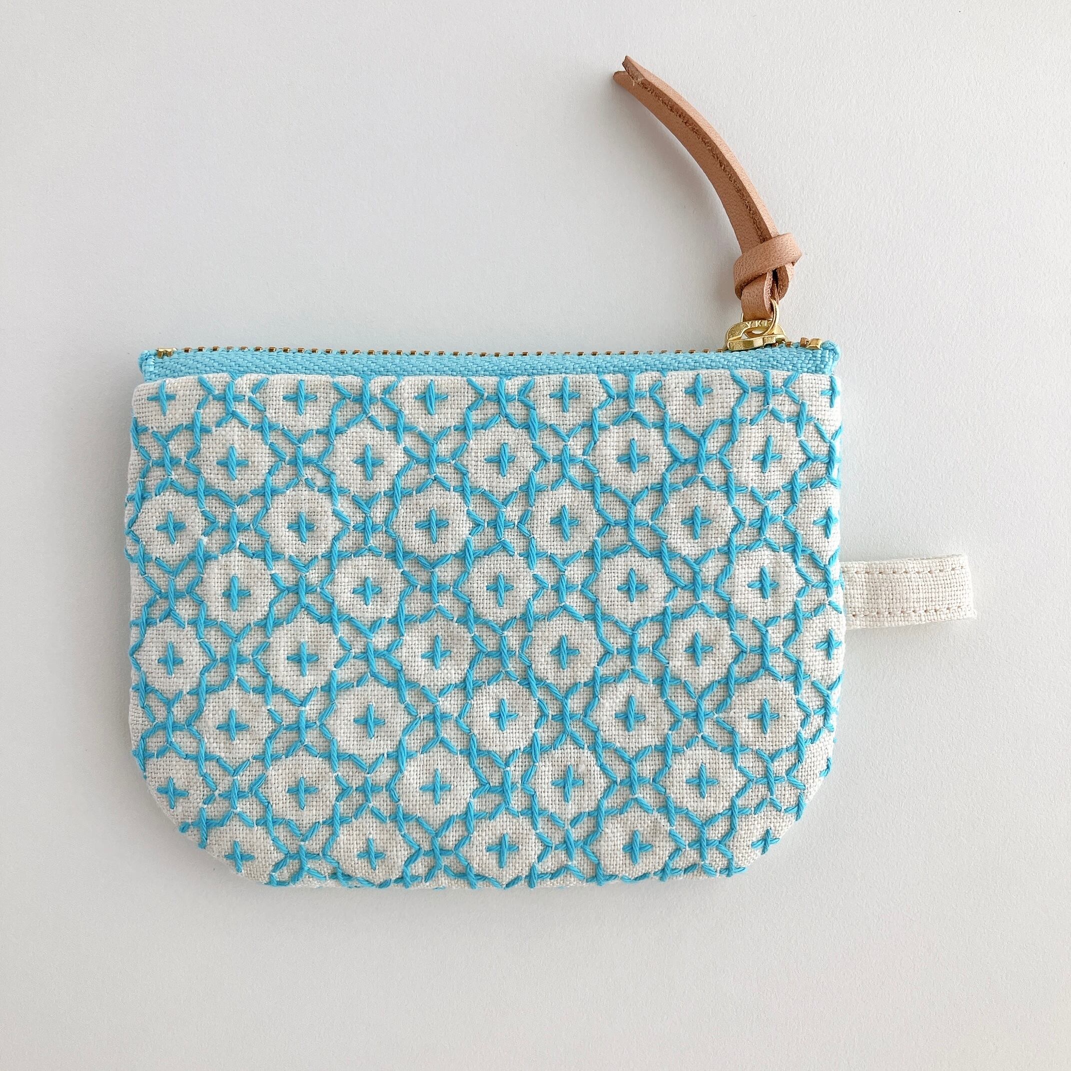 アイボリー色のリネン生地に刺し子をして作った、小さなファスナーポーチです。