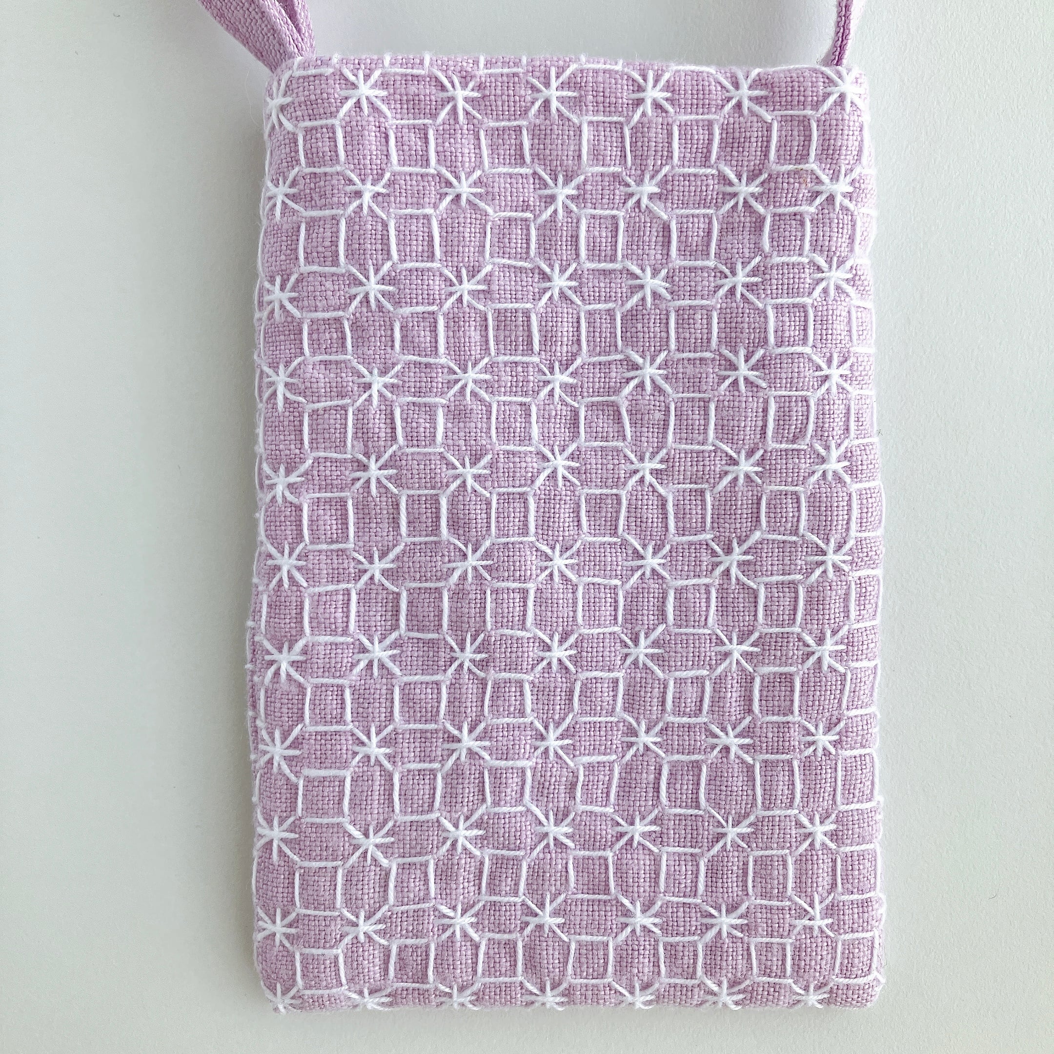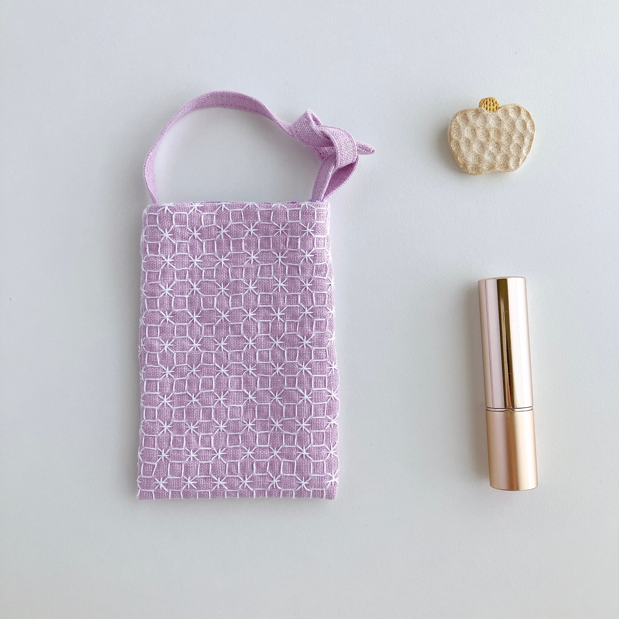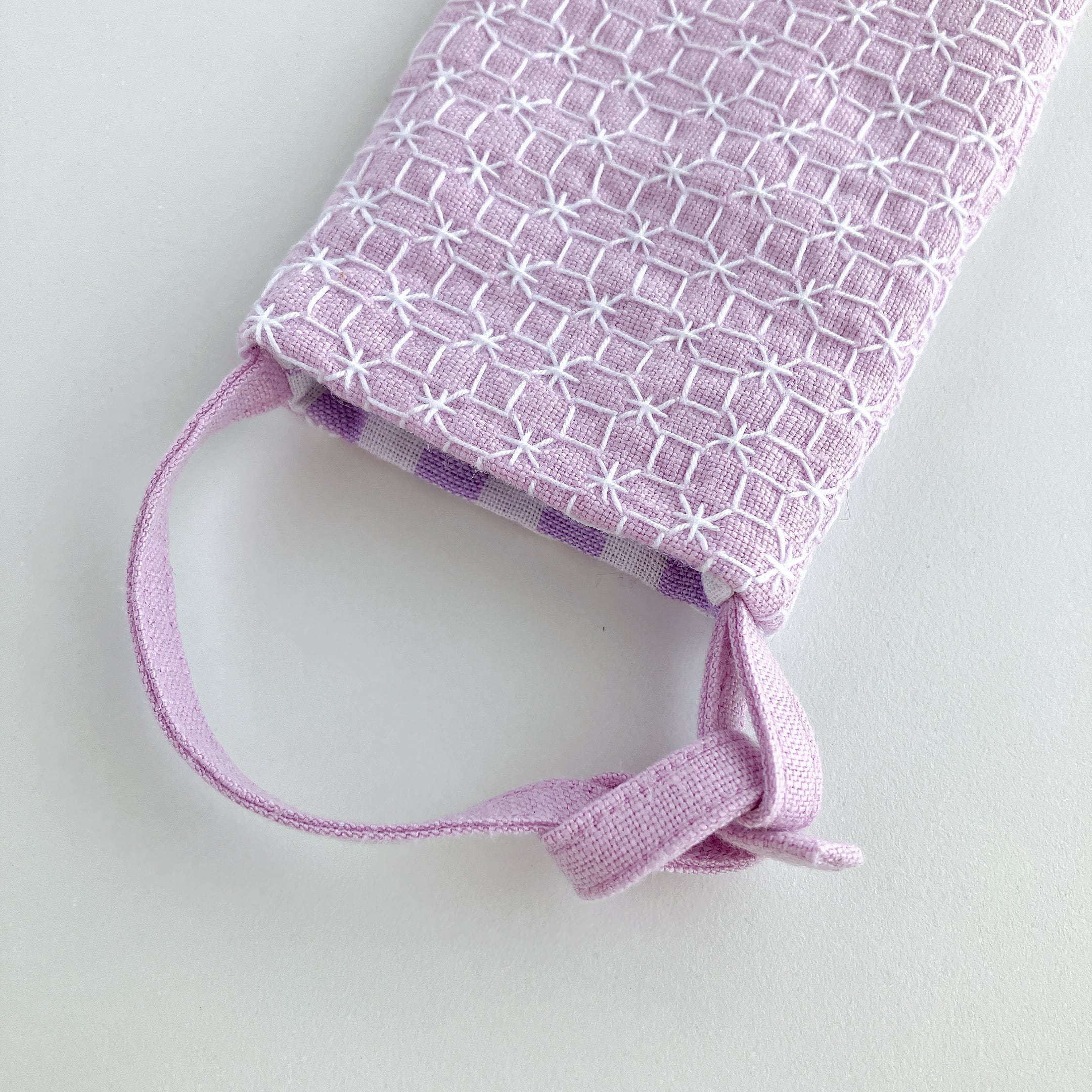 ラベンダー色のリネン生地に、刺し子をして作ったミニミニサイズのバッグです。