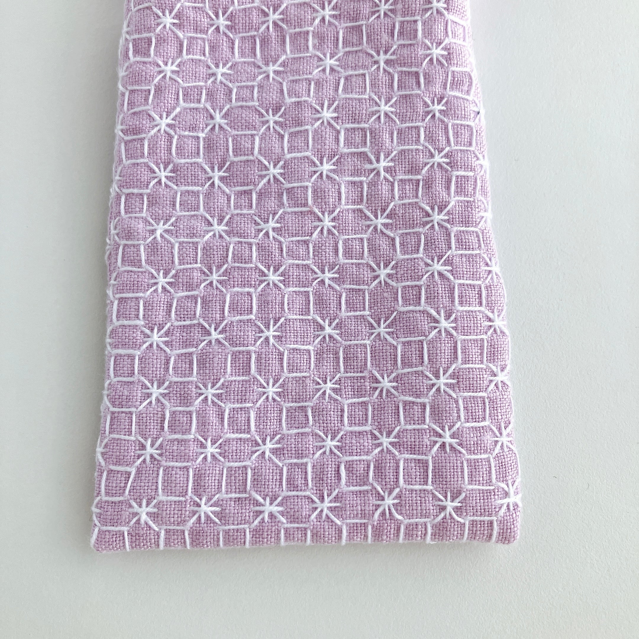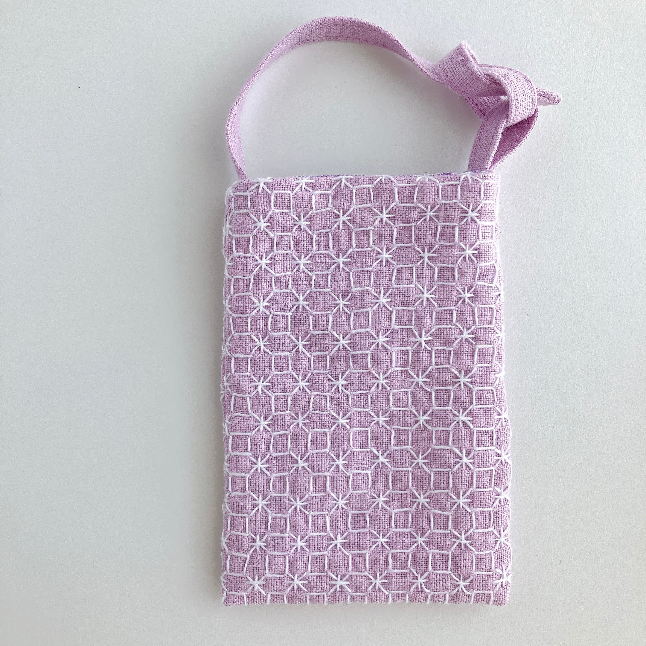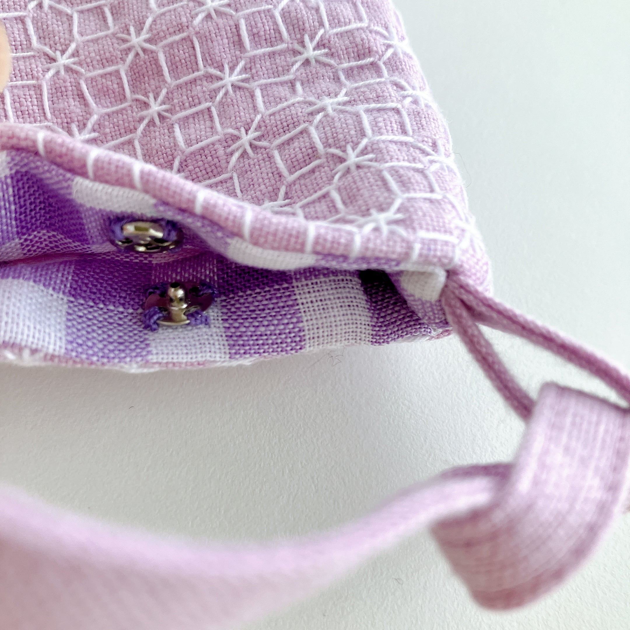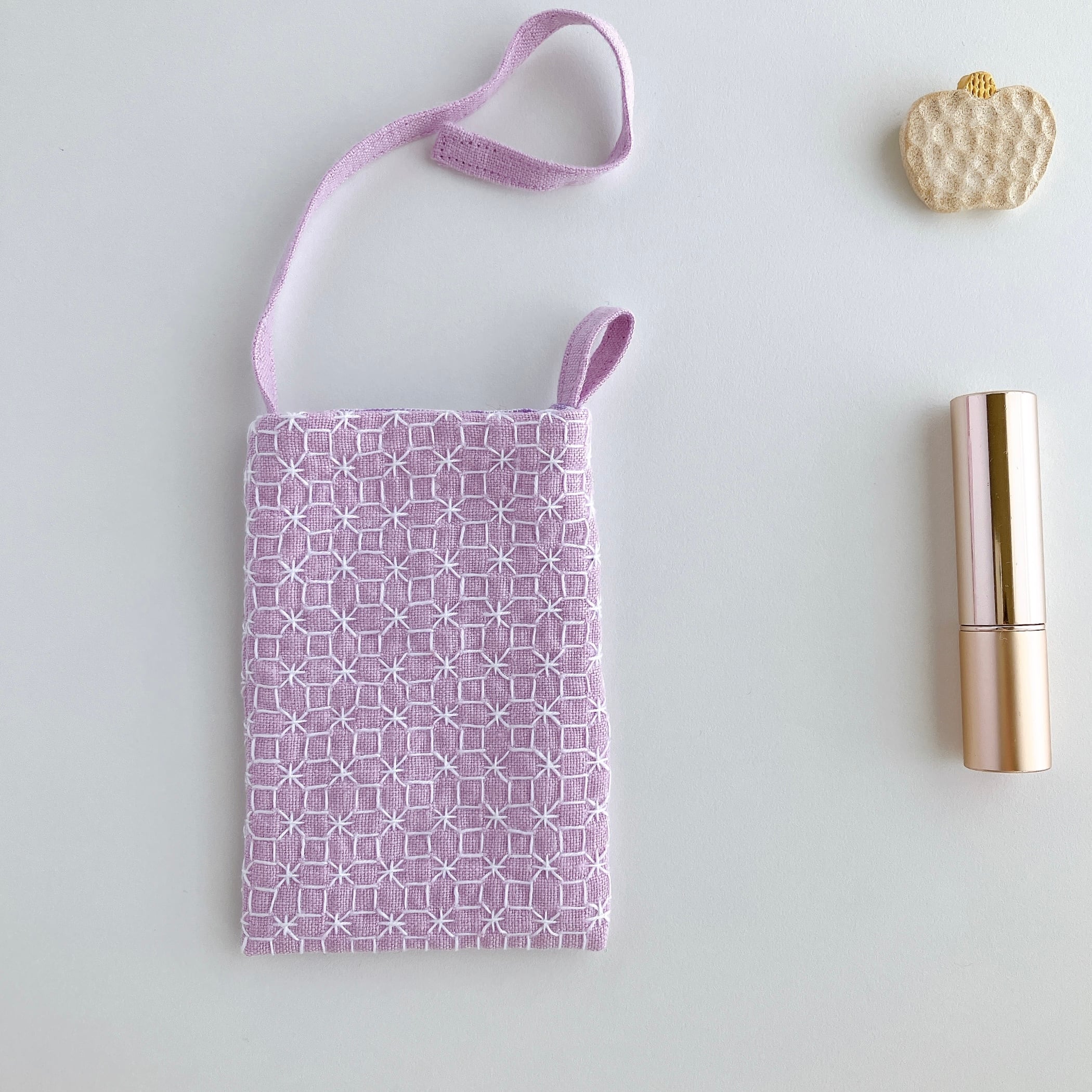 ラベンダー色のリネン生地に、刺し子をして作ったミニミニサイズのバッグです。