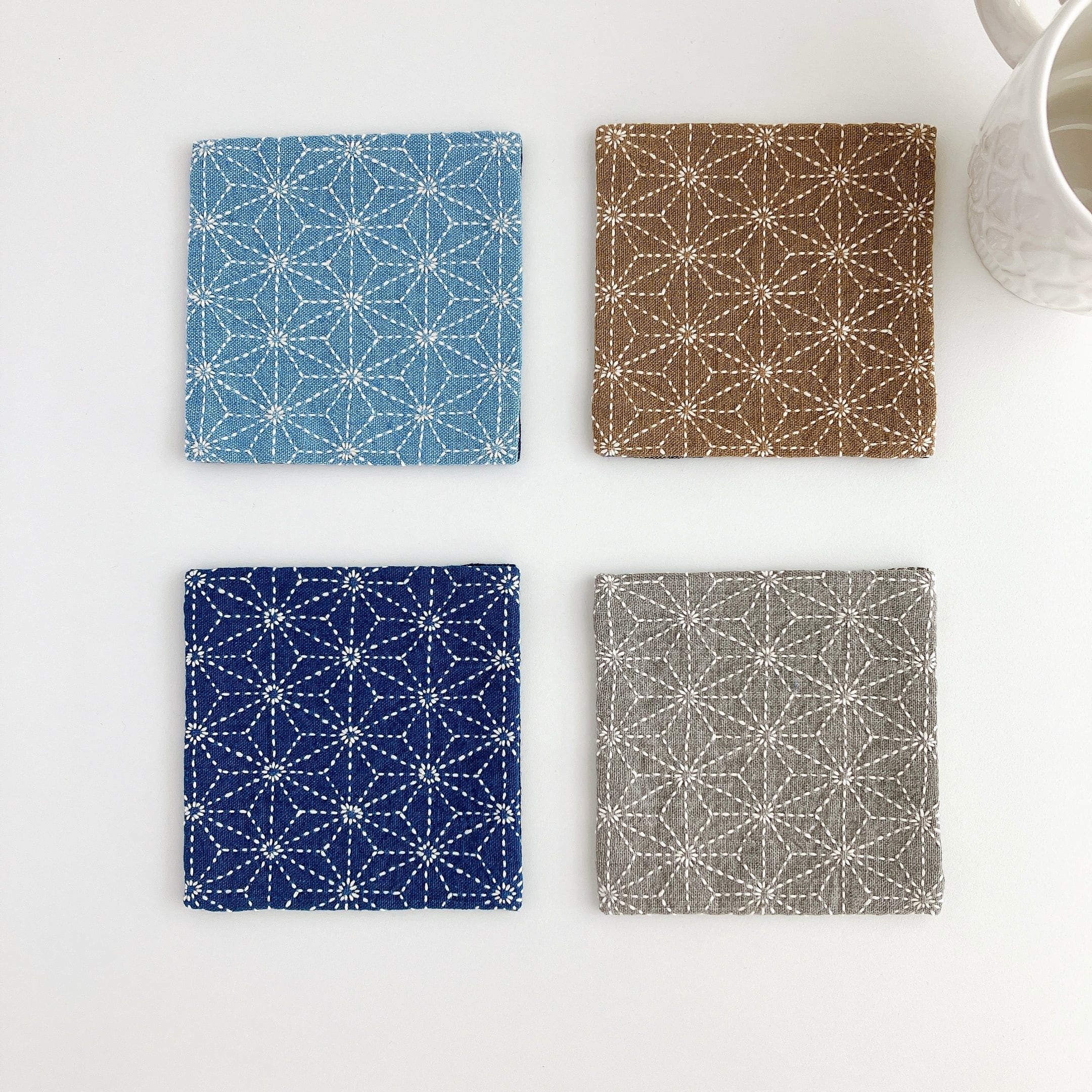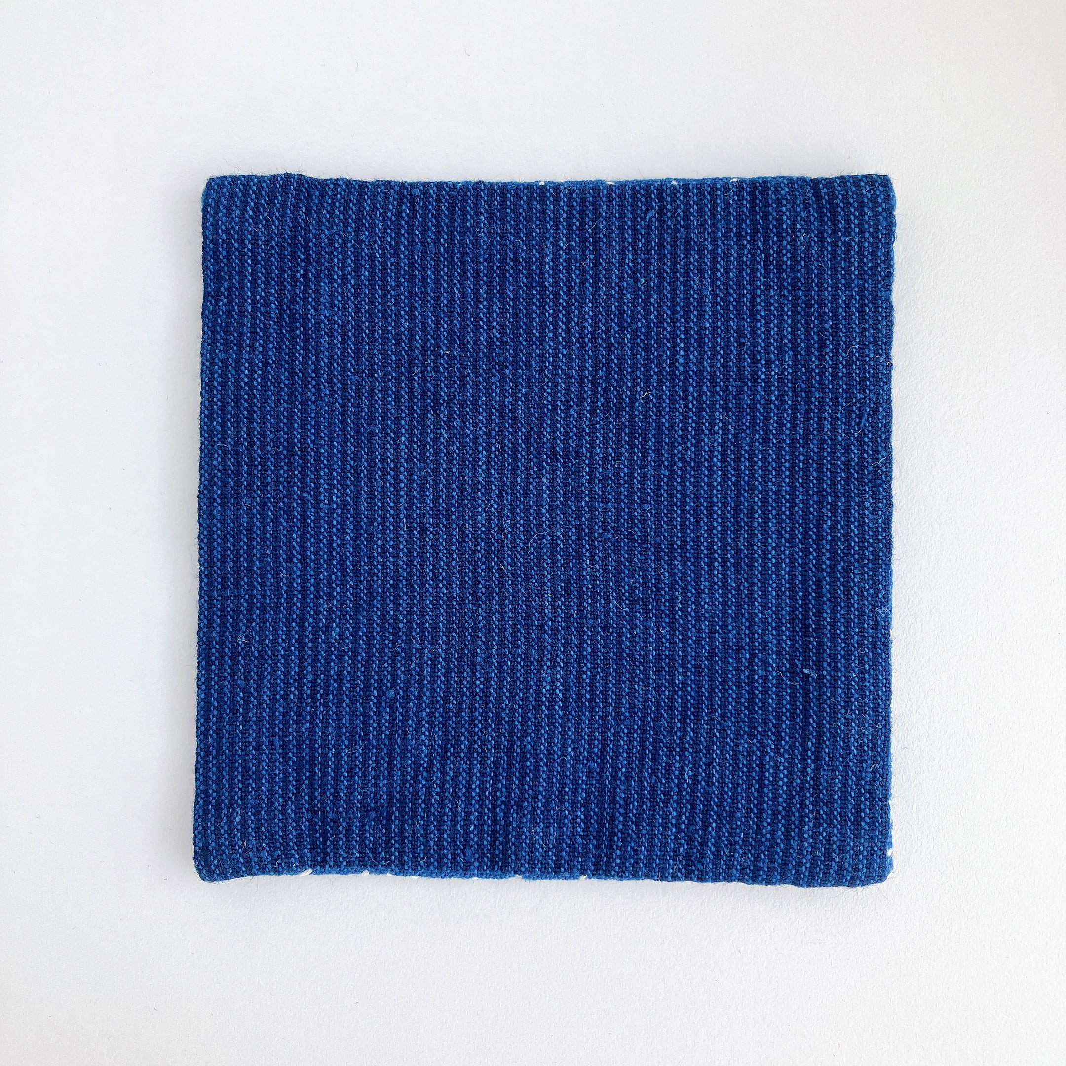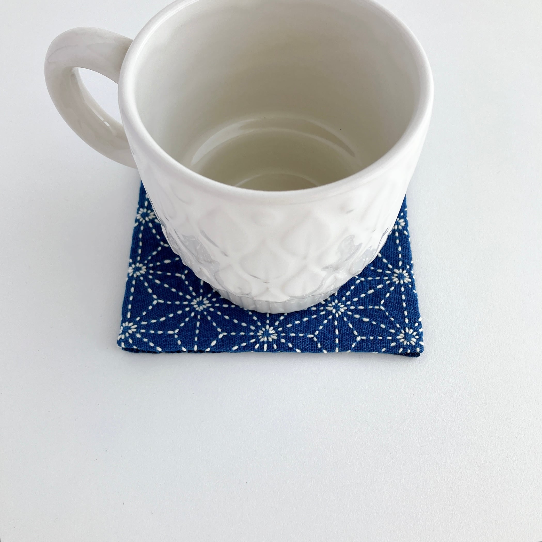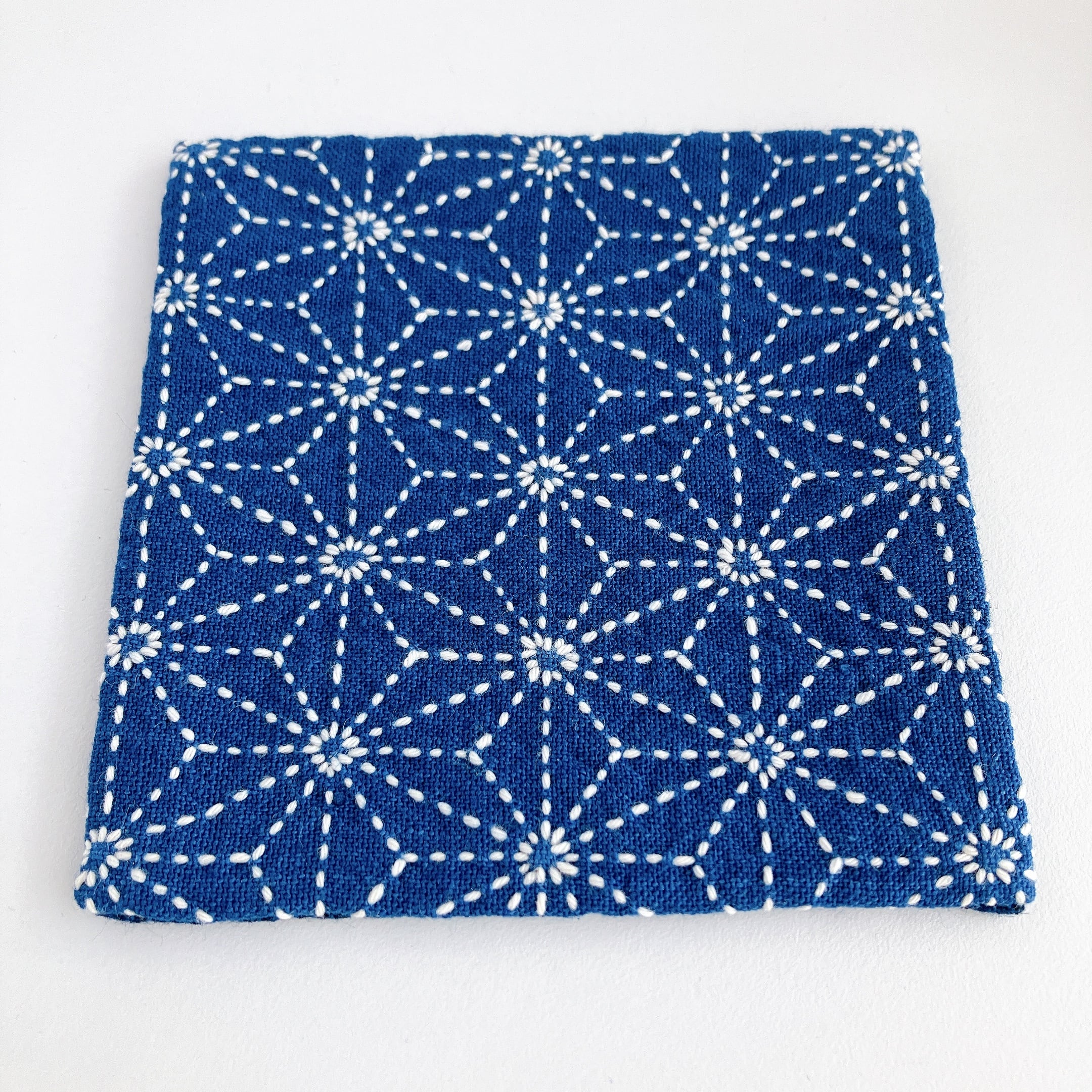 藍染の和木綿生地に刺し子をして、コースターを作りました。