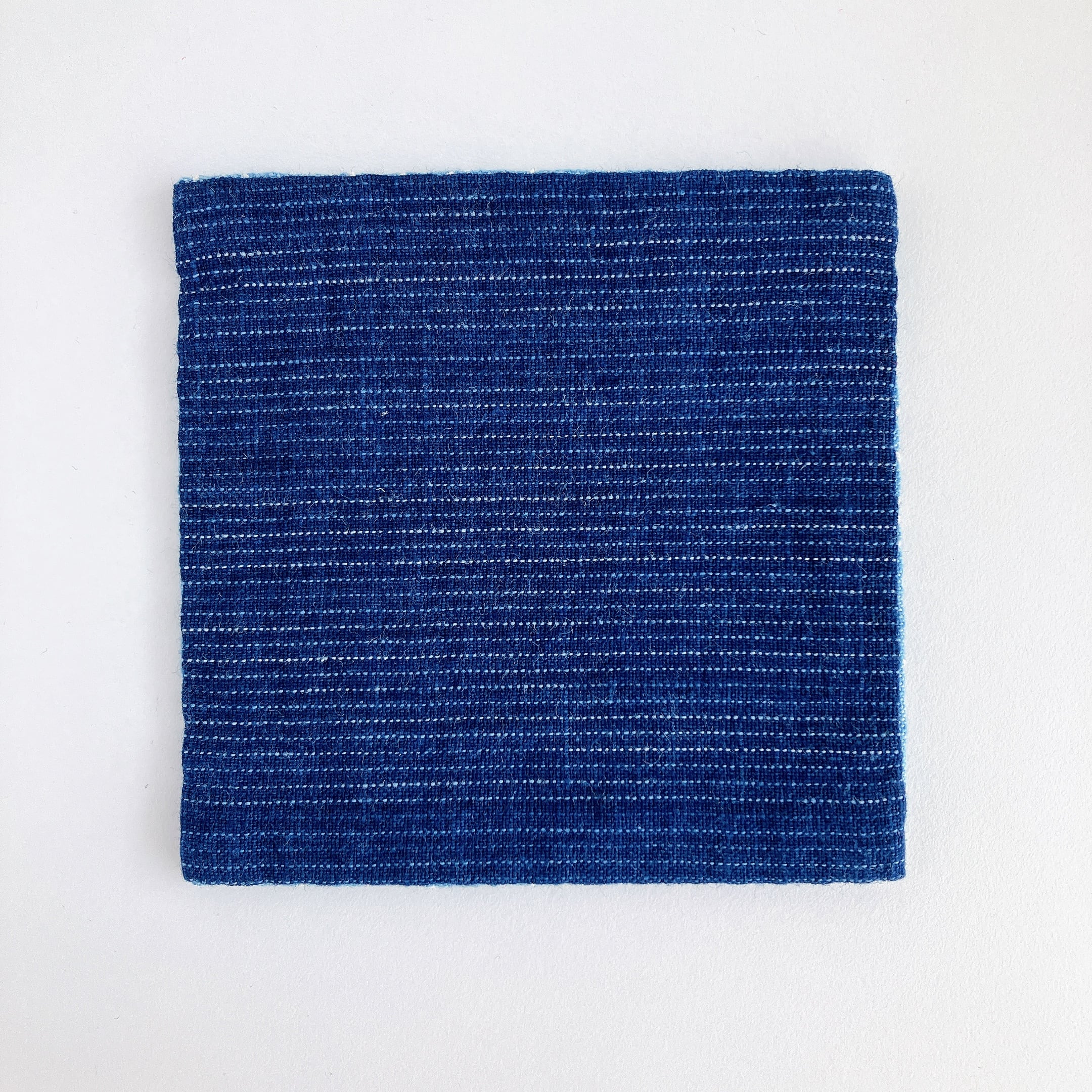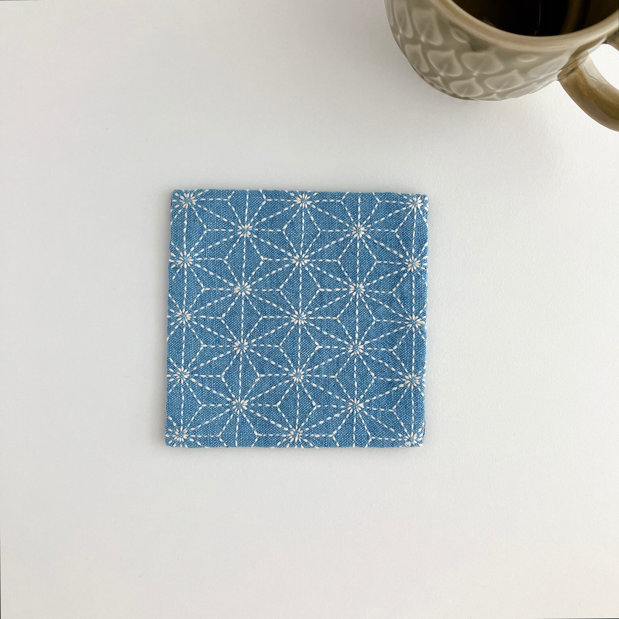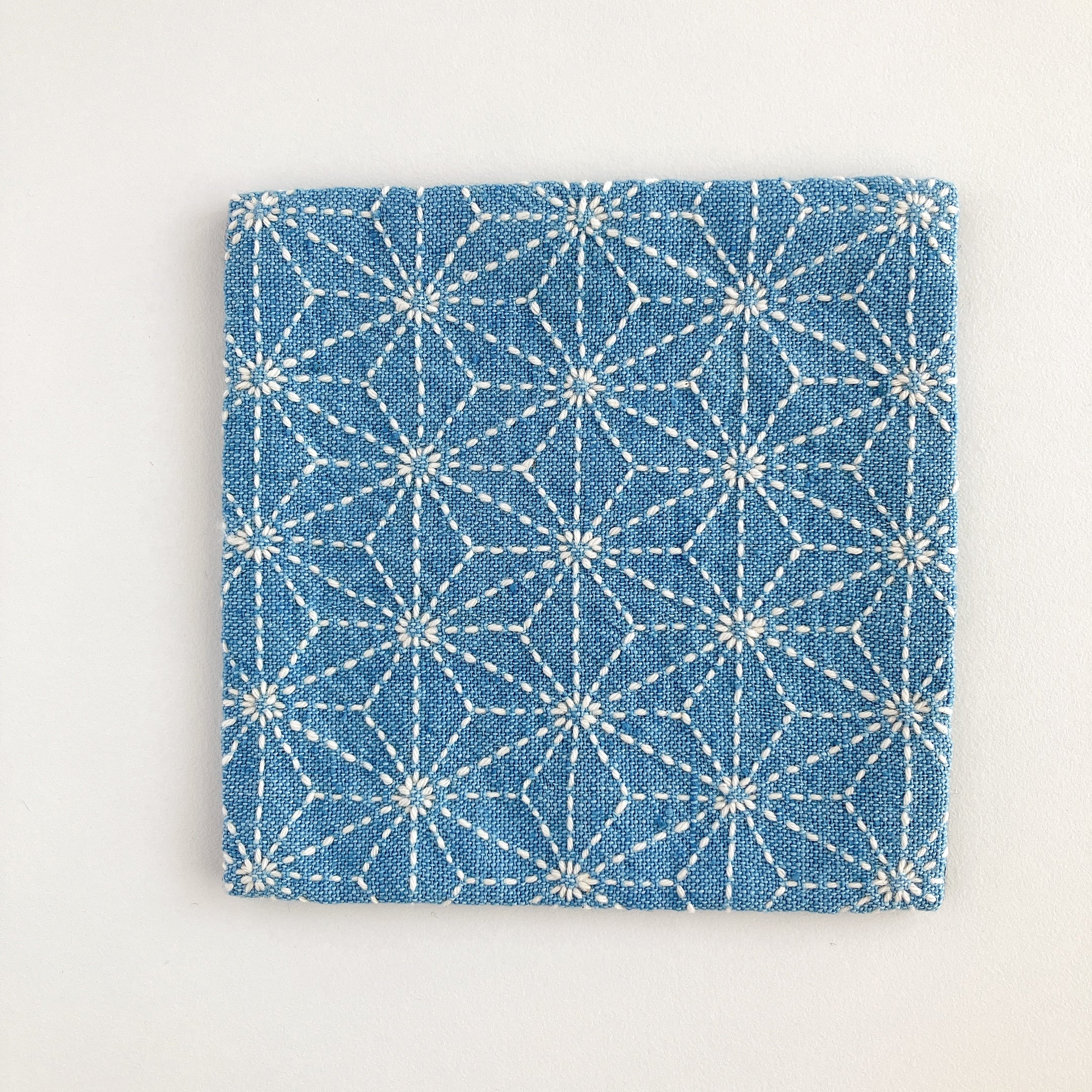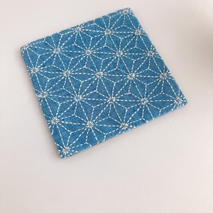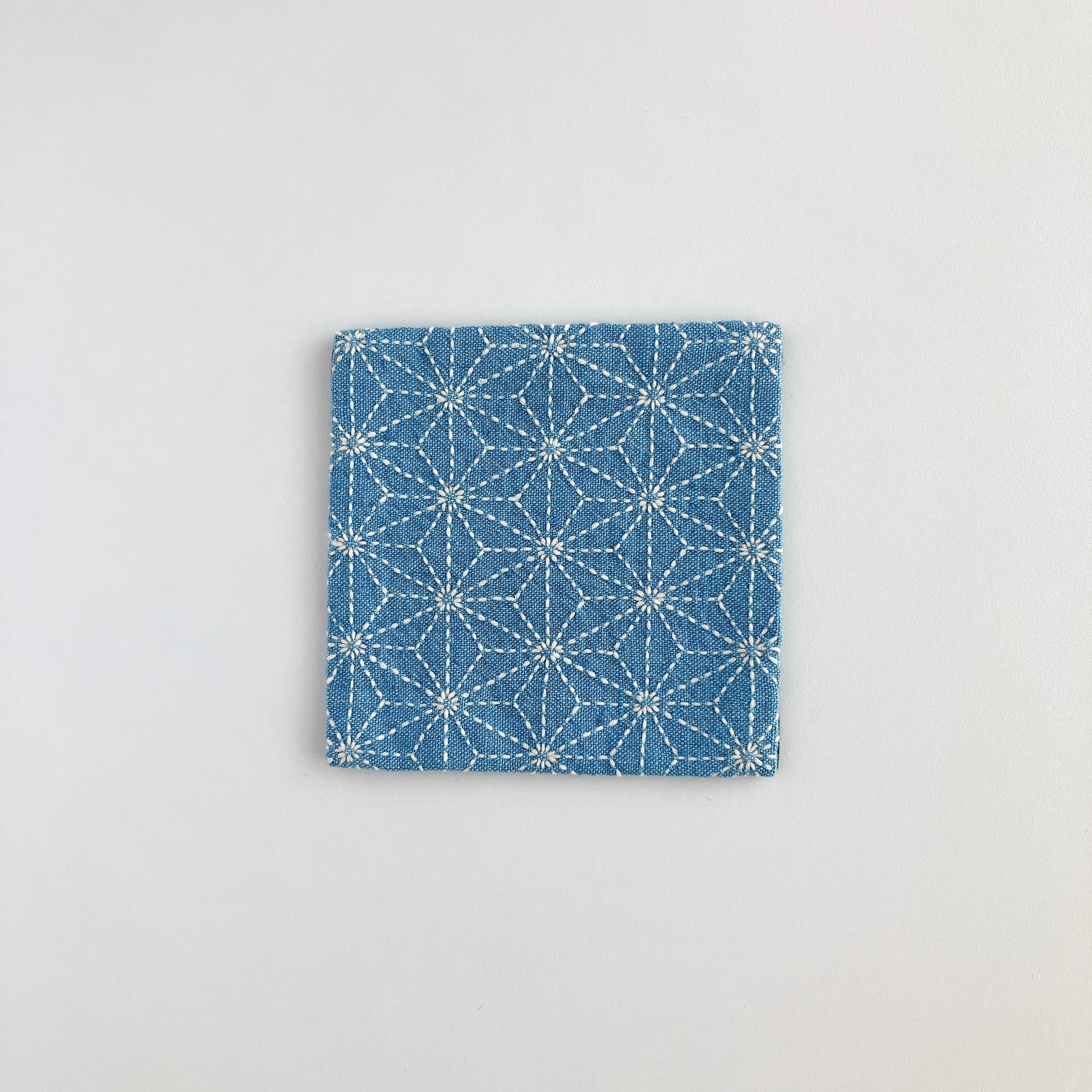 藍染(薄藍色です)の和木綿生地に刺し子をして、コースターを作りました。