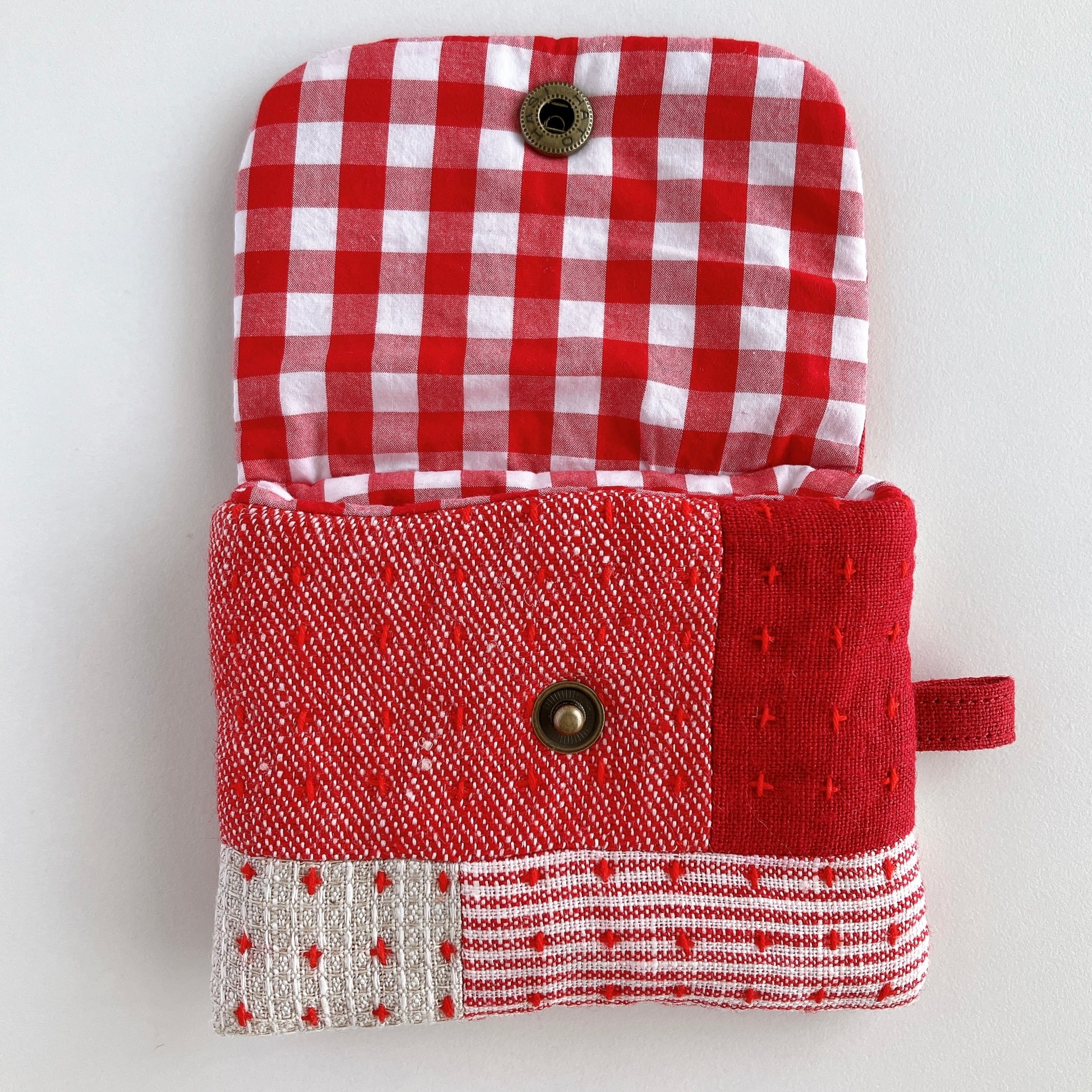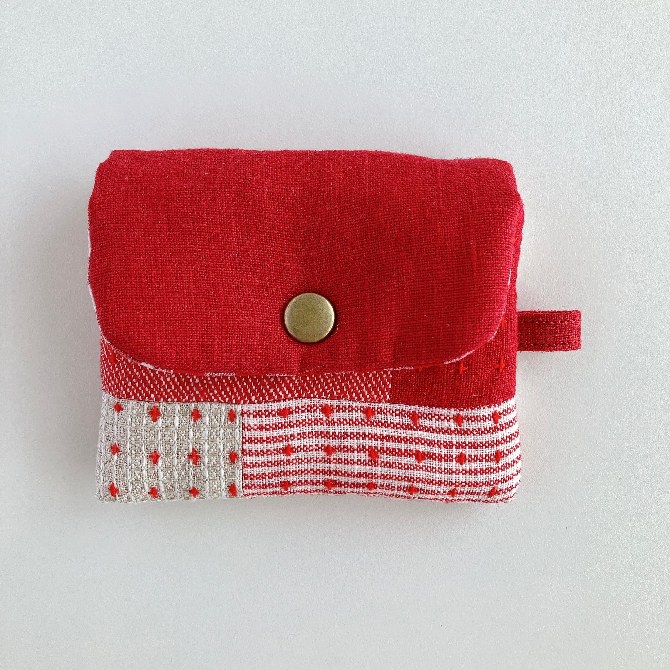 リネン生地を繋ぎ合わせた布に、小さな十字模様の刺し子をして作った、フラップポーチです。