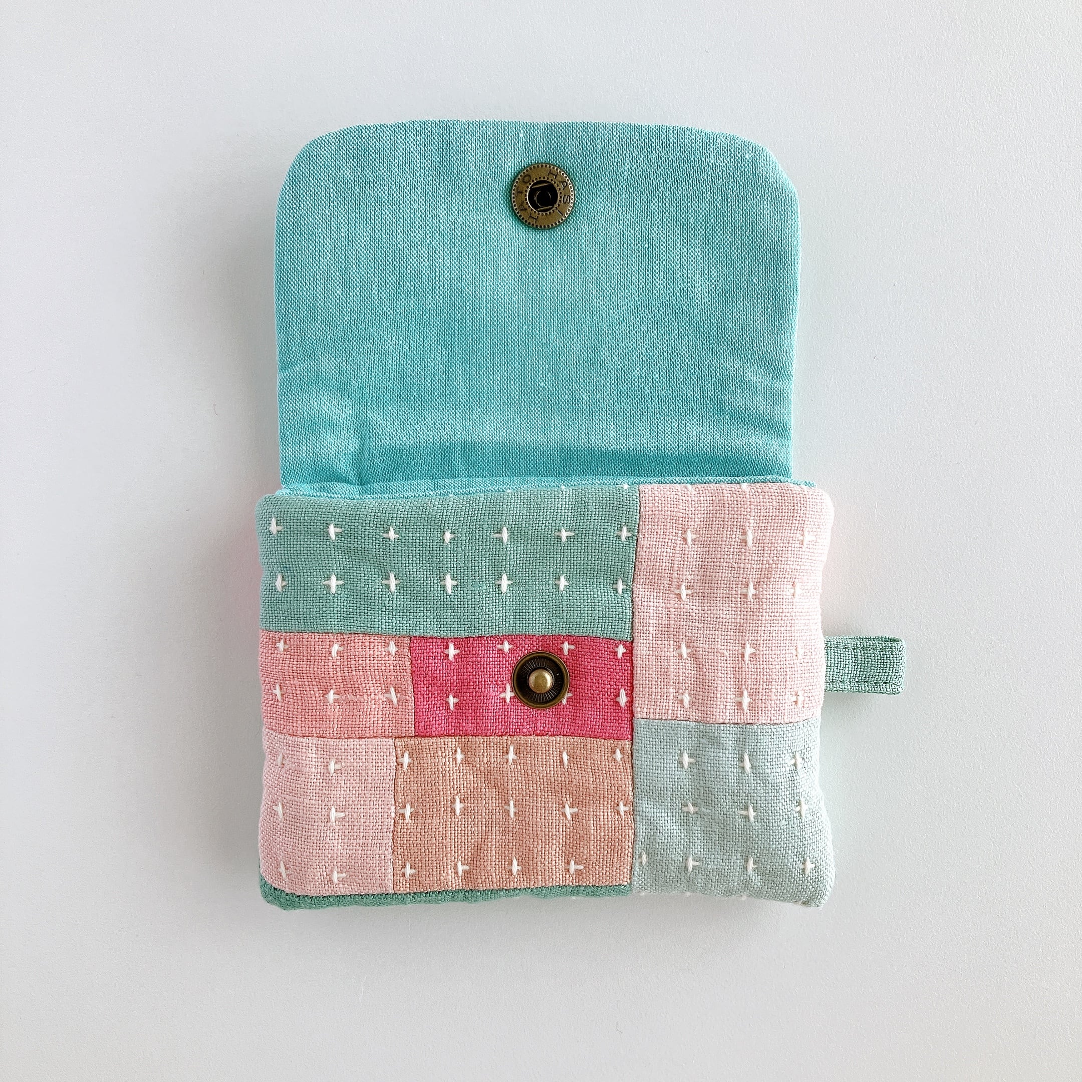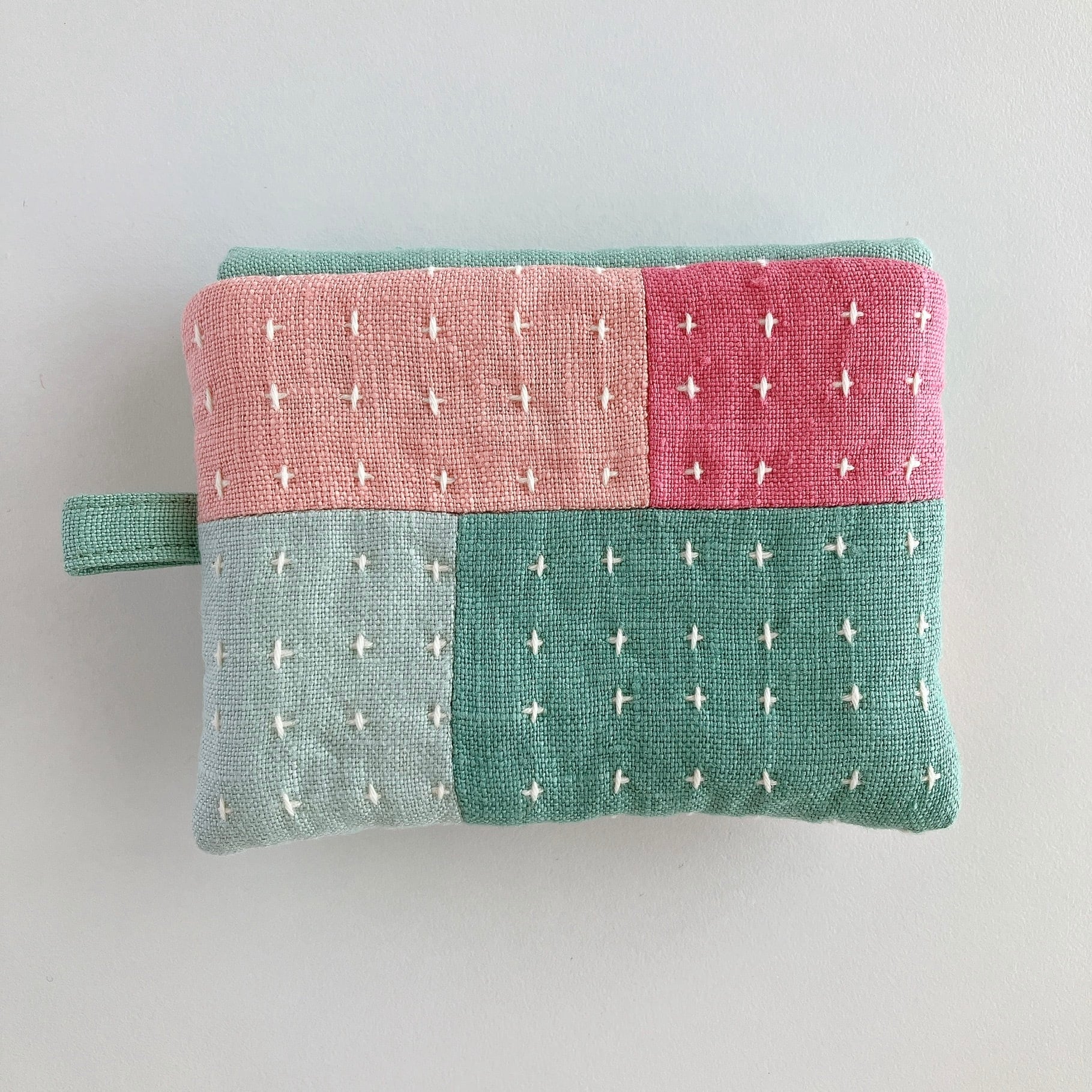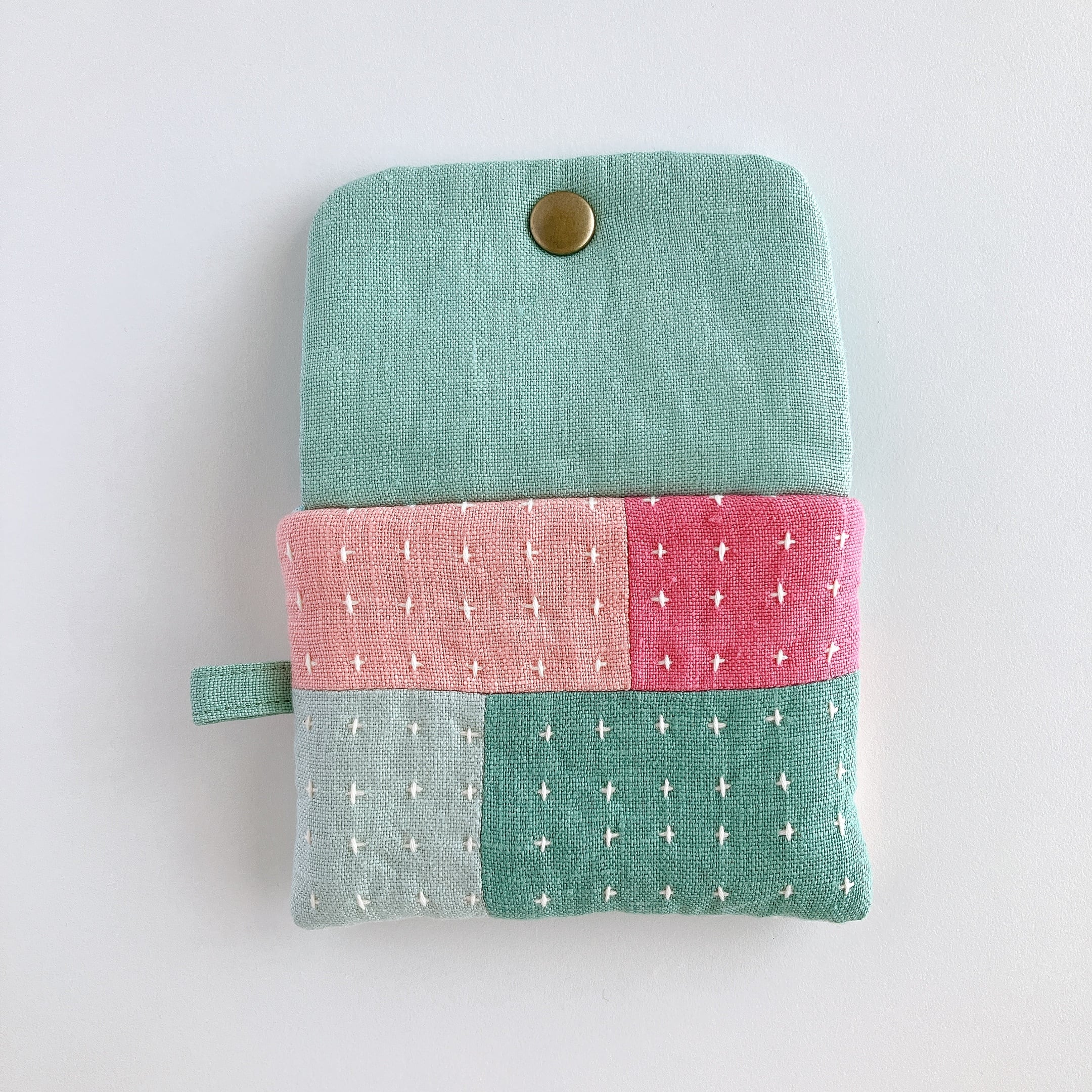 リネン生地を繋ぎ合わせた布に、小さな十字模様の刺し子をして作った、フラップポーチです。