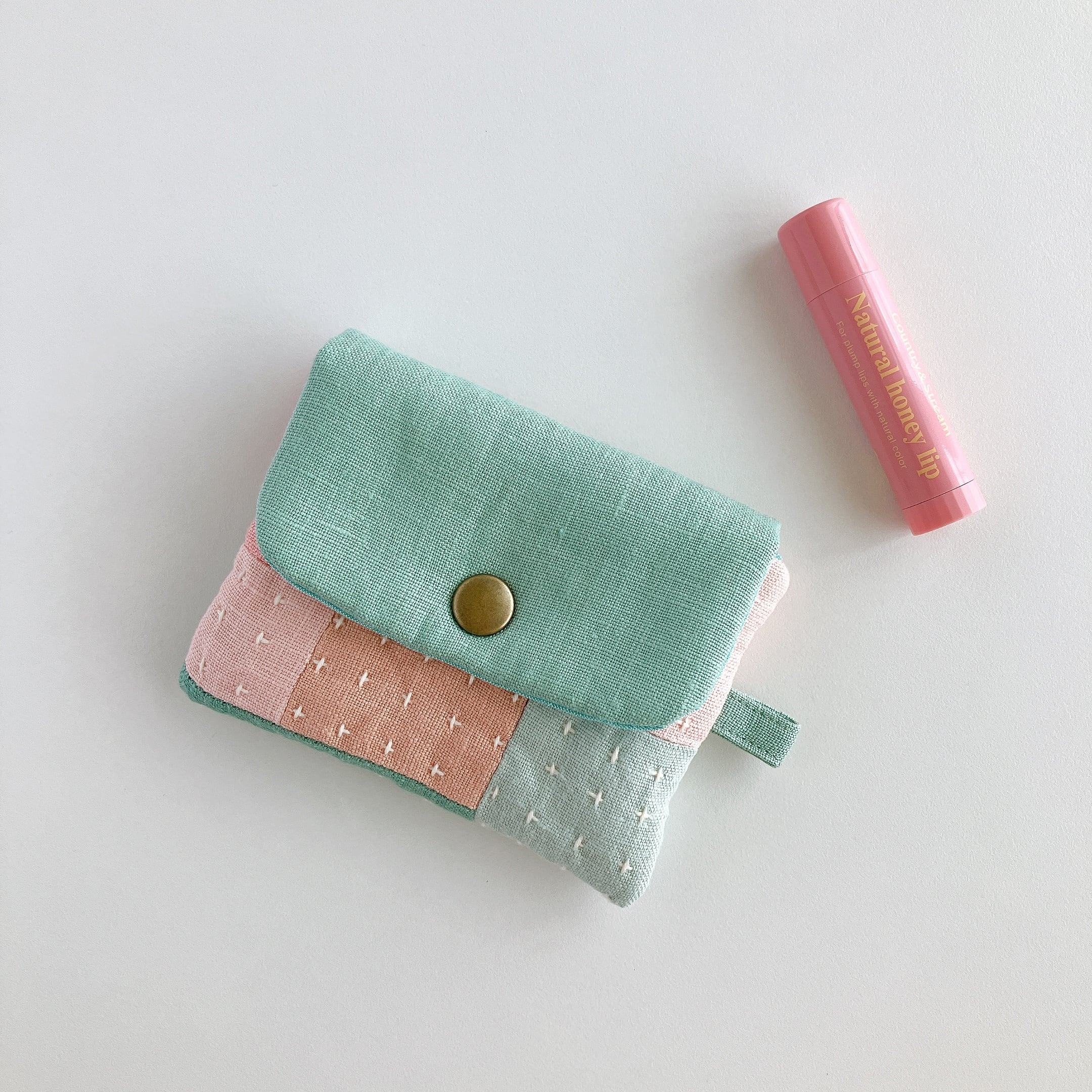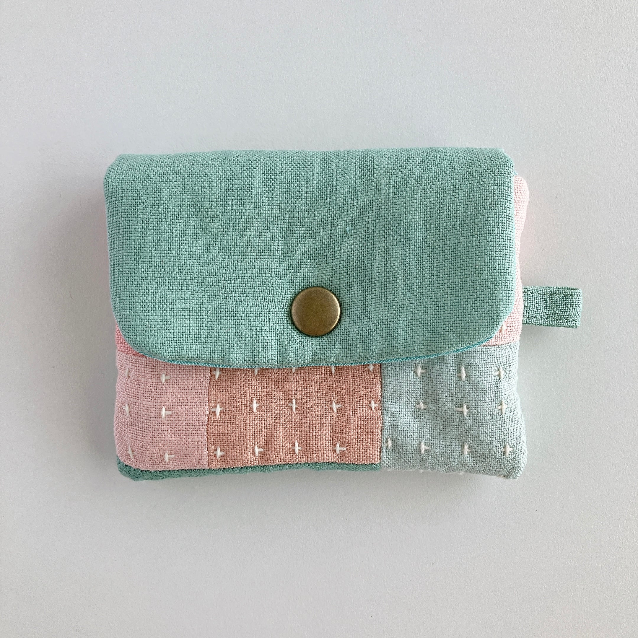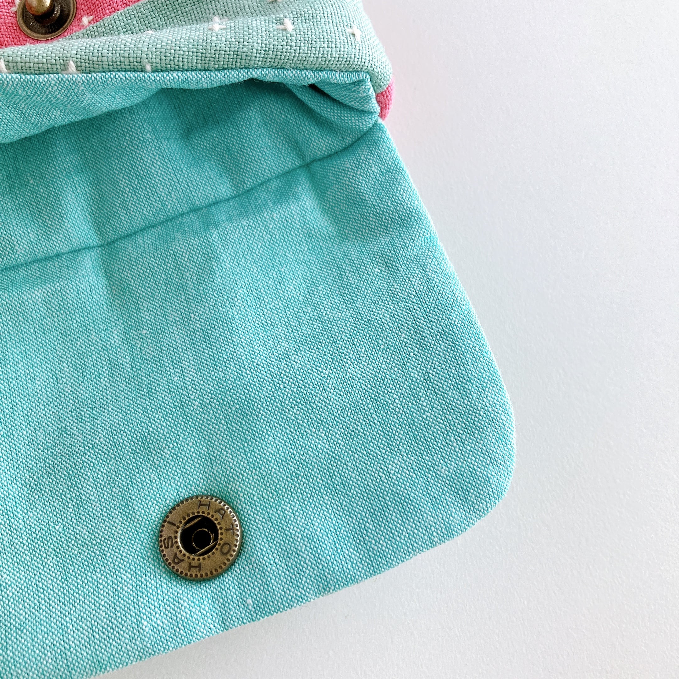 リネン生地を繋ぎ合わせた布に、小さな十字模様の刺し子をして作った、フラップポーチです。