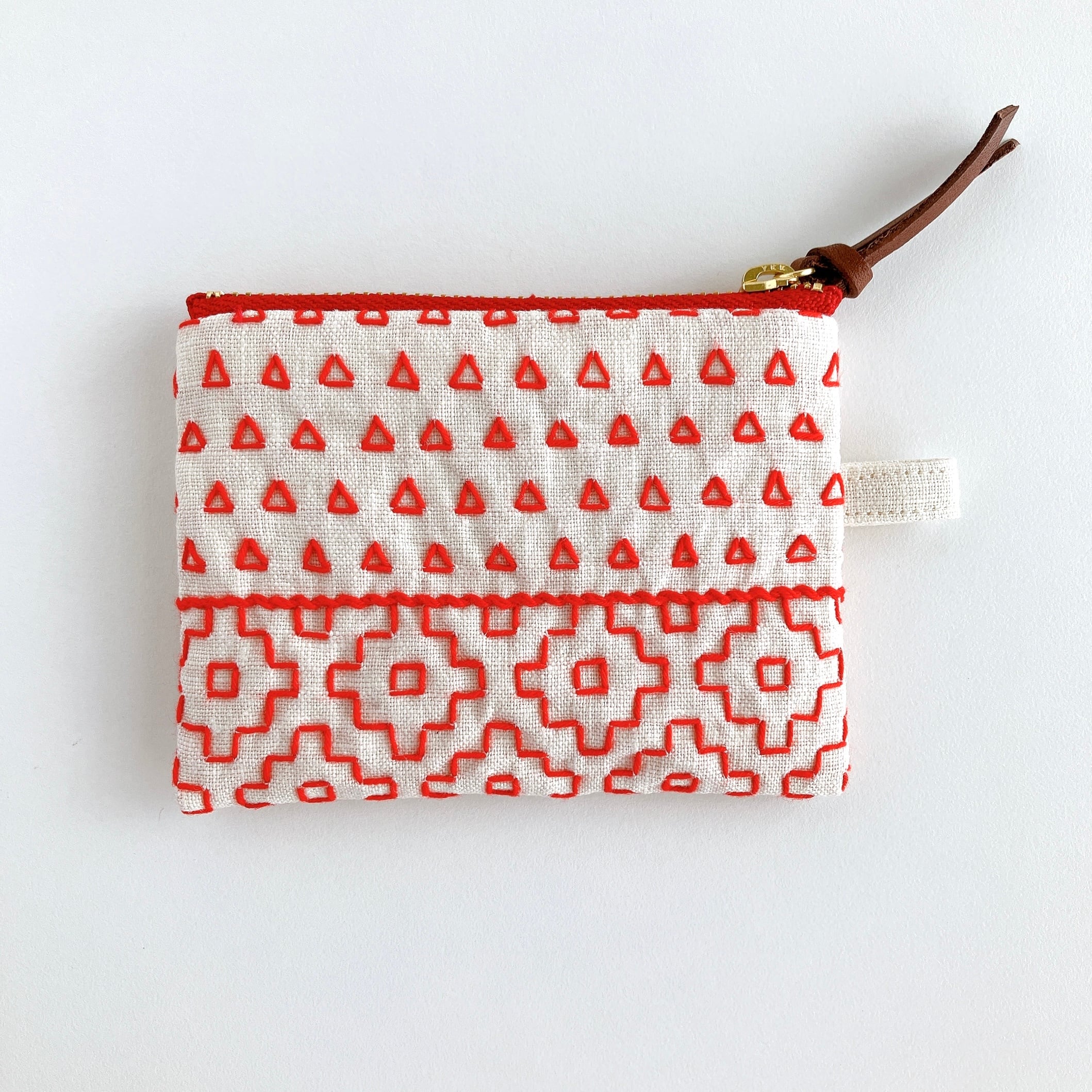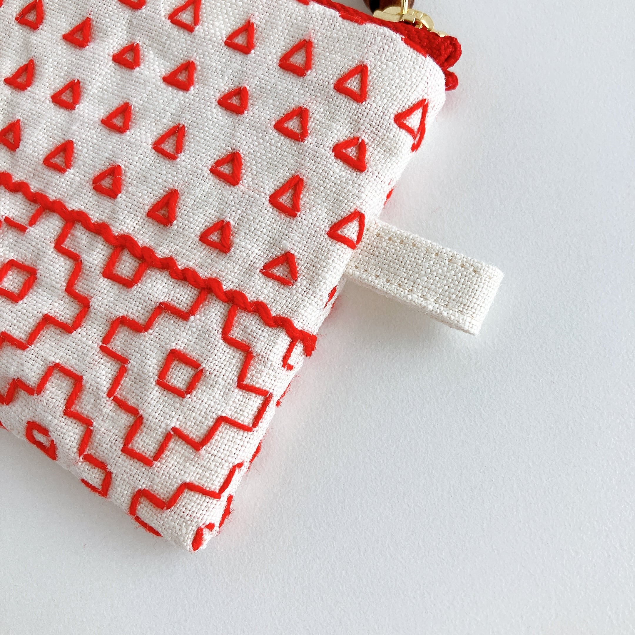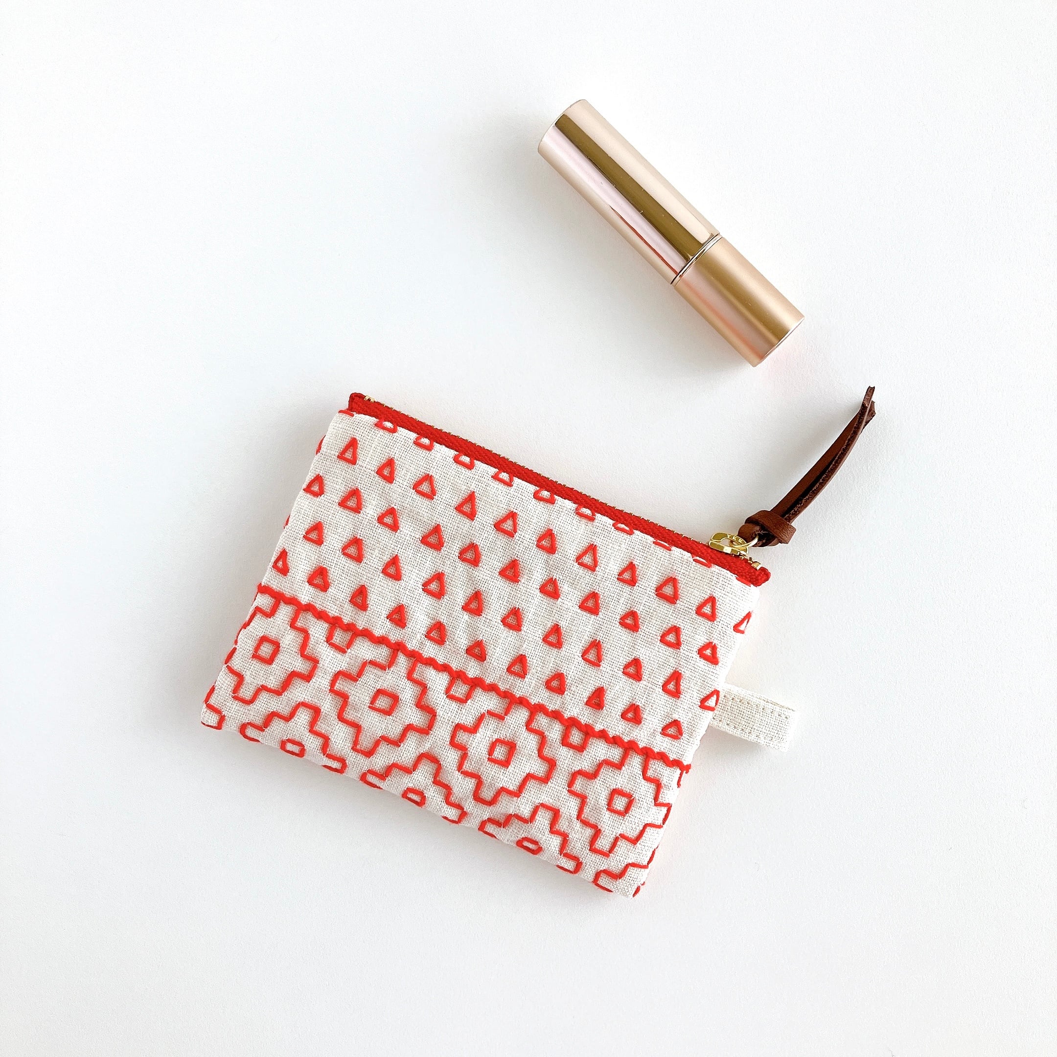 アイボリー色のリネン生地に刺し子をして作った、小さなファスナーポーチです。