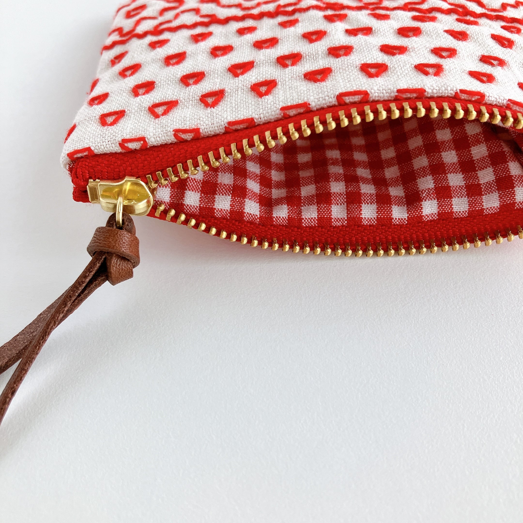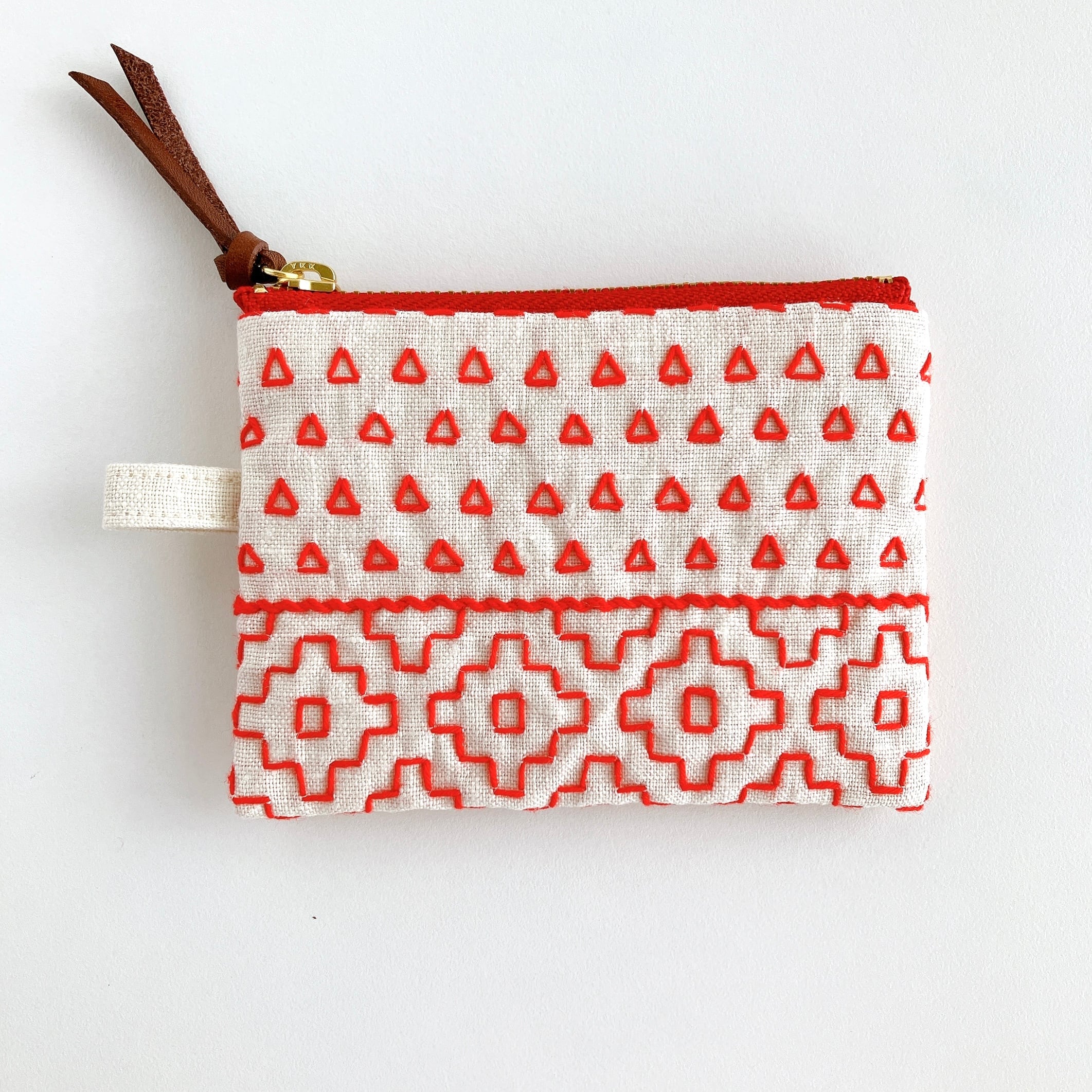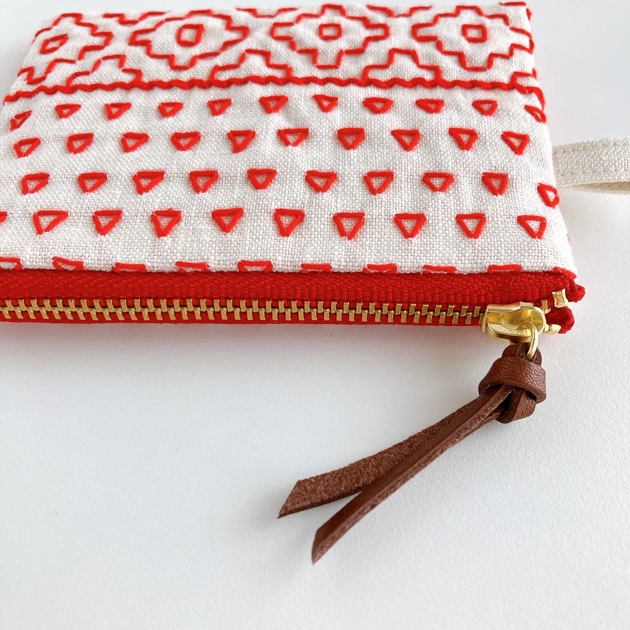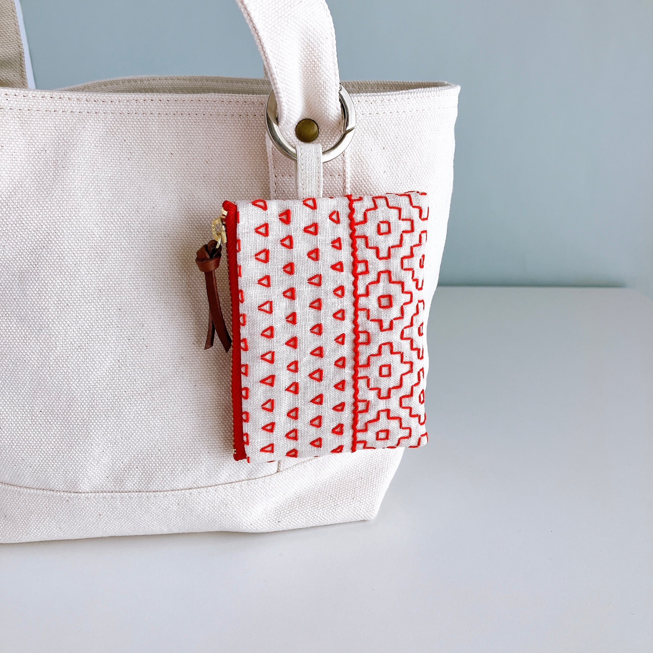 アイボリー色のリネン生地に刺し子をして作った、小さなファスナーポーチです。