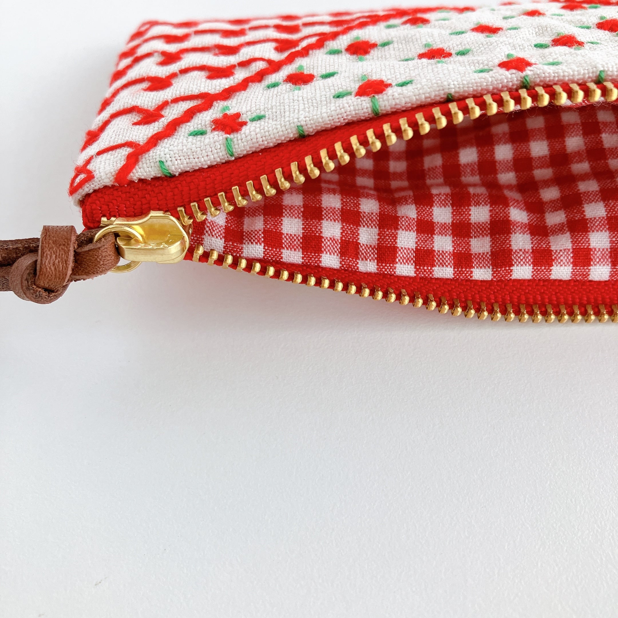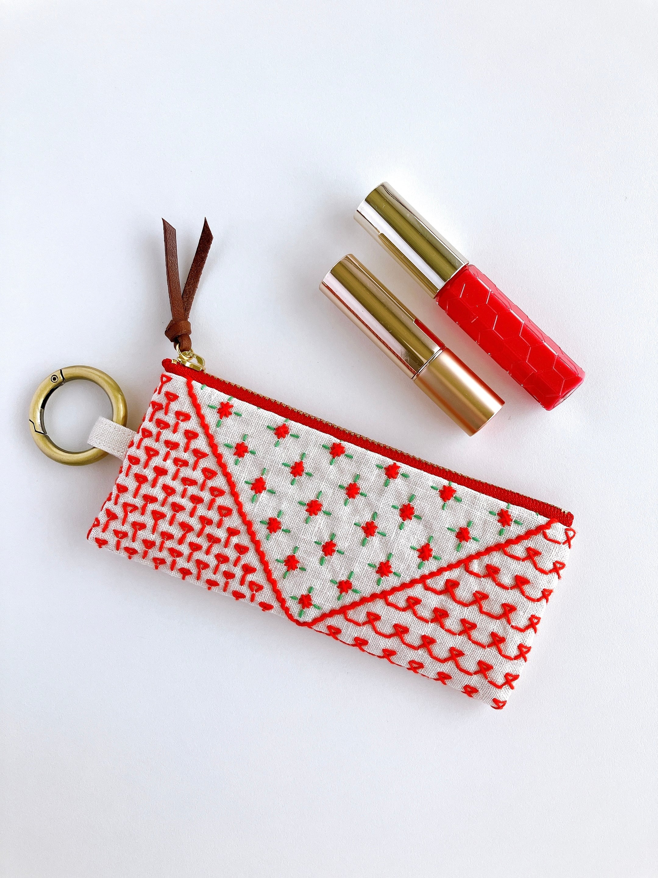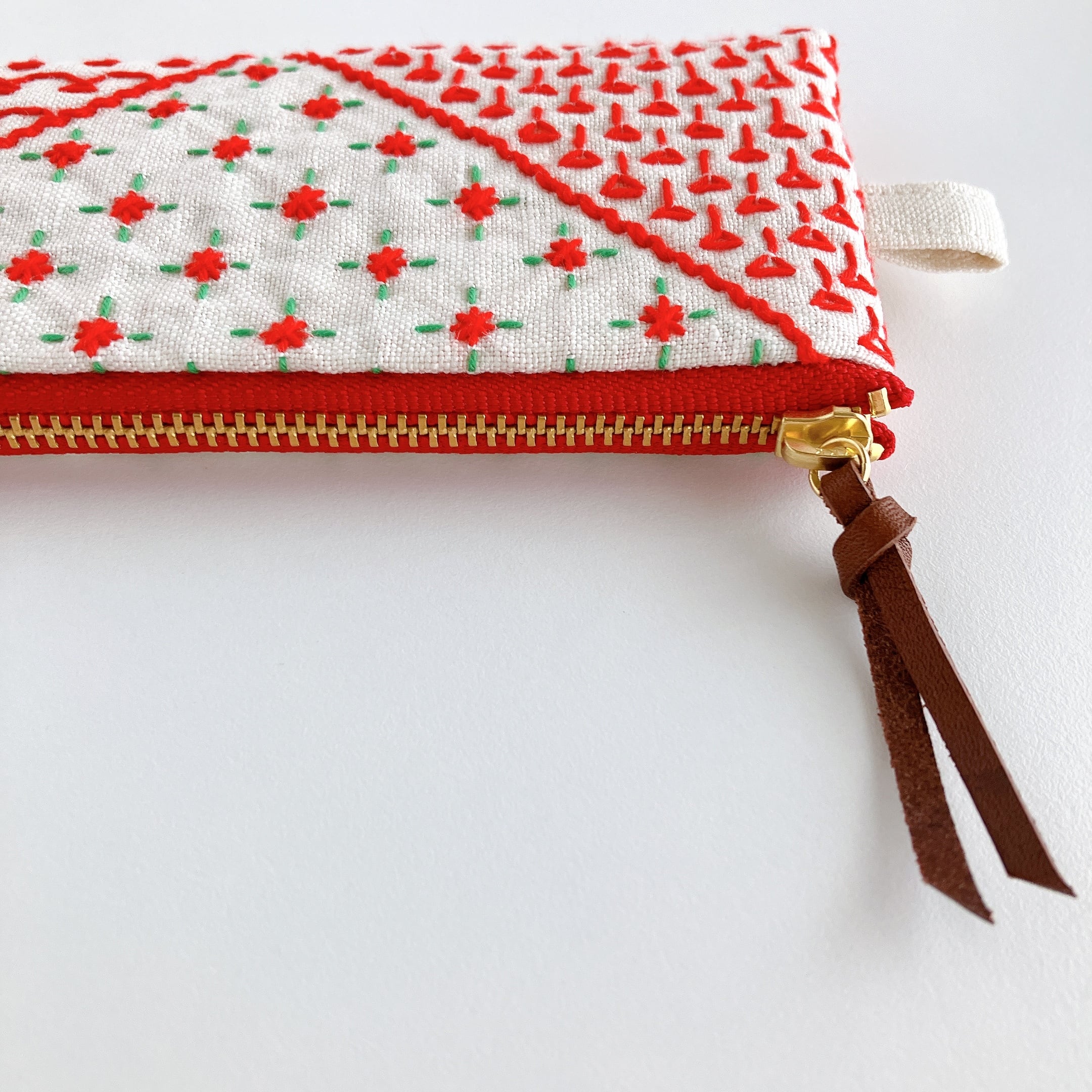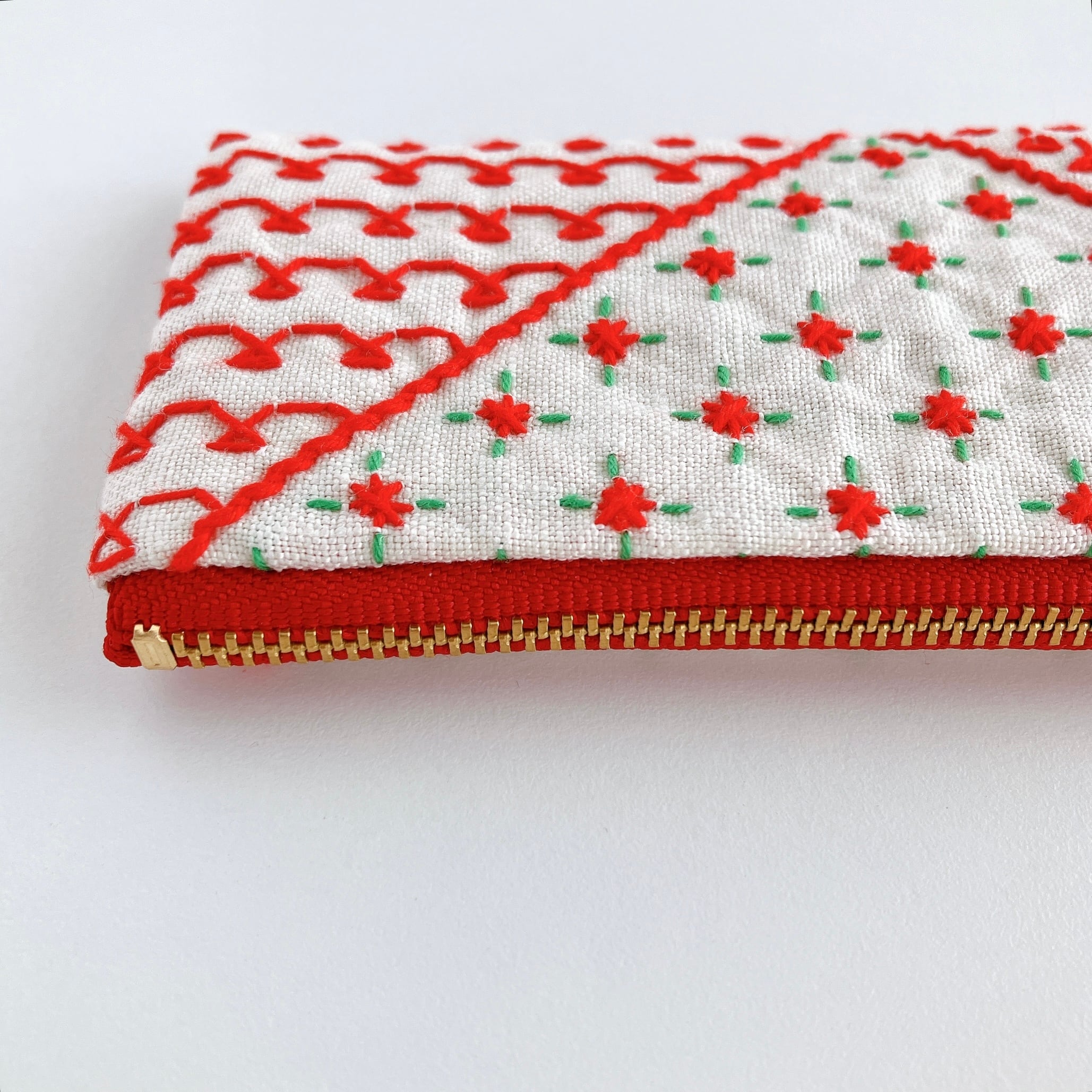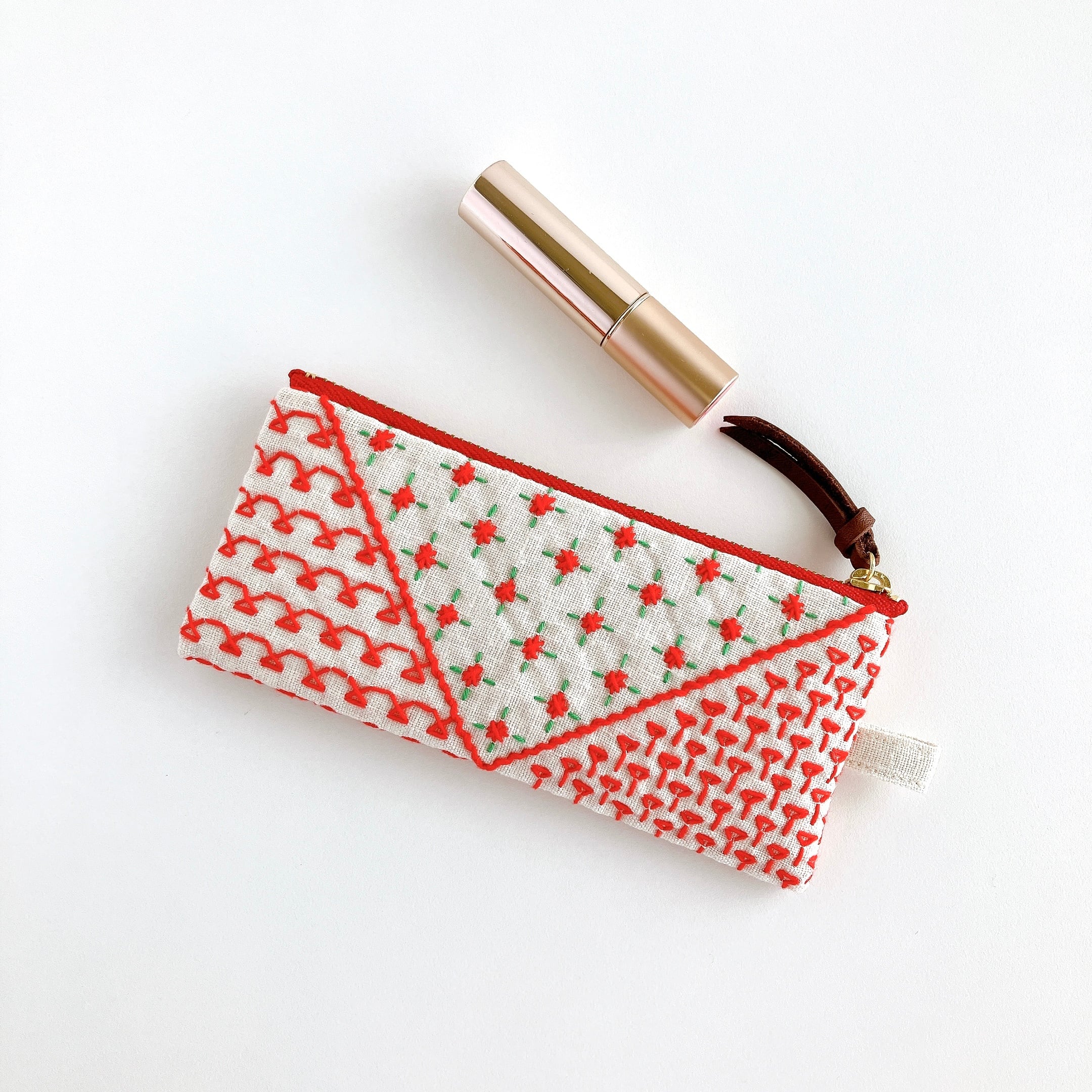 アイボリー色のリネン生地に刺し子をして作った、細長い形のファスナーポーチです。