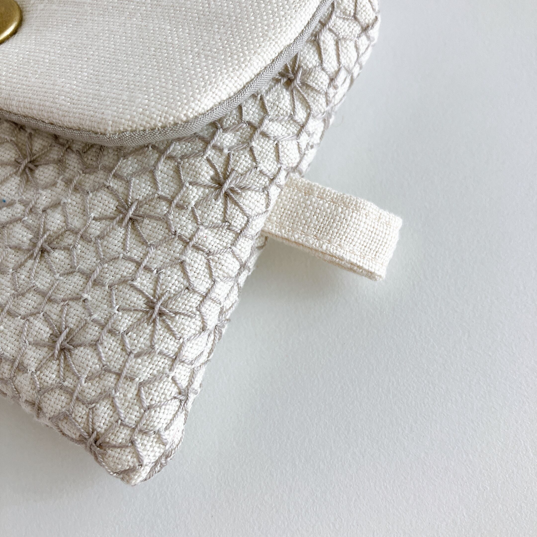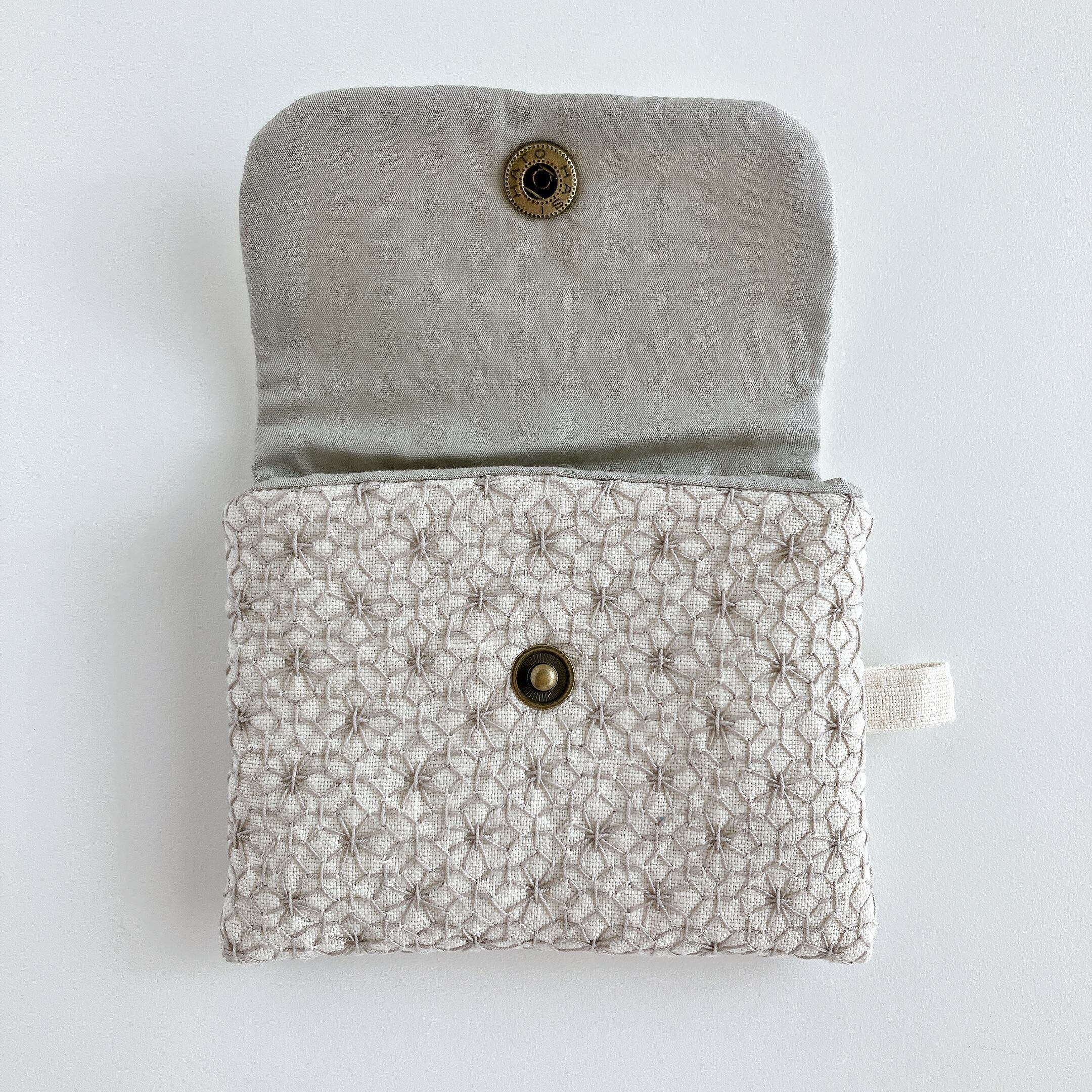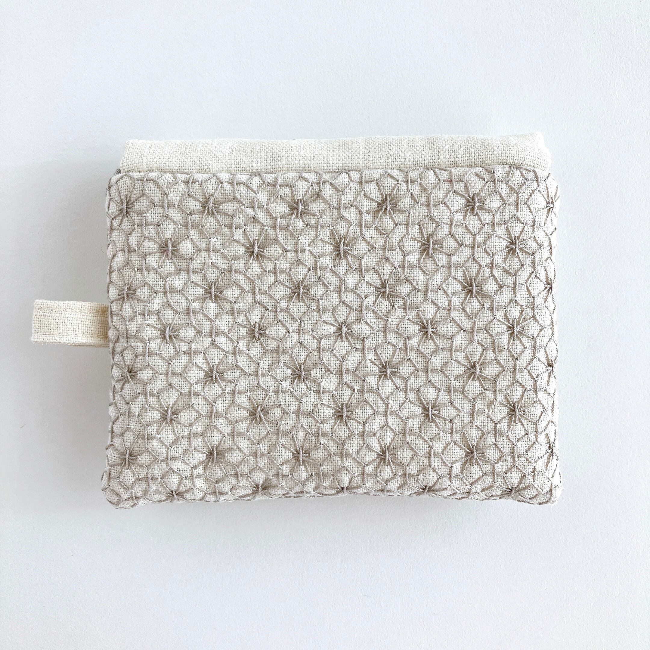 アイボリー色のリネン生地に、刺し子をして作った小さなフラップポーチです。
