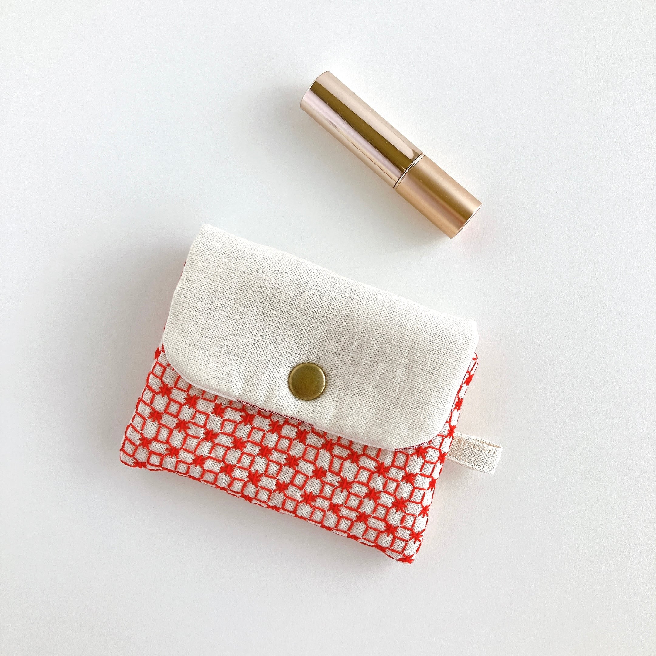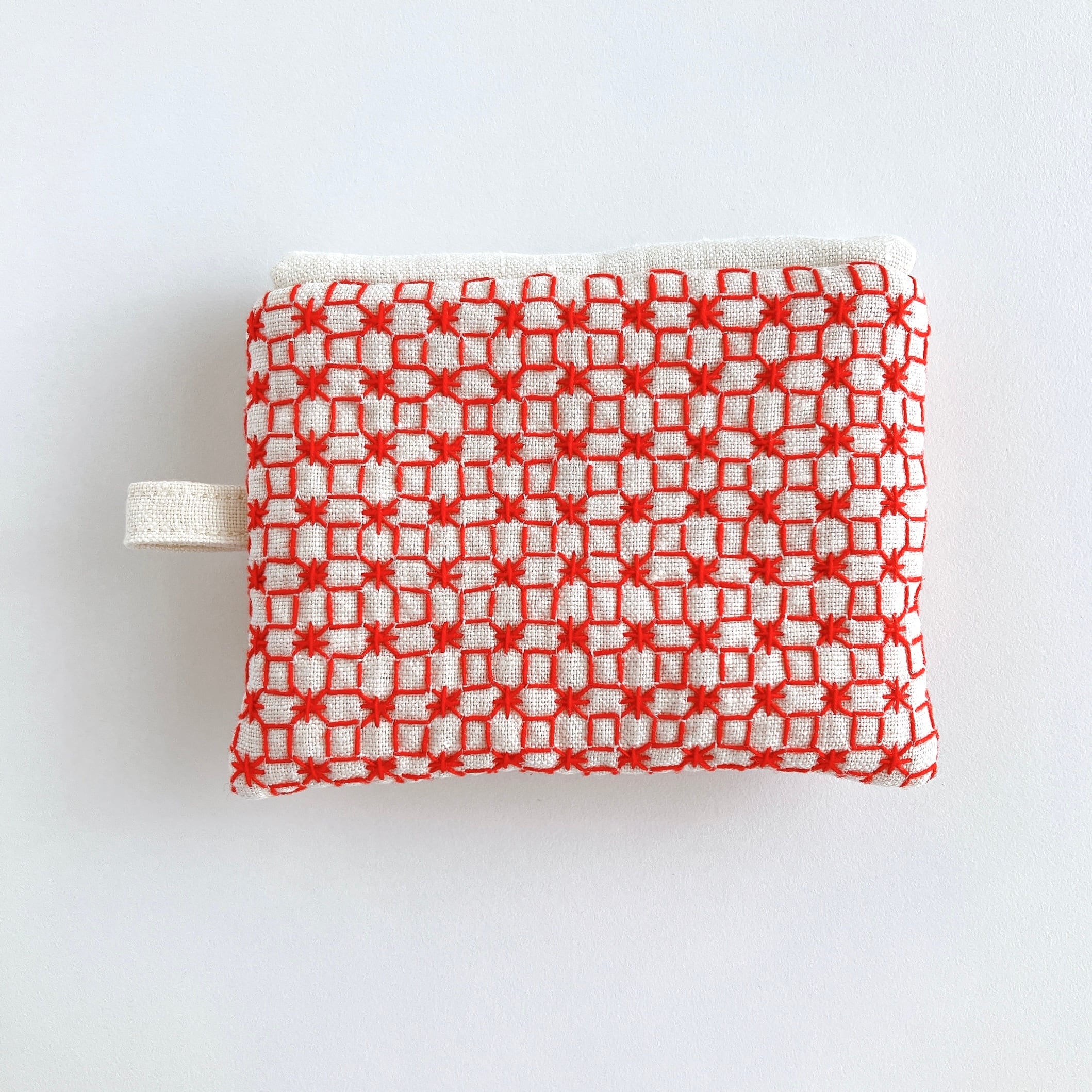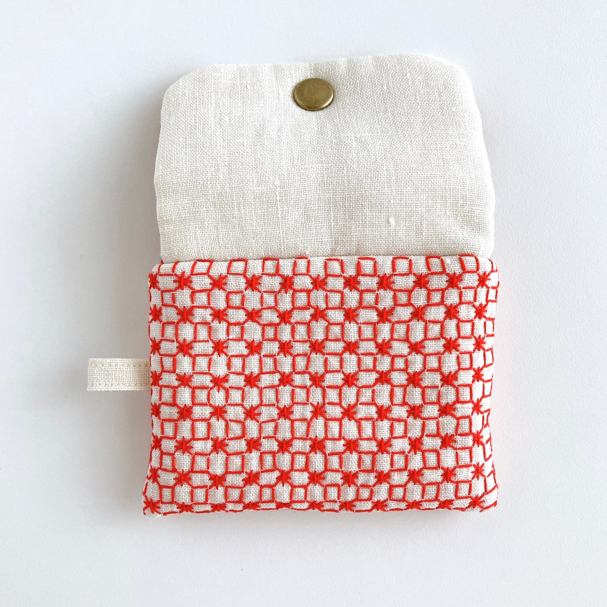 アイボリー色のリネン生地に、刺し子をして作った小さなフラップポーチです。