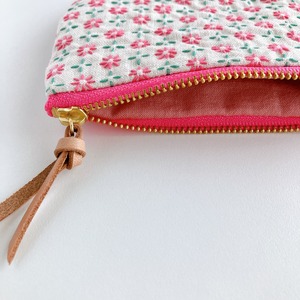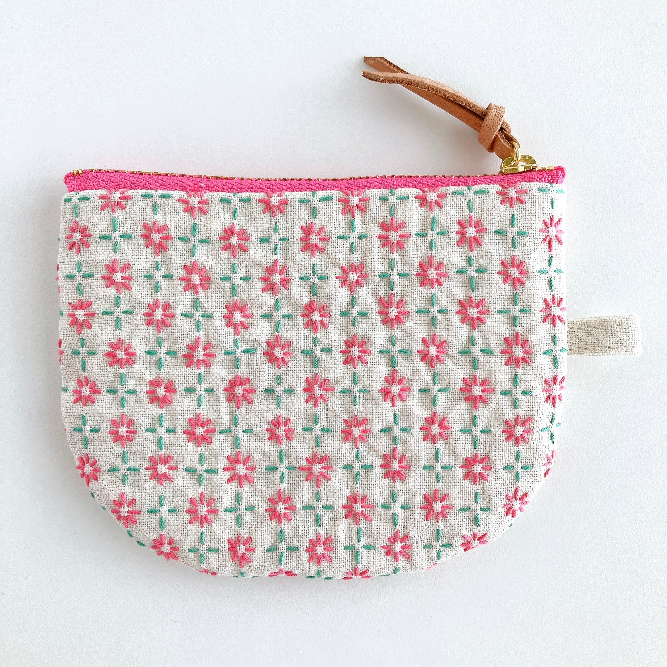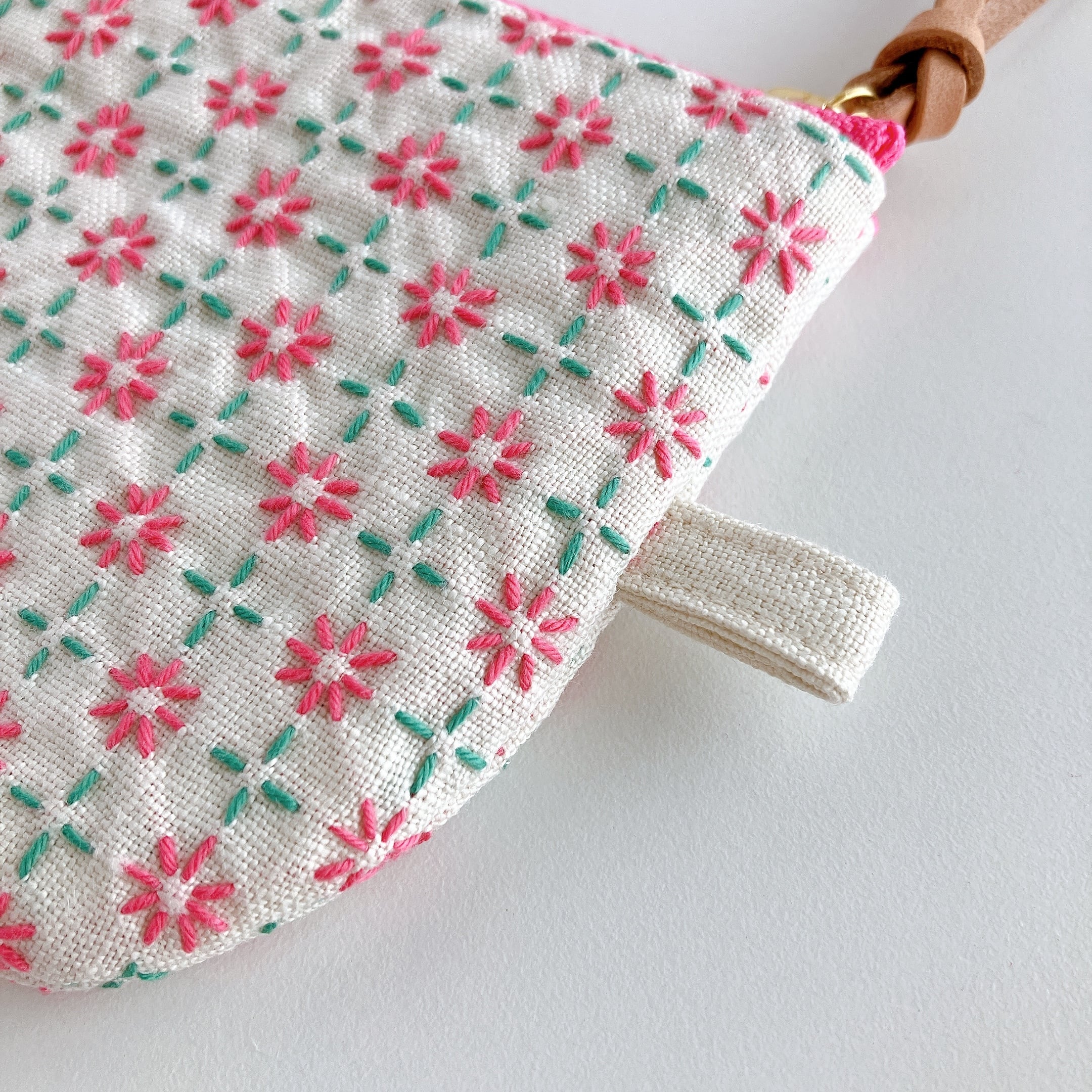 アイボリー色のリネン生地に、刺し子をして作ったファスナーポーチです。