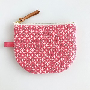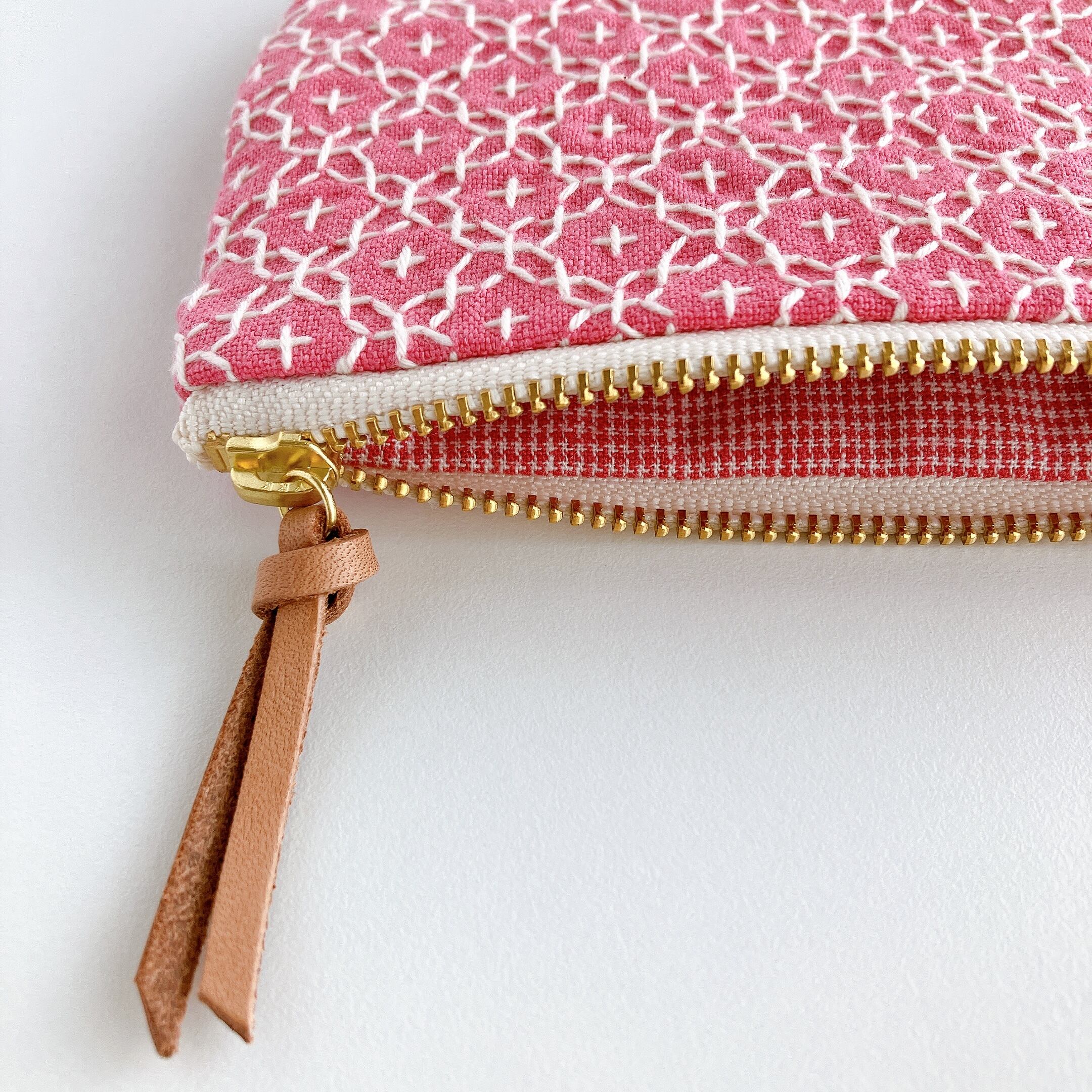 ピンク色のリネン生地に、刺し子をして作ったファスナーポーチです。