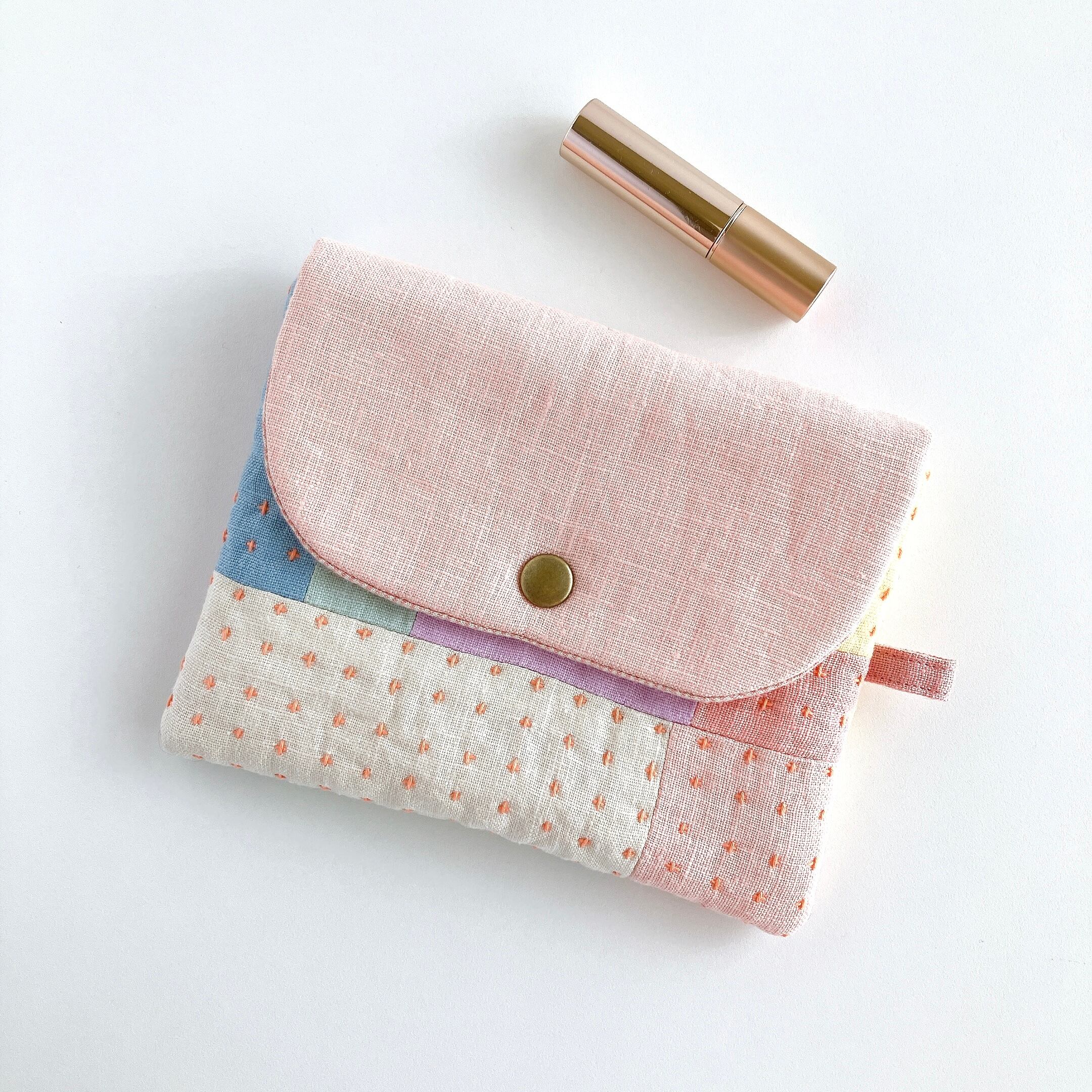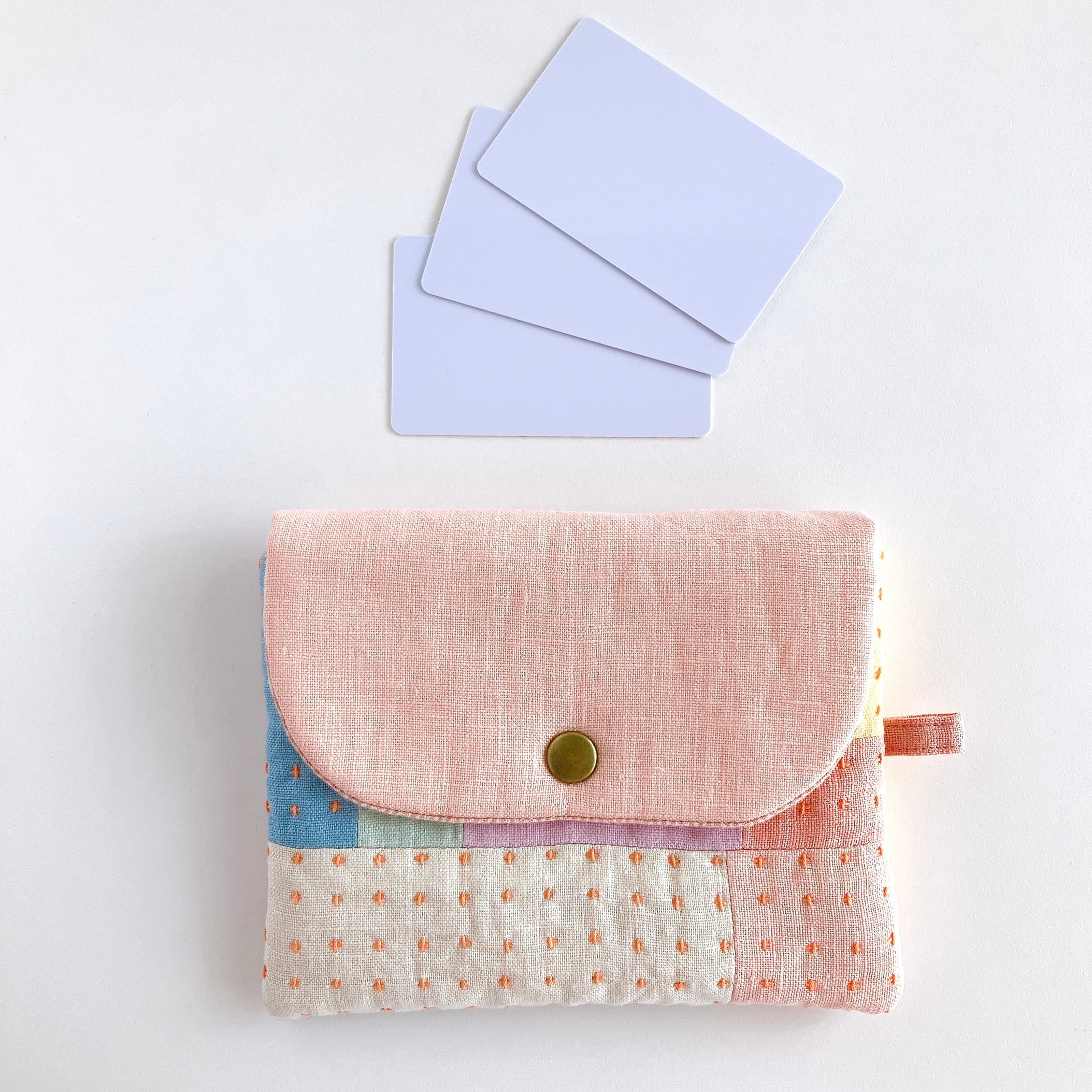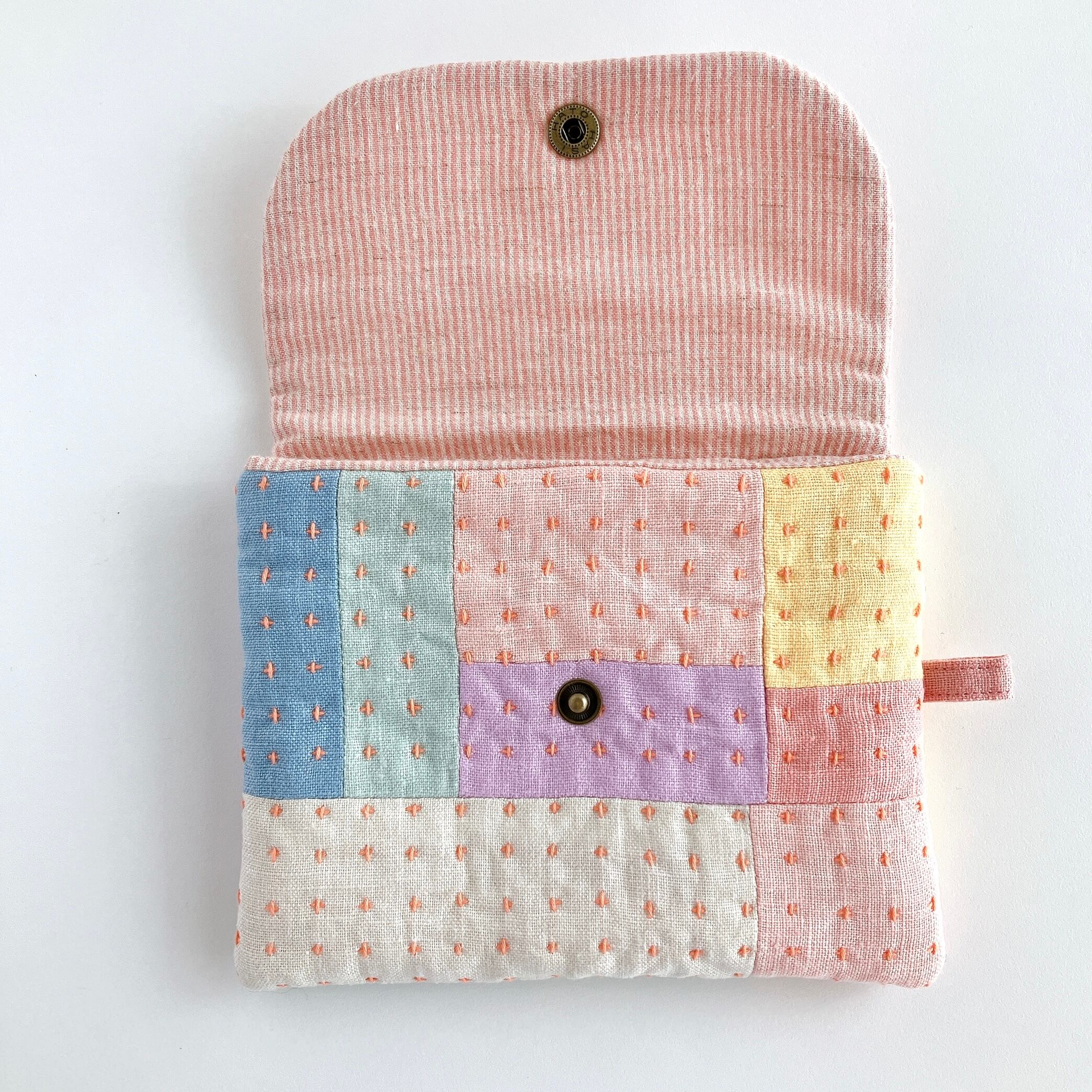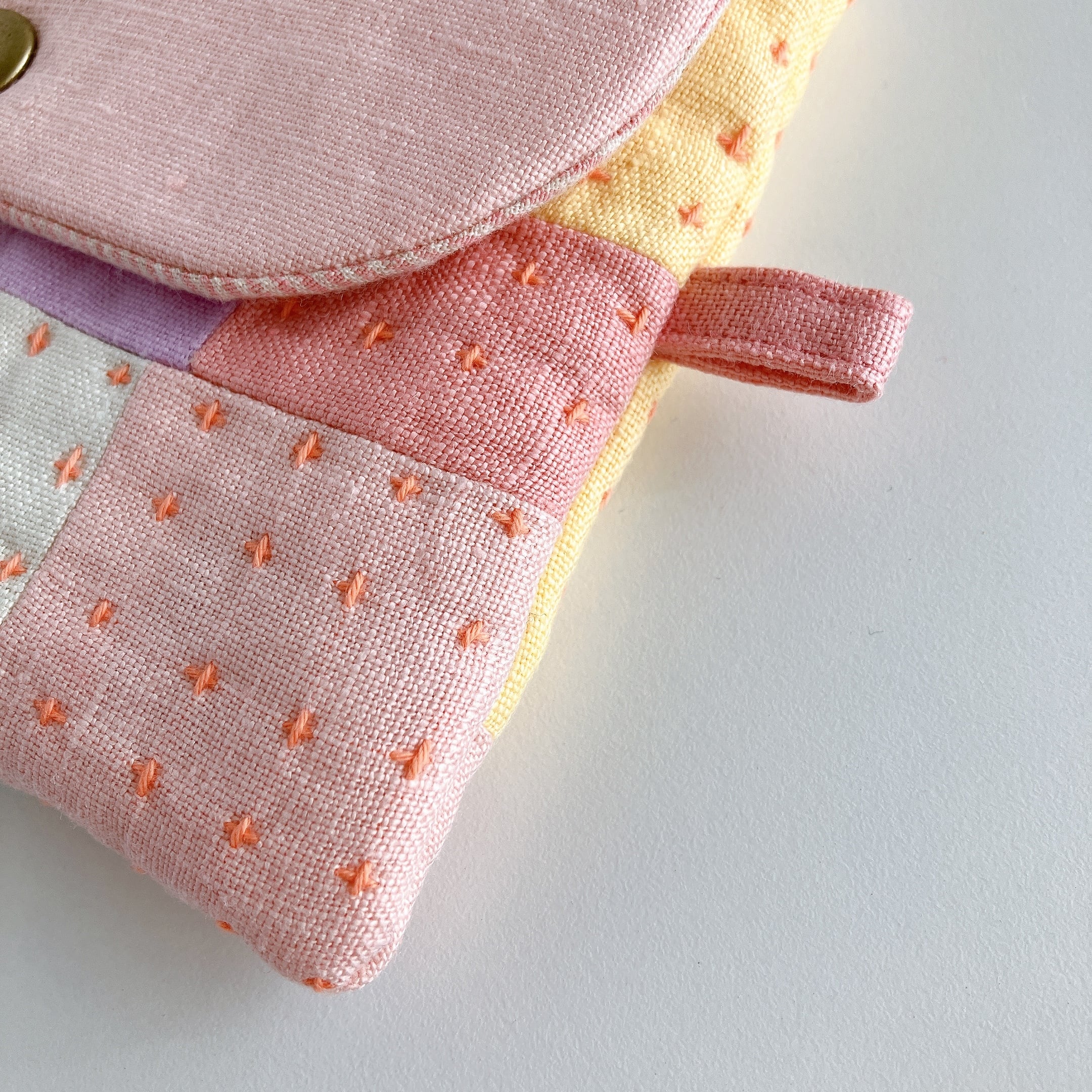 リネン生地を繋ぎ合わせた布に、小さな十字模様の刺し子をして作った、フラップポーチです。