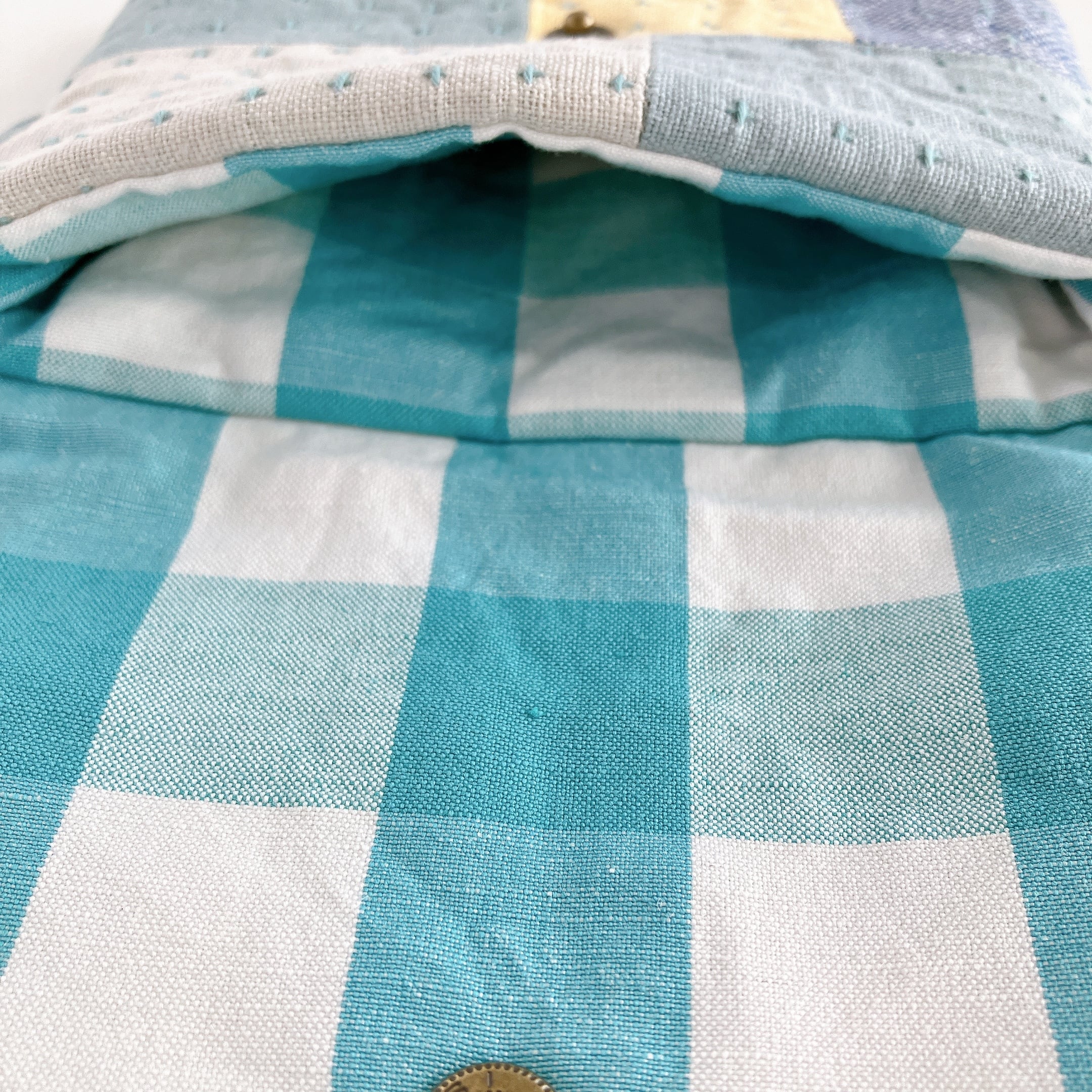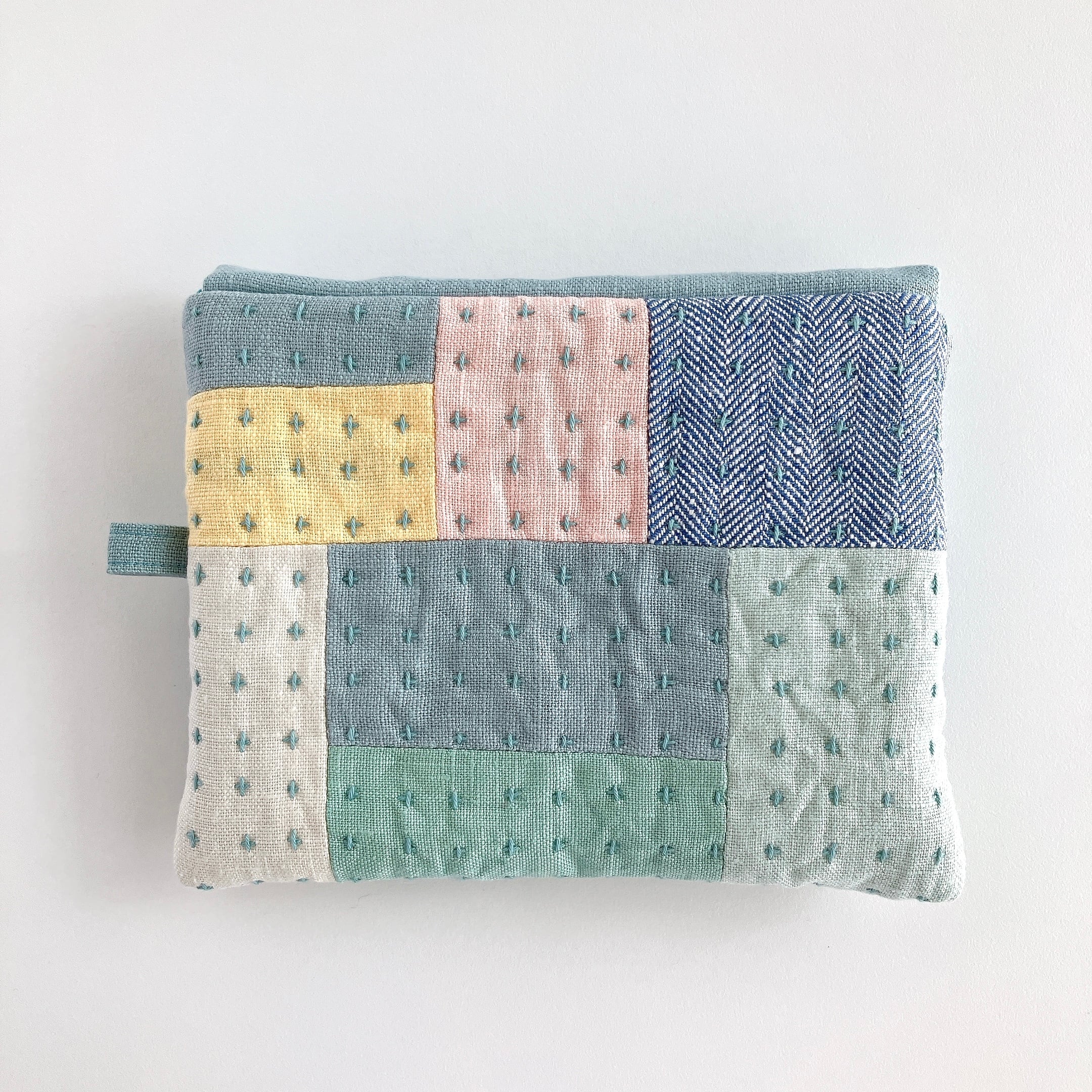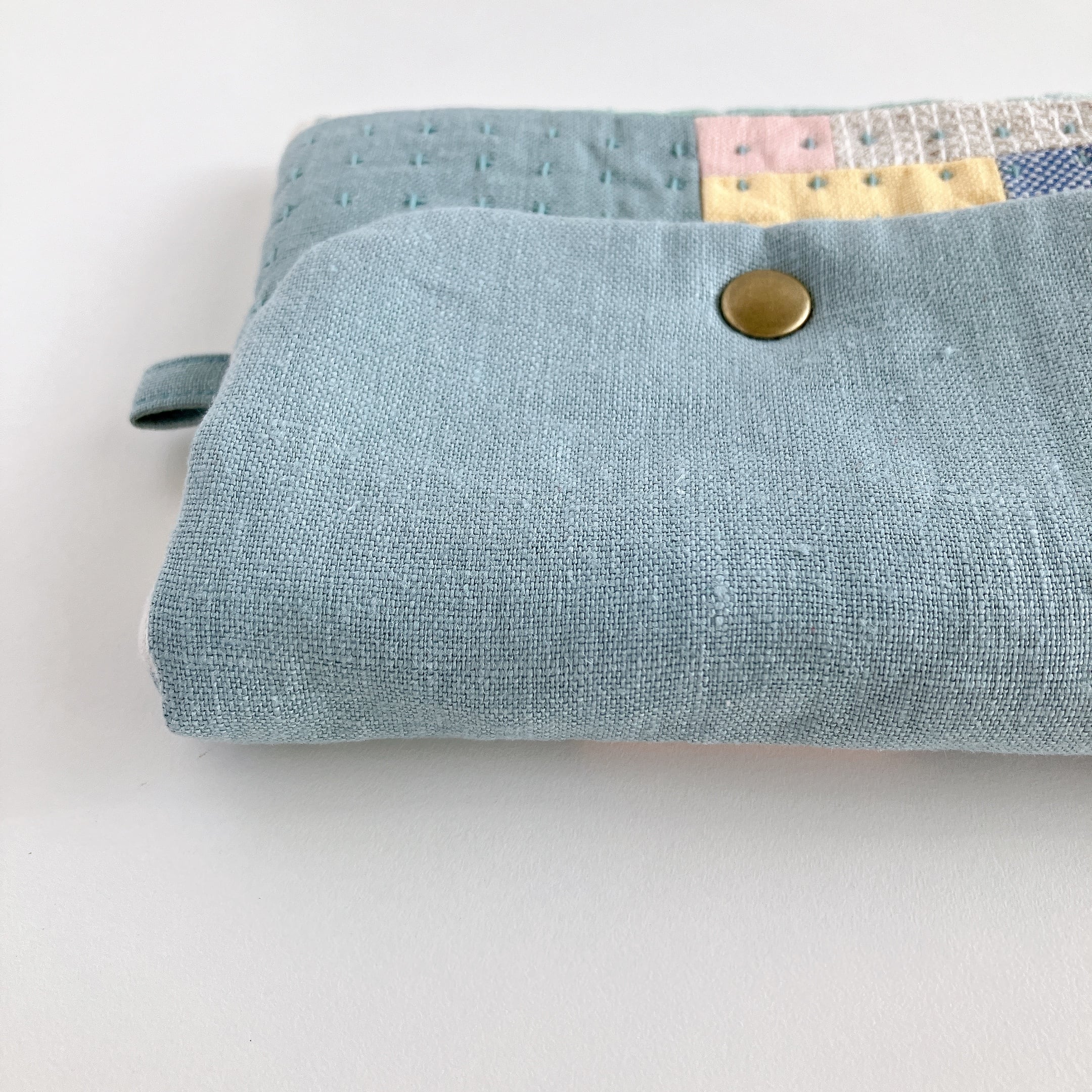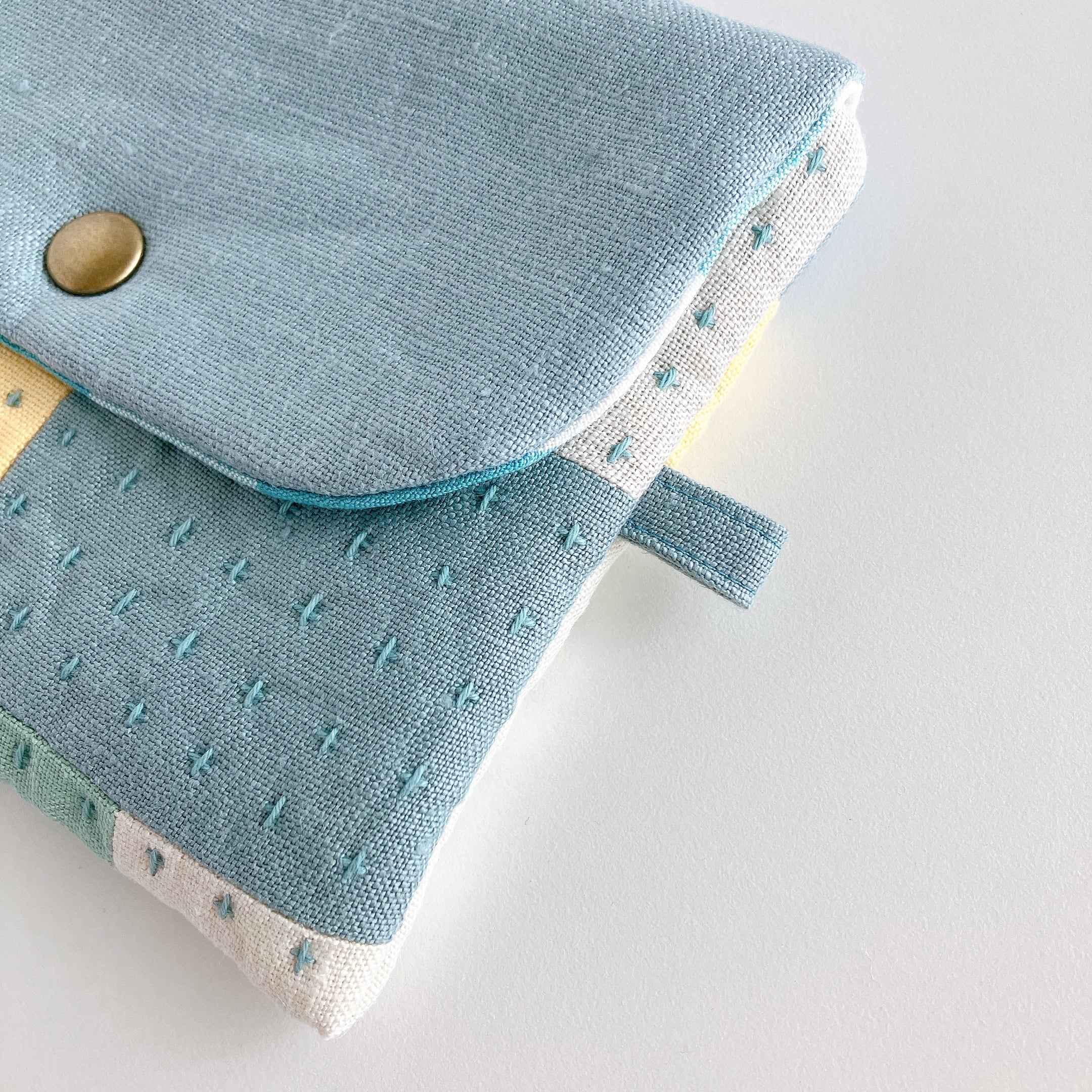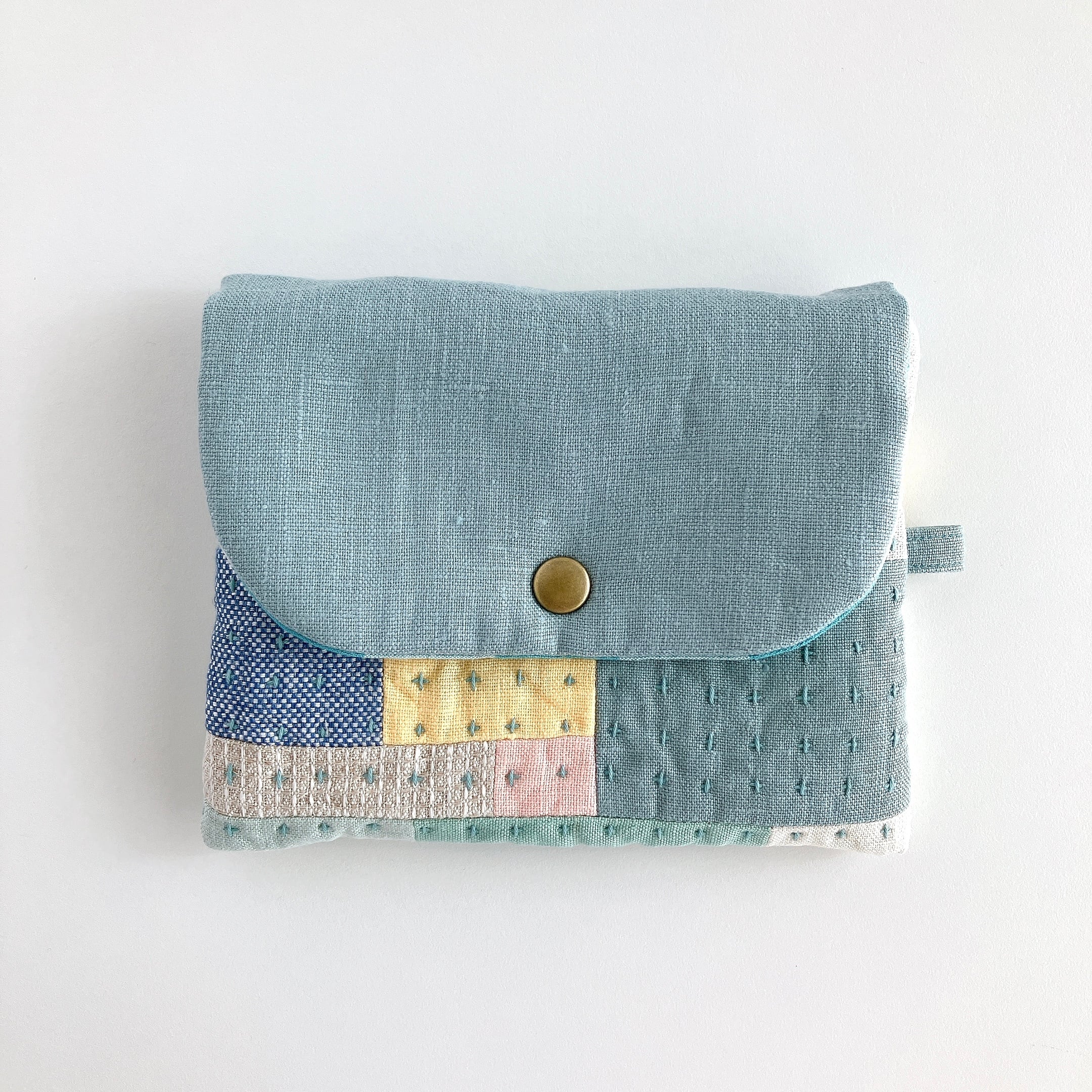 リネン生地を繋ぎ合わせた布に、小さな十字模様の刺し子をして作ったフラップポーチです。