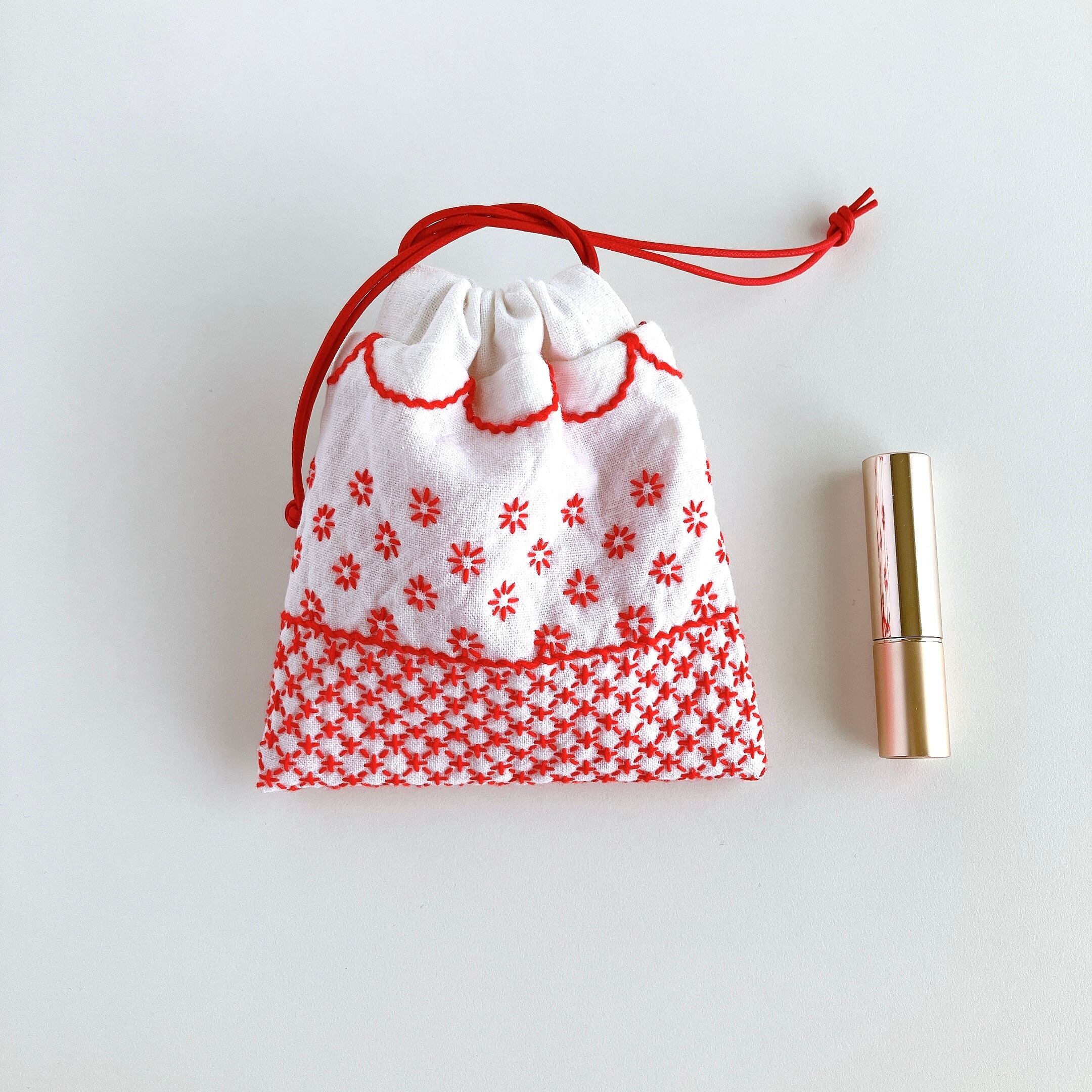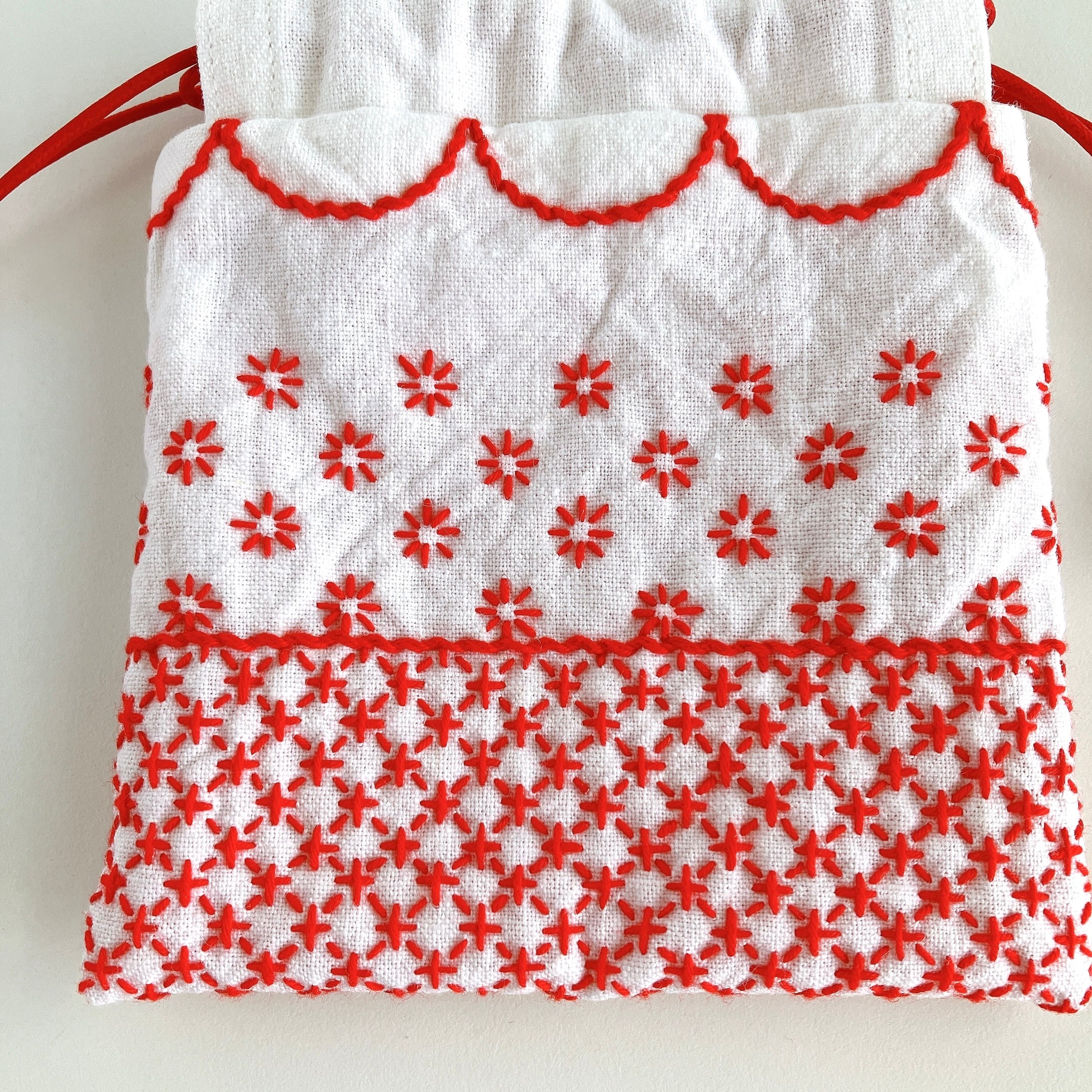 オフホワイト色のコットンリネン生地に刺し子をして作った、小さな巾着袋です。