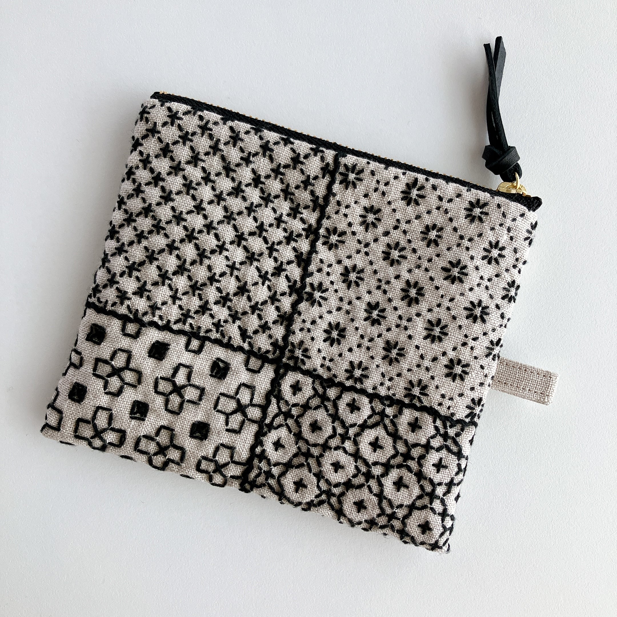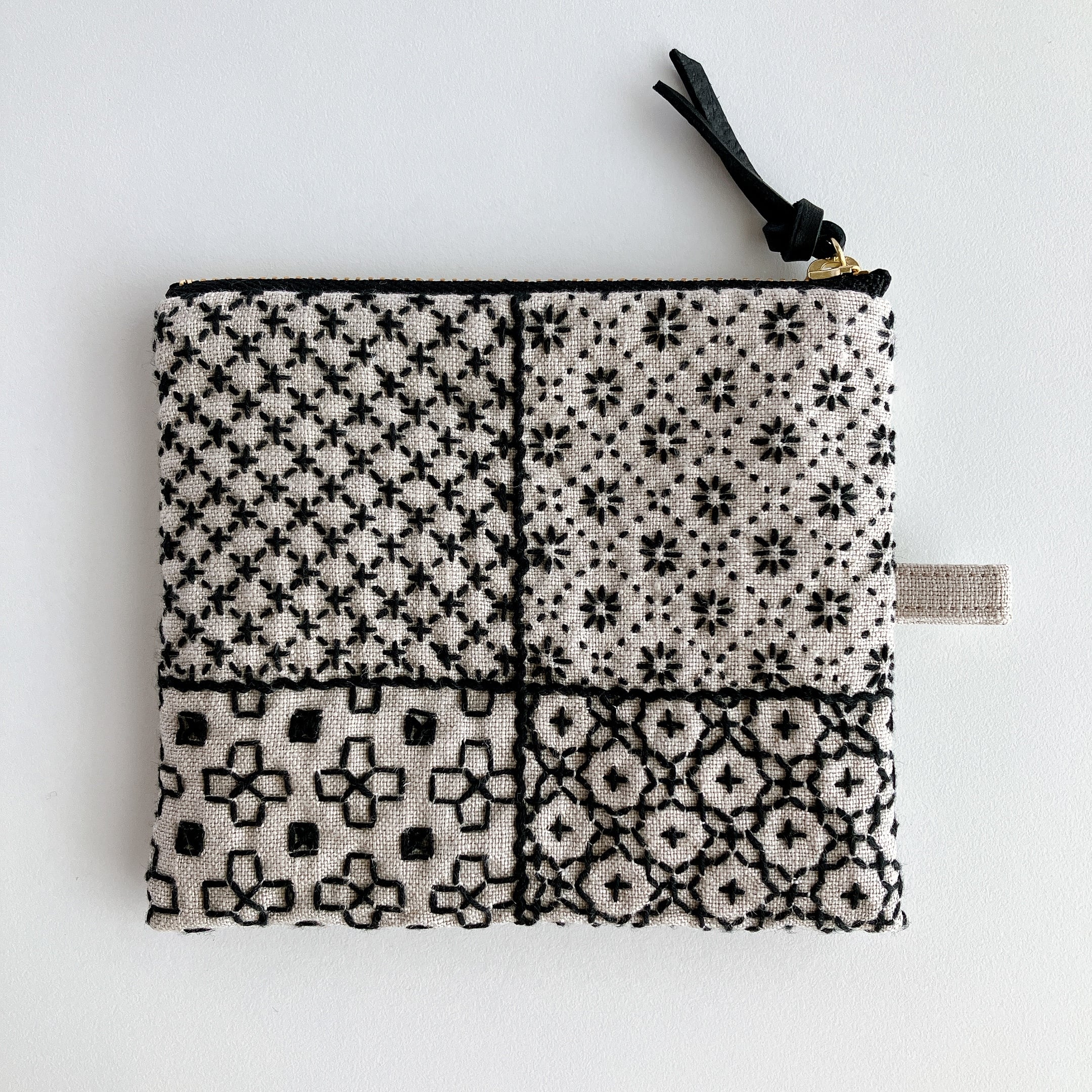 ベージュ色のリネン生地に、刺し子をして作ったファスナーポーチです。