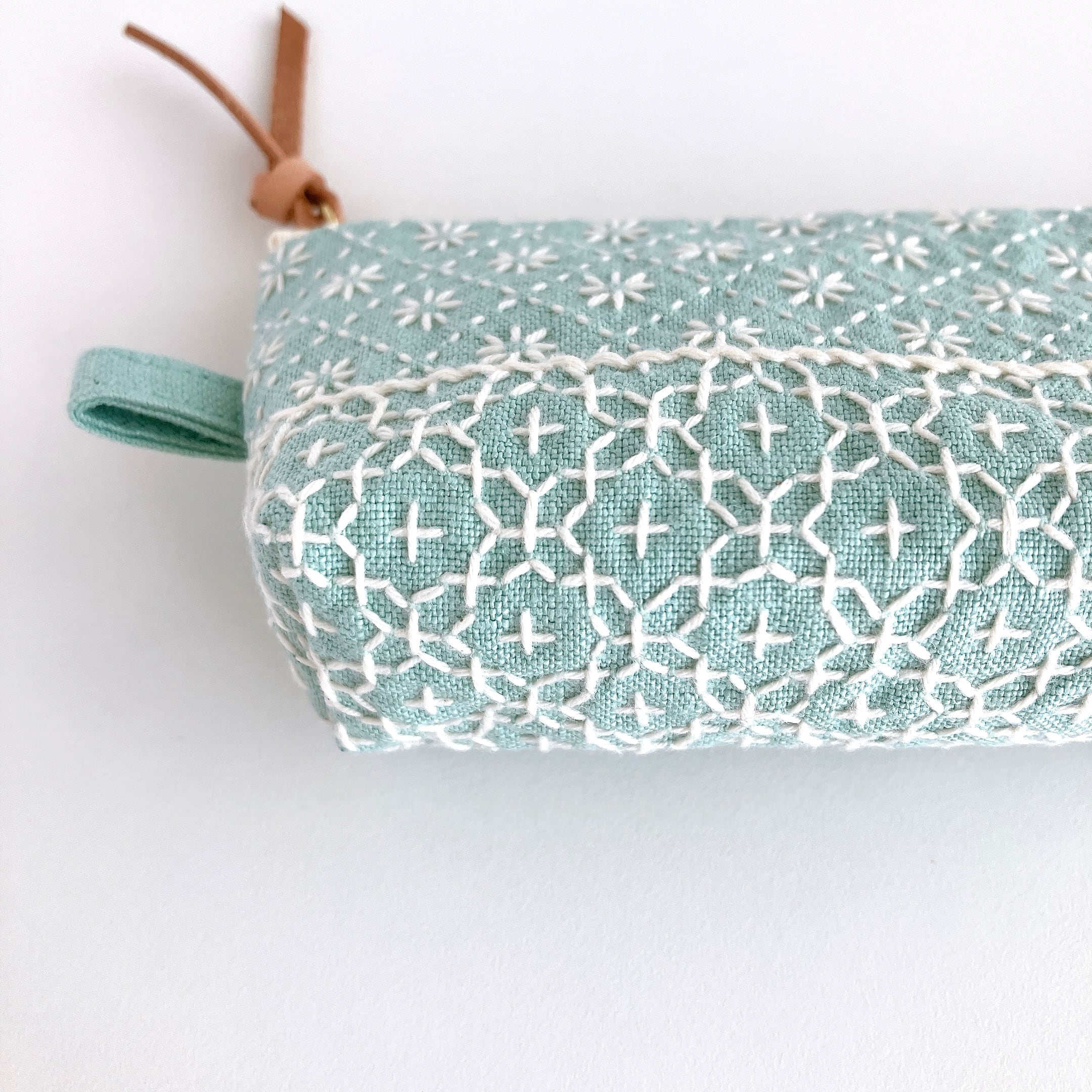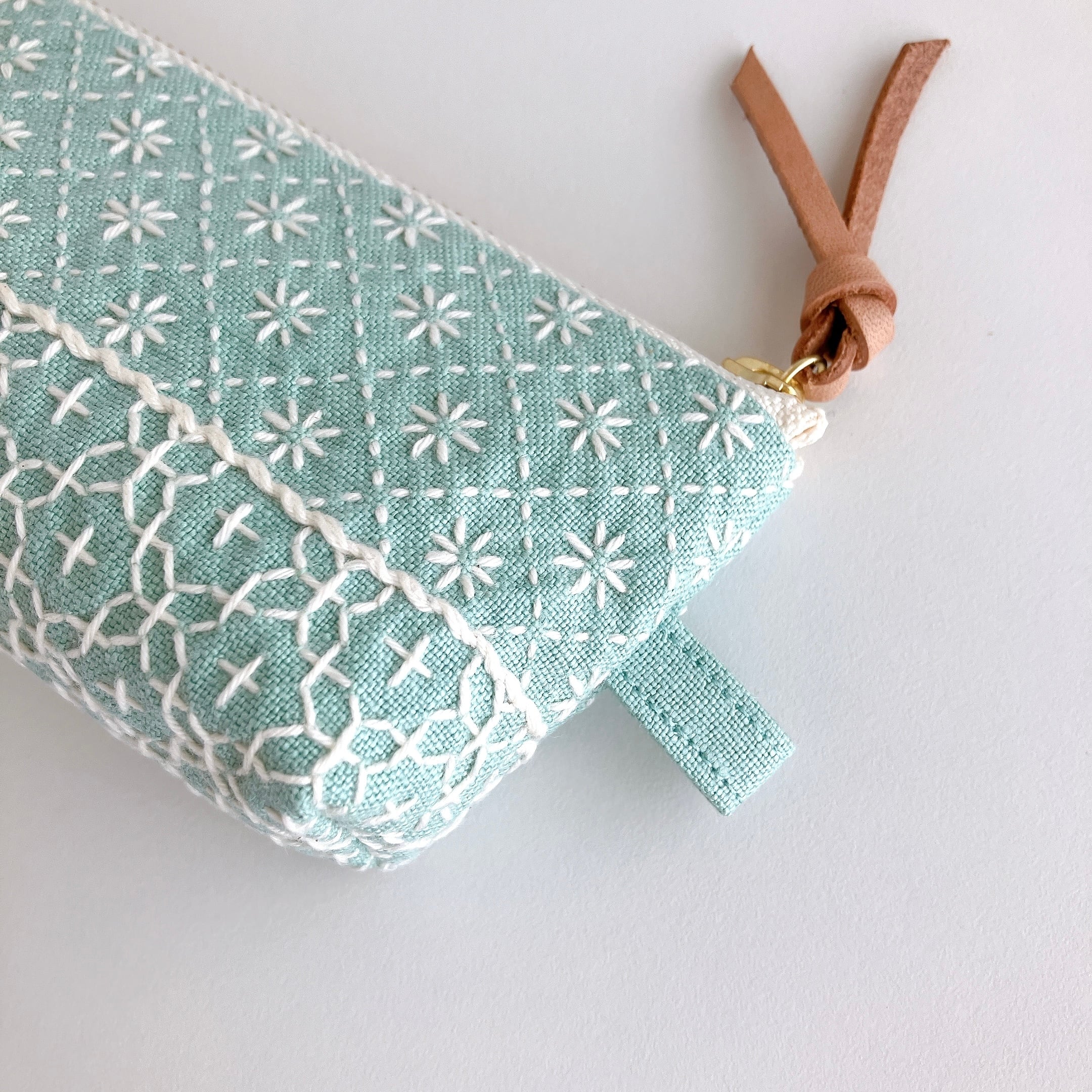 クリームミント色のリネン生地に、刺し子をして作ったファスナーポーチです。