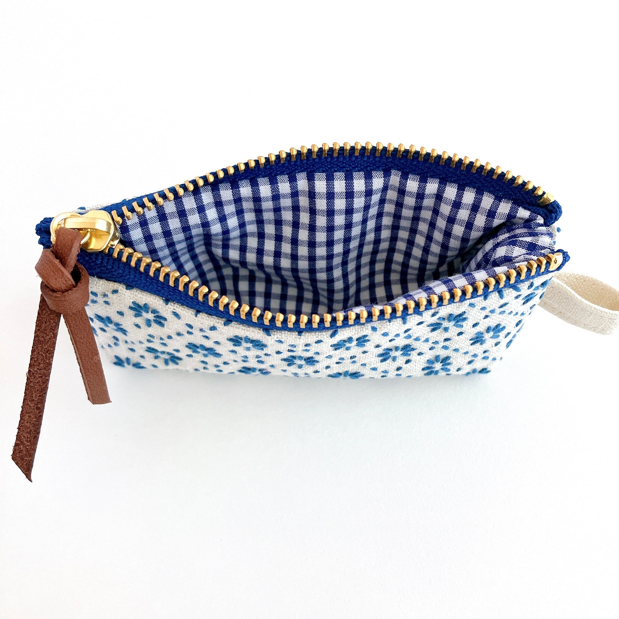 アイボリー色のリネン生地に刺し子をして作った細長い形のファスナーポーチです。