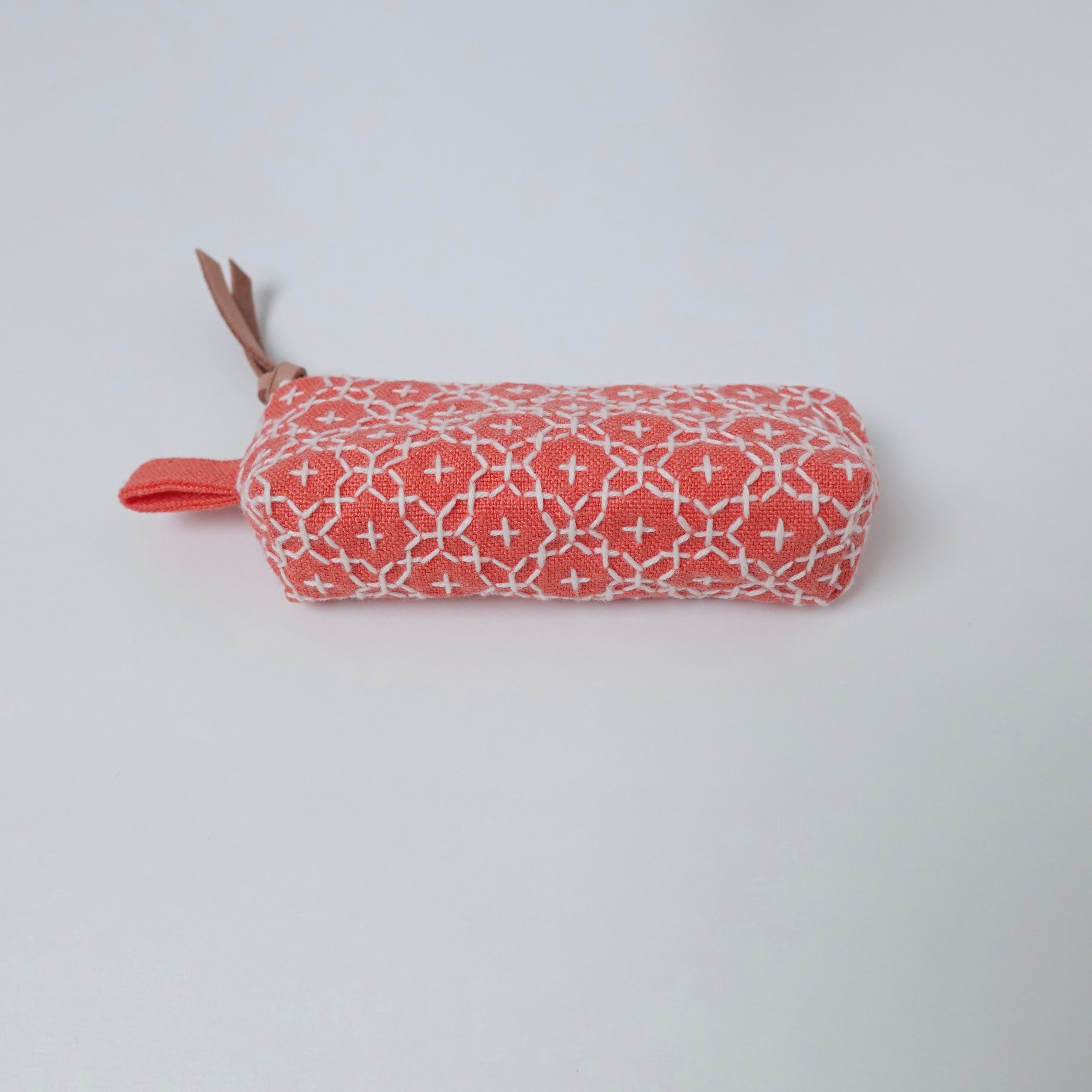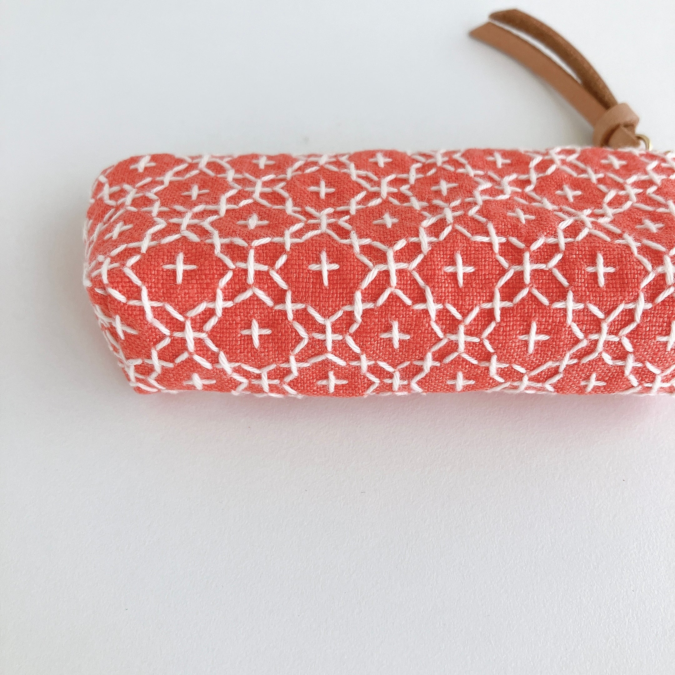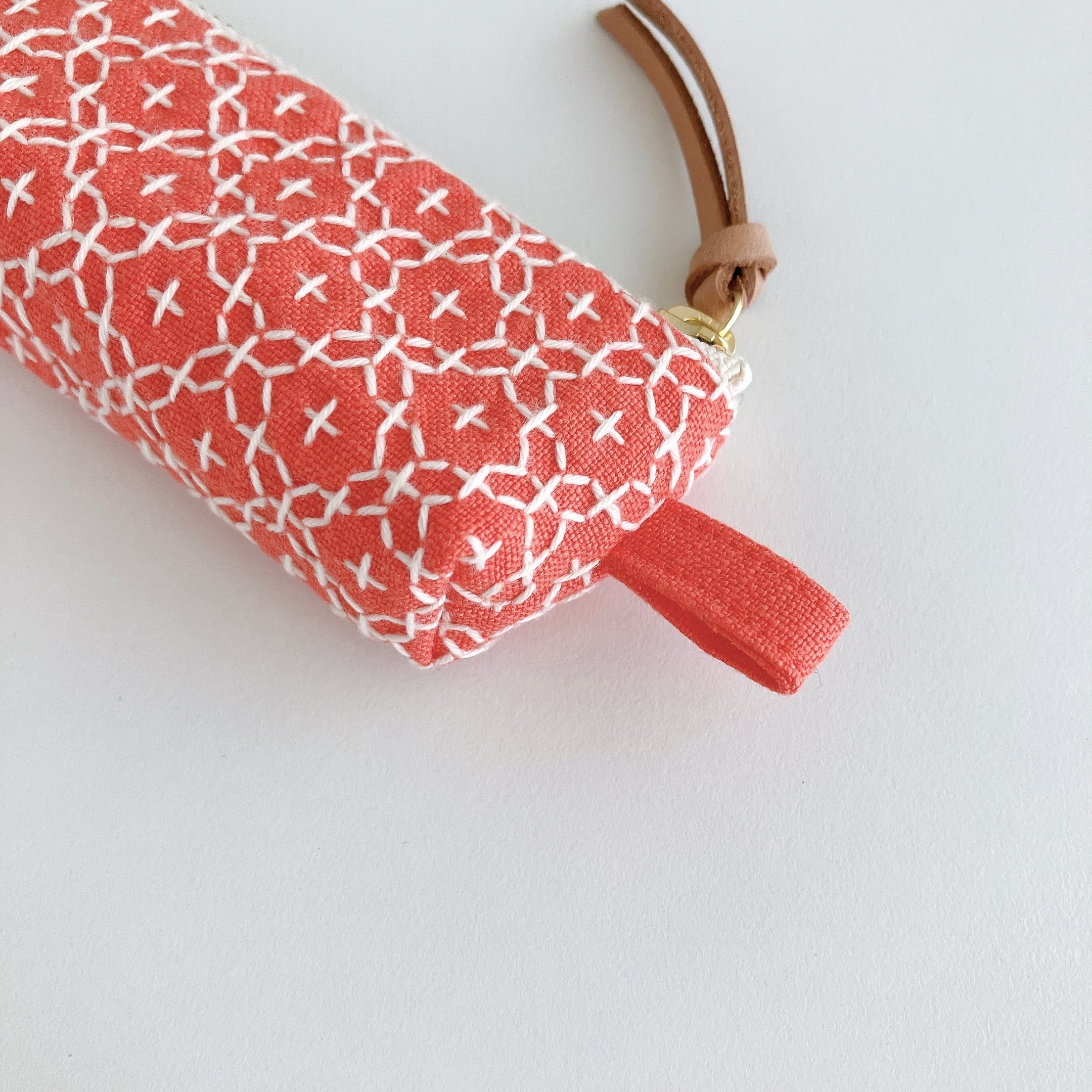 さんご色のリネン生地に刺し子をして作った細長い形のファスナーポーチです。