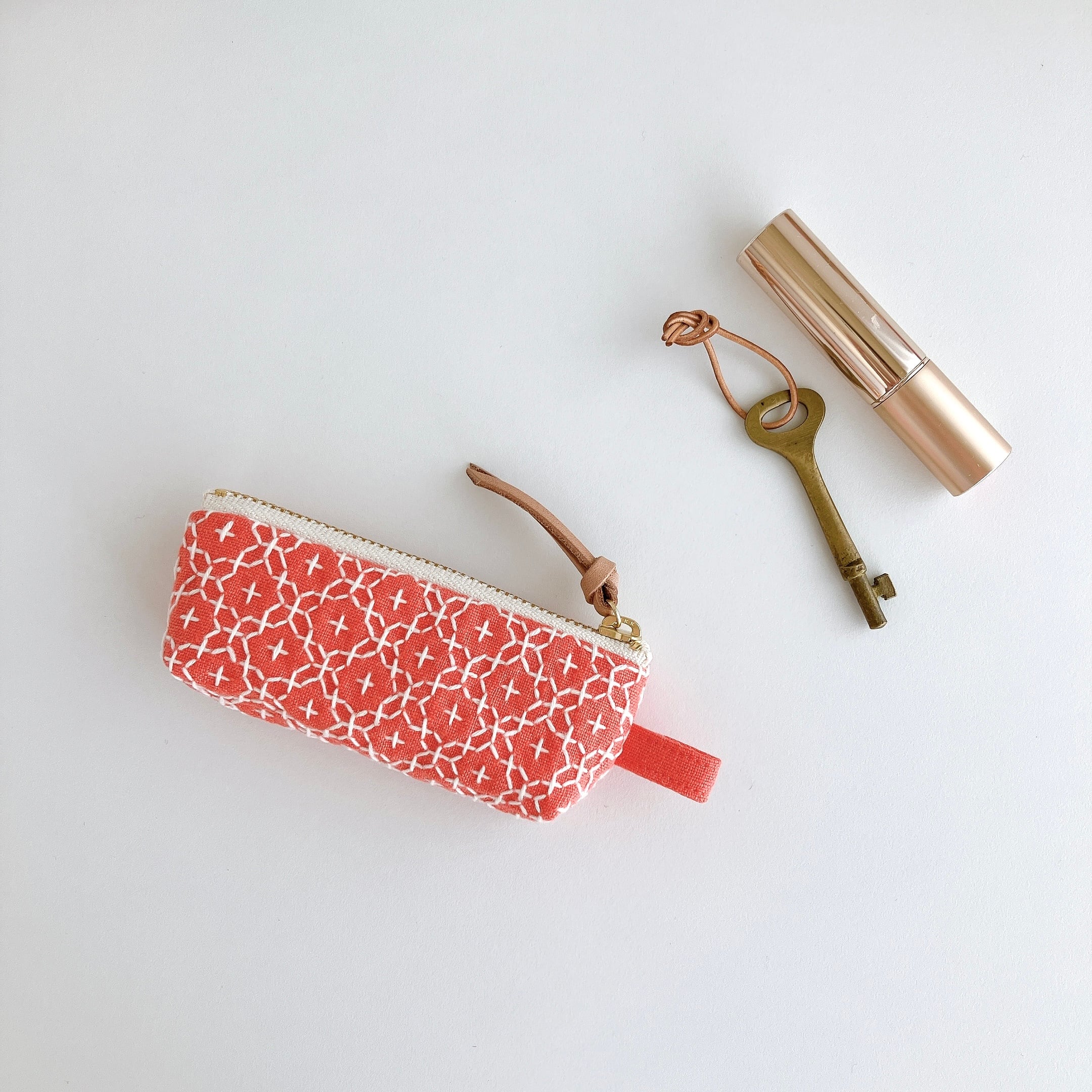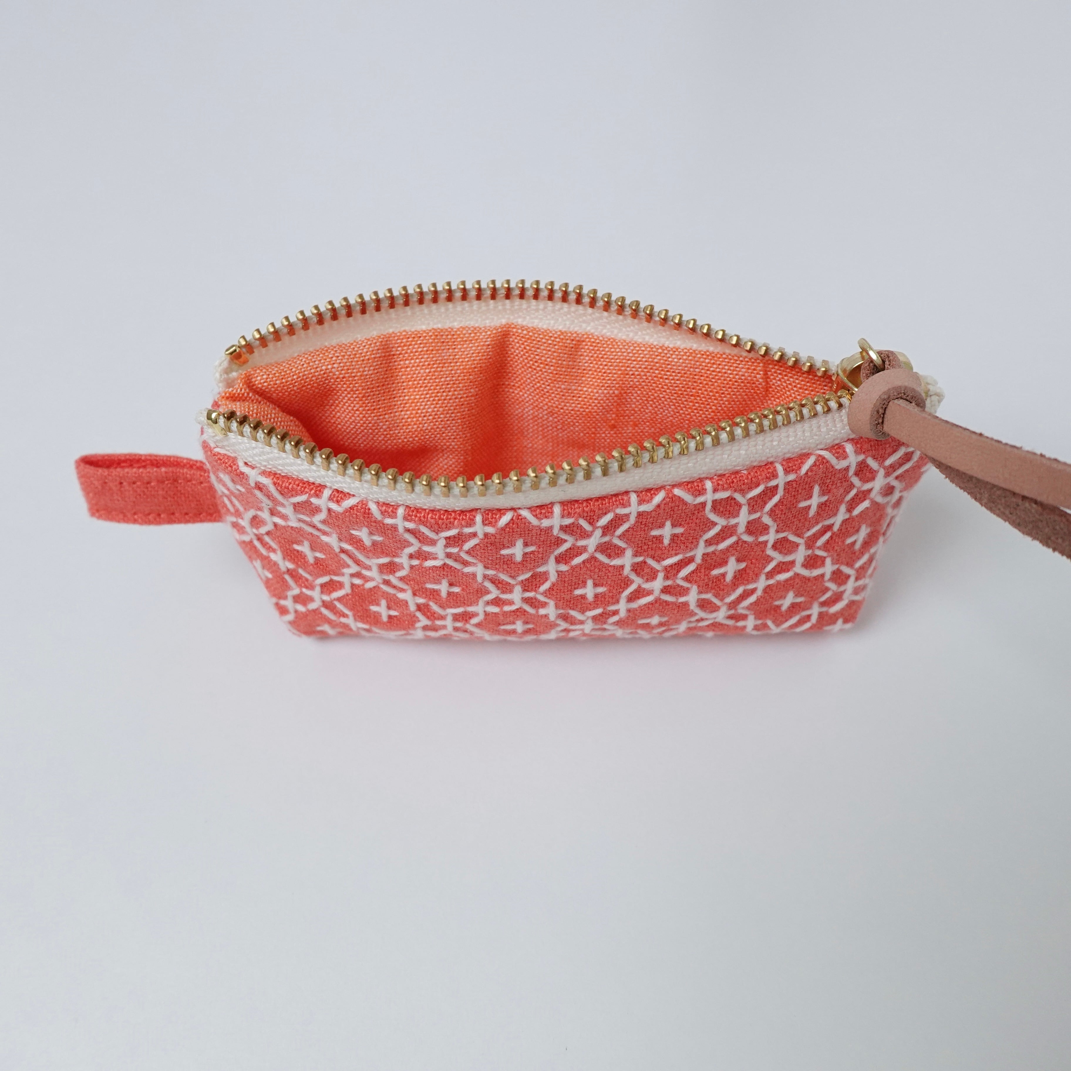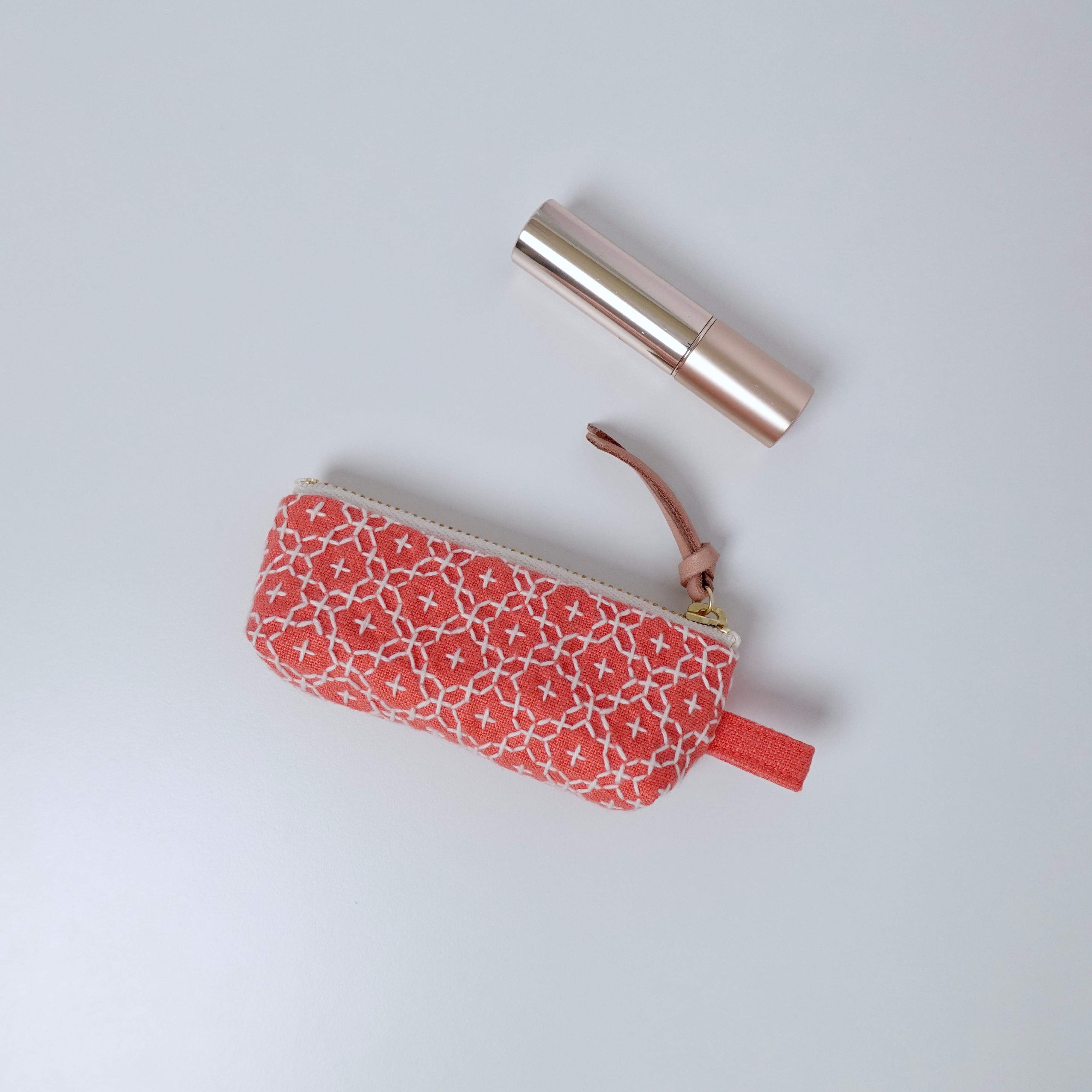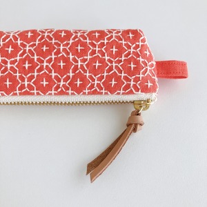 さんご色のリネン生地に刺し子をして作った細長い形のファスナーポーチです。