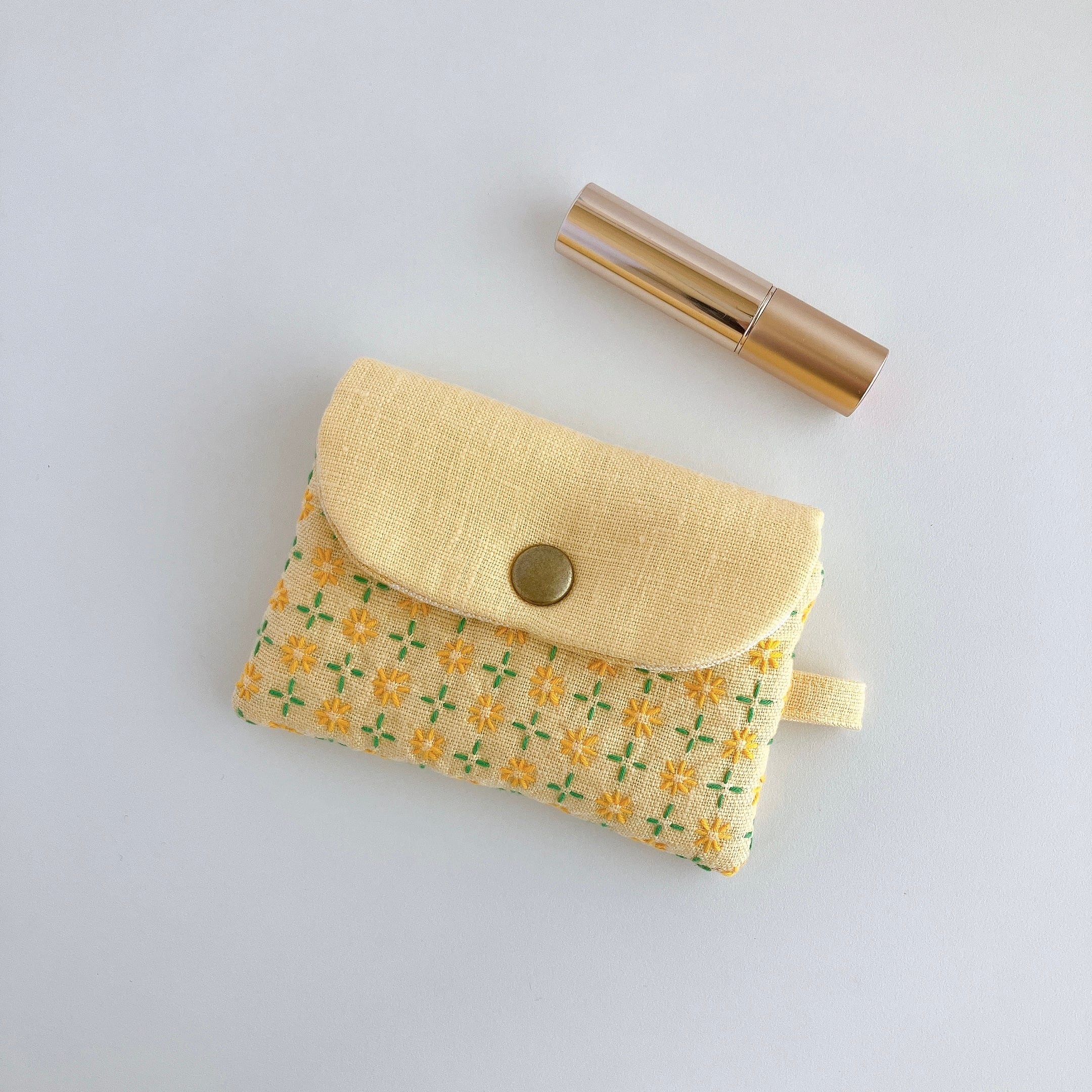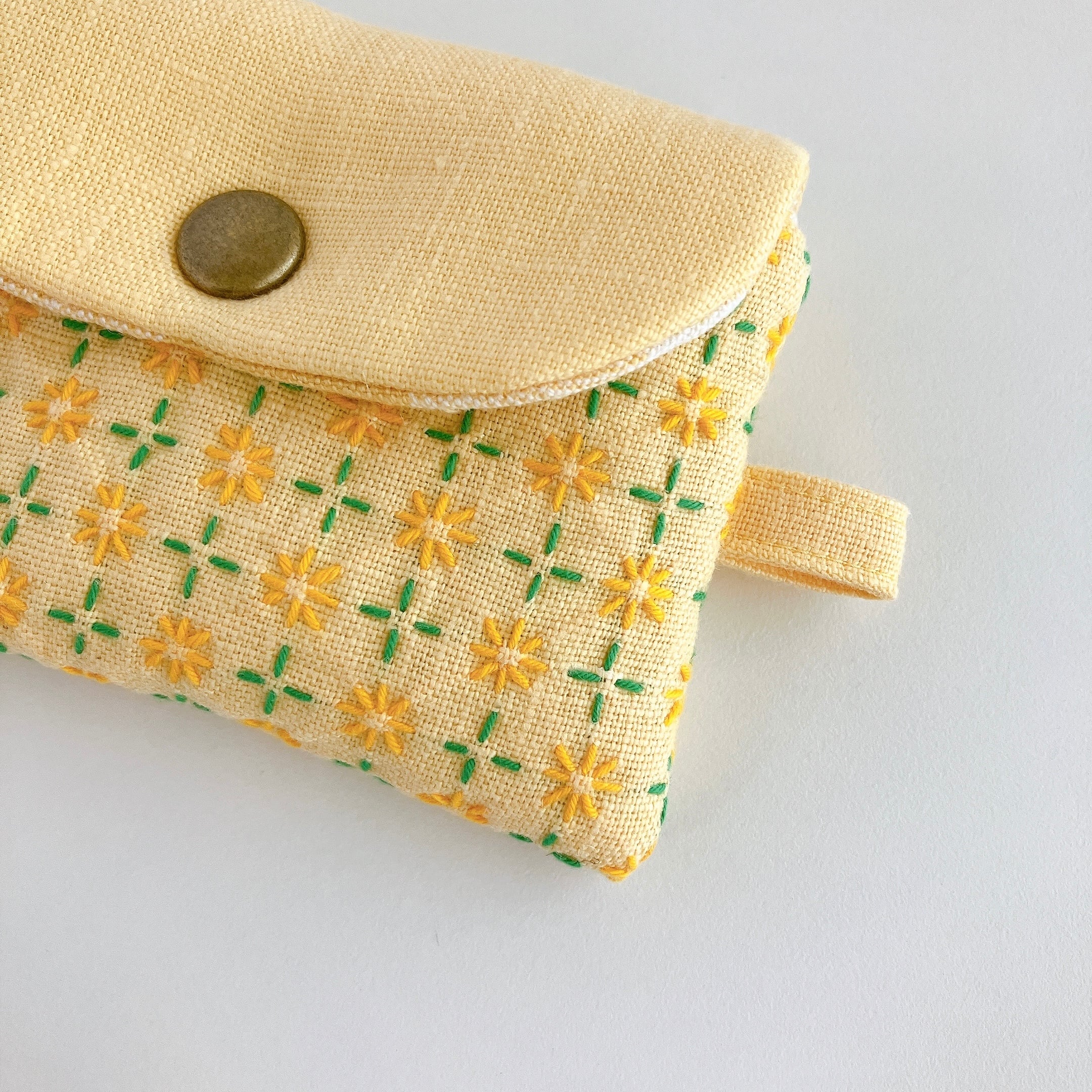 薄黄色のリネン生地に、刺し子をして作った小さなフラップポーチです。