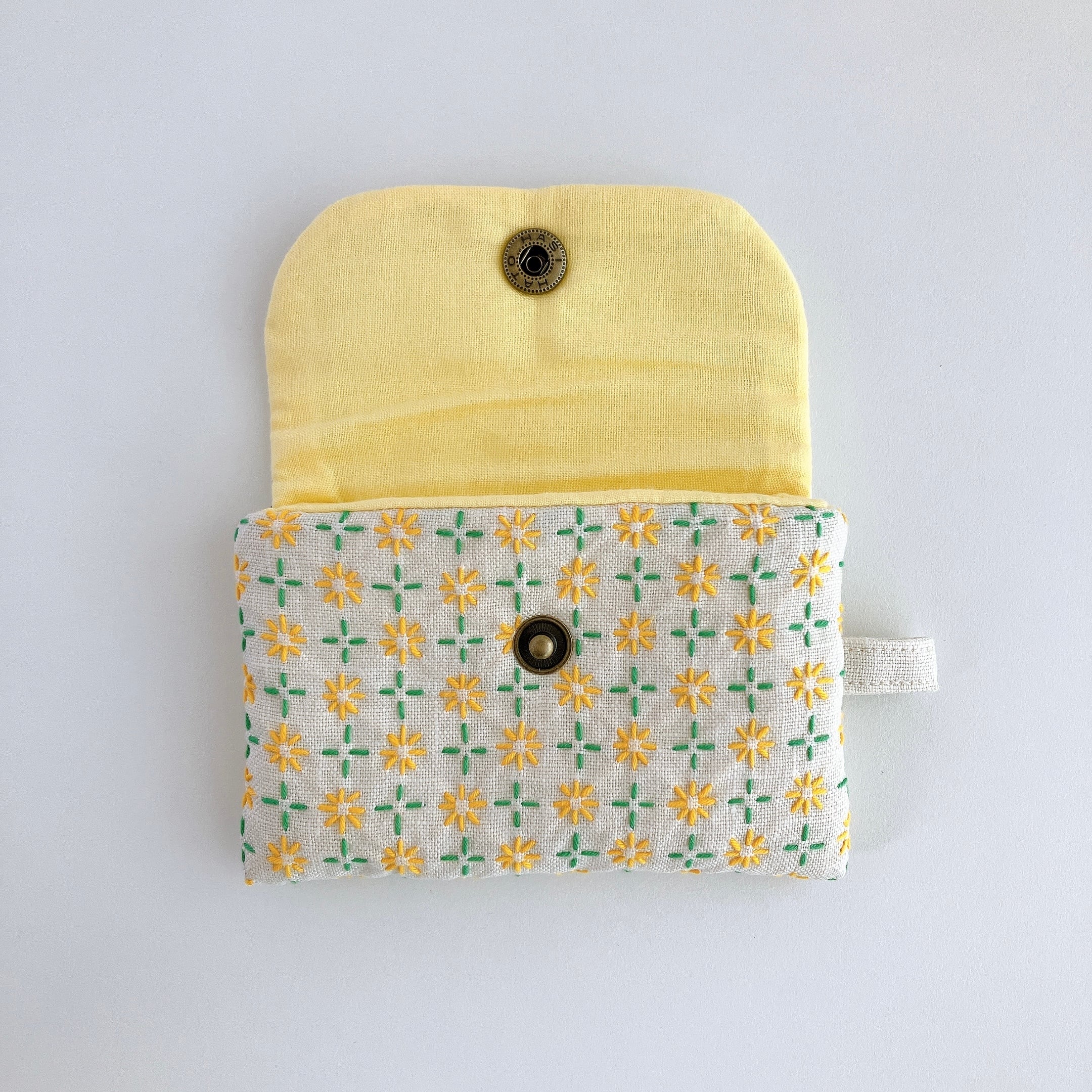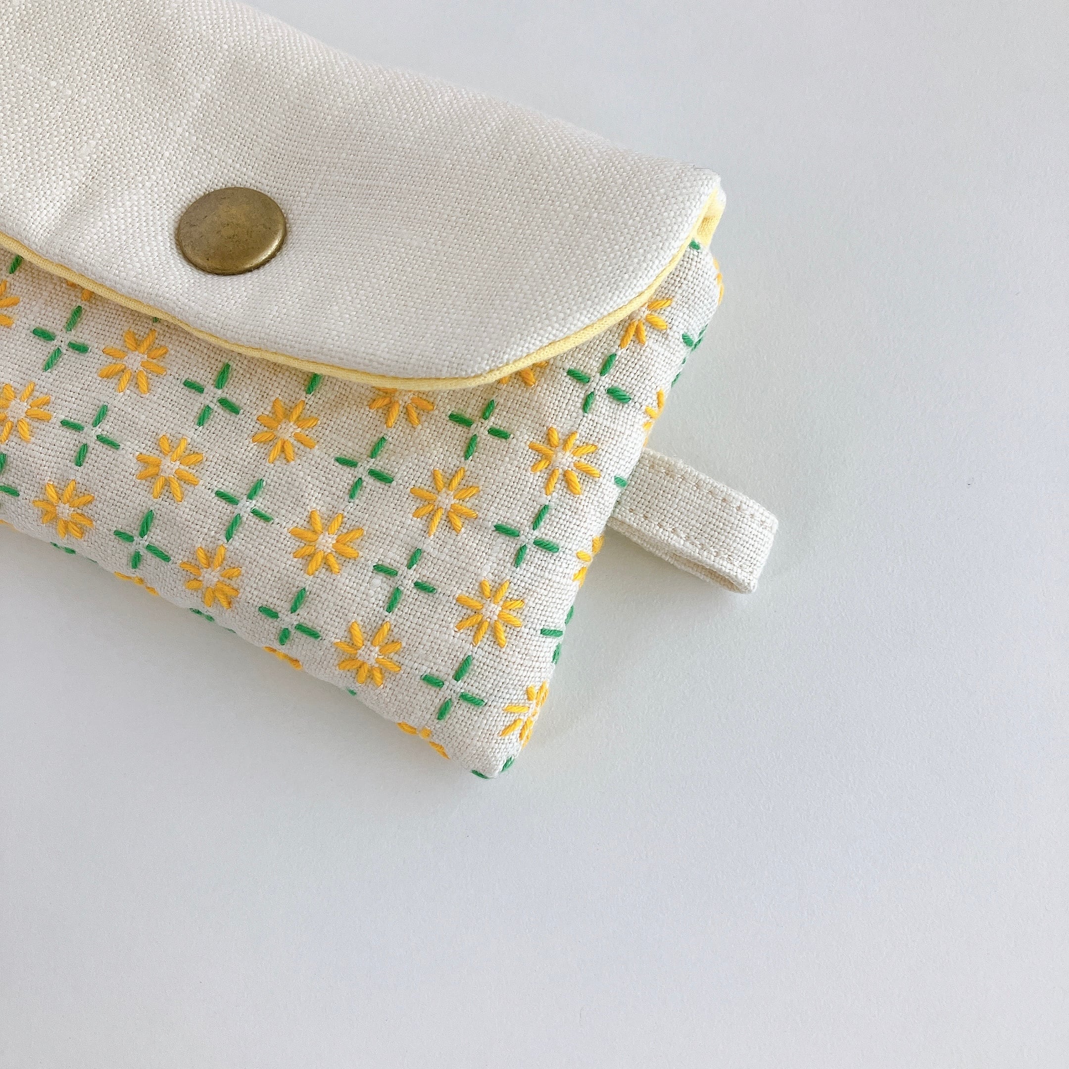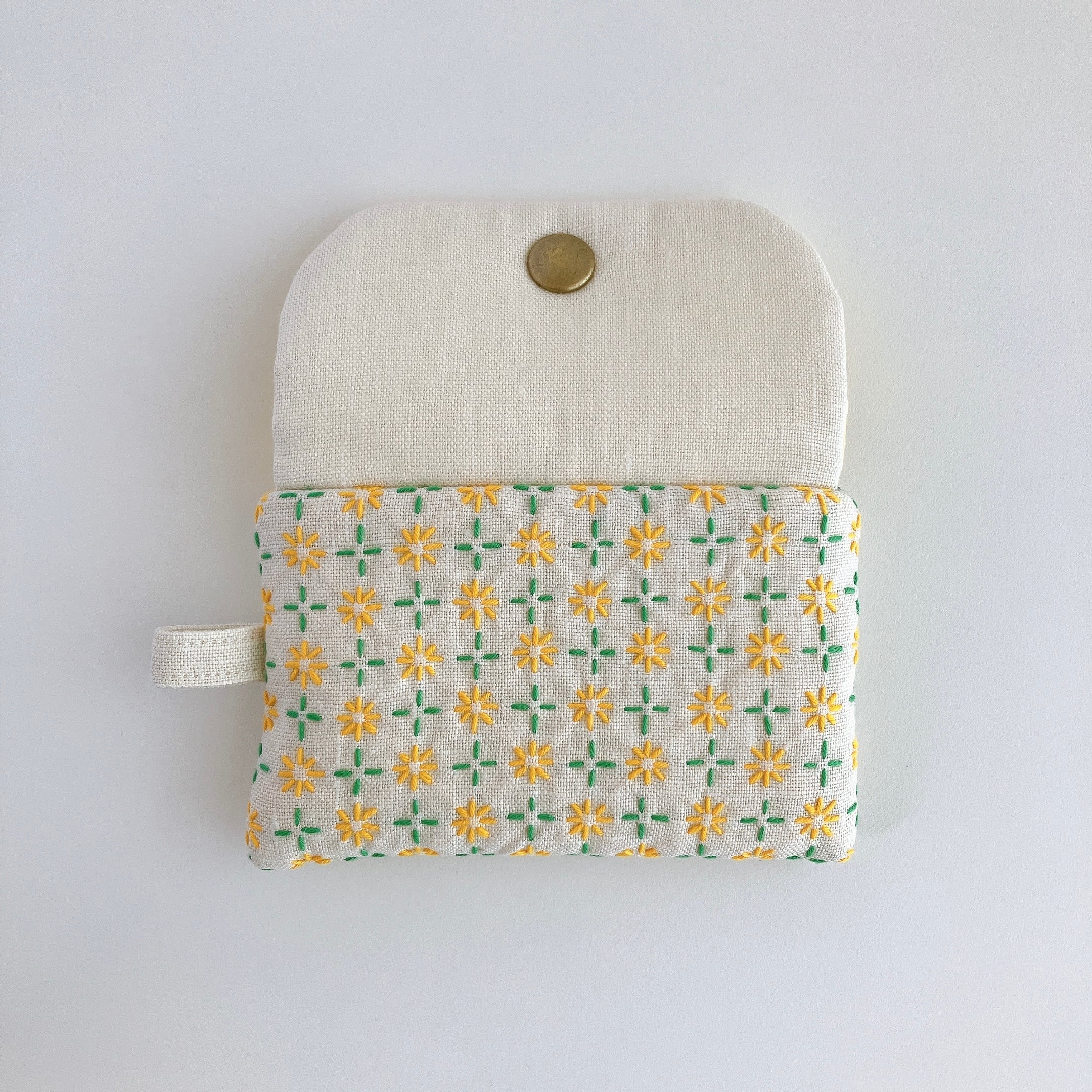 アイボリー色のリネン生地に、刺し子をして作った小さなフラップポーチです。