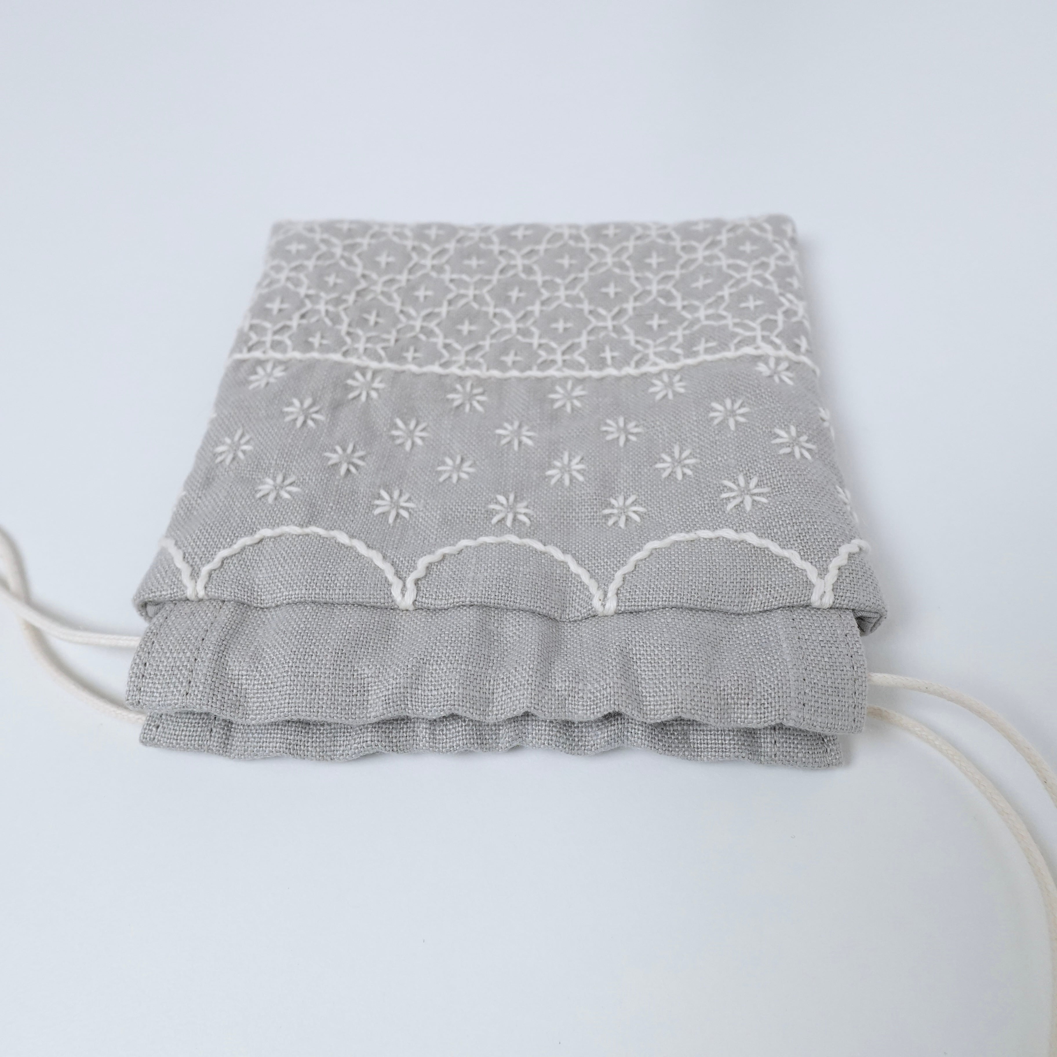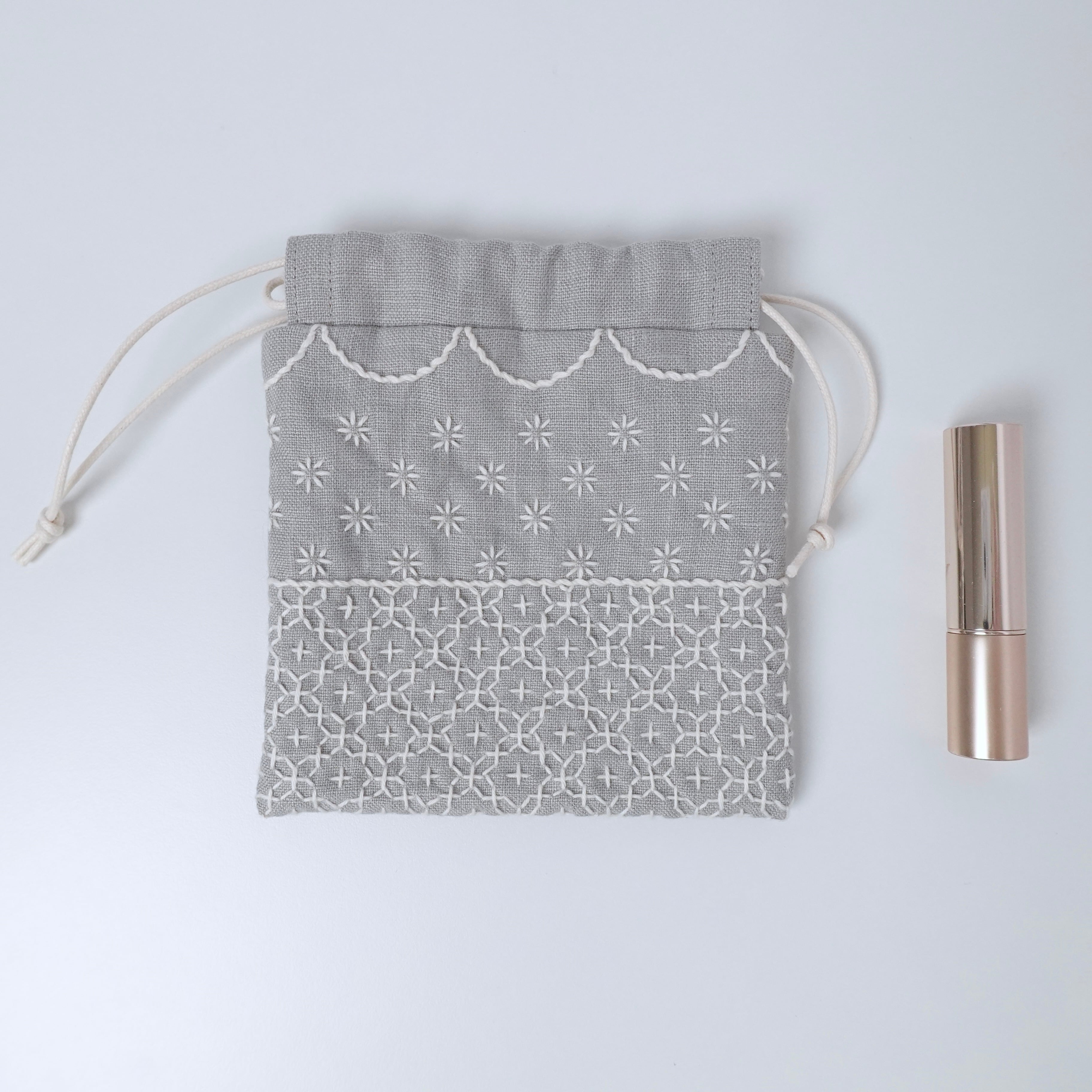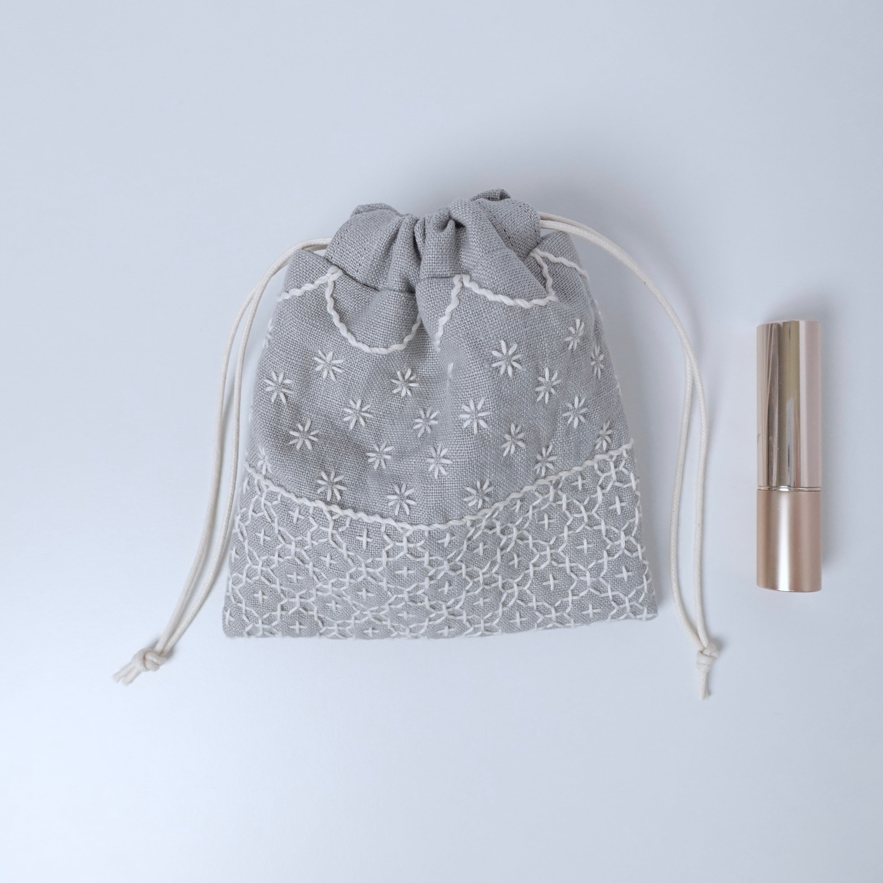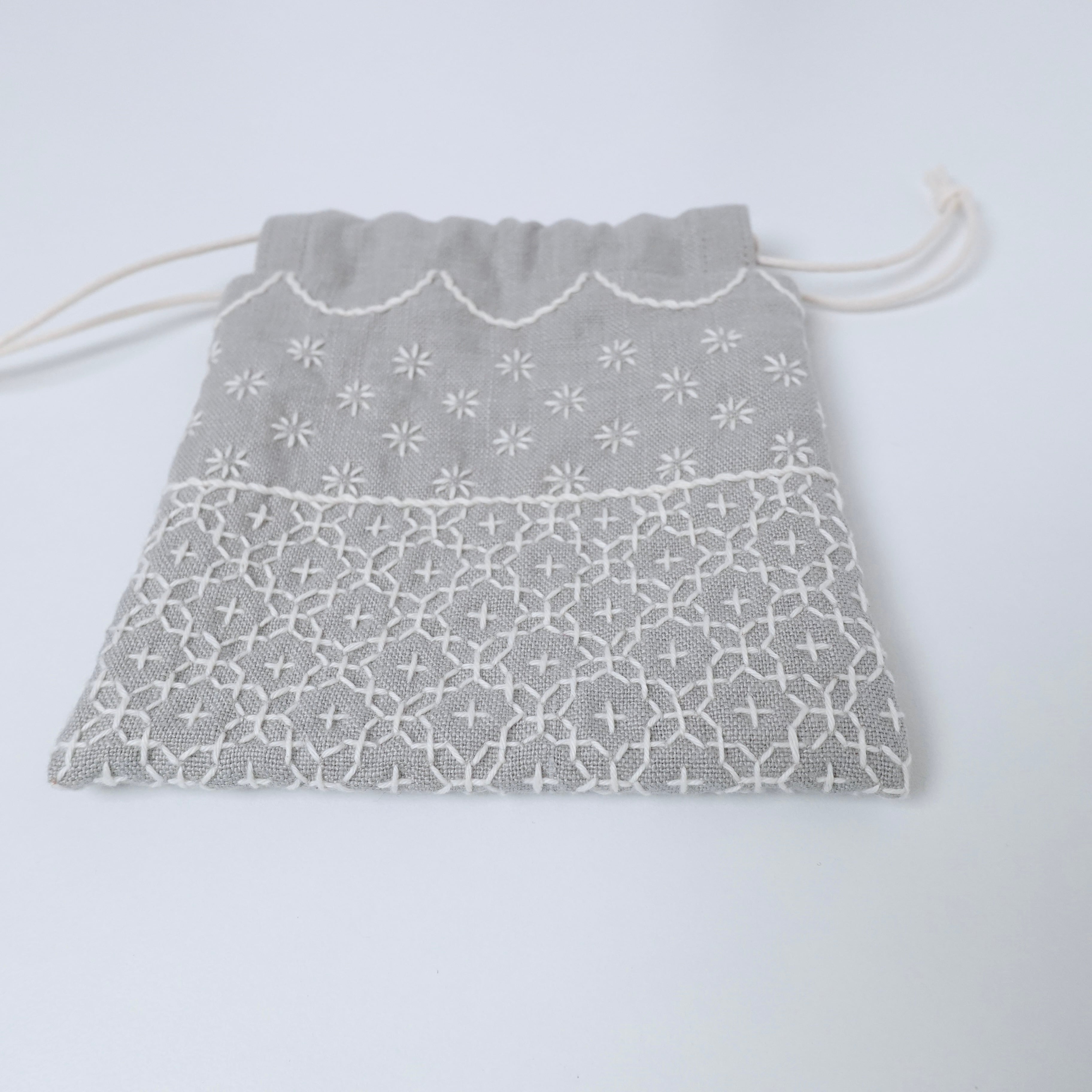 ライトグレー色のリネン生地に刺し子をして作った、小さな巾着袋です。