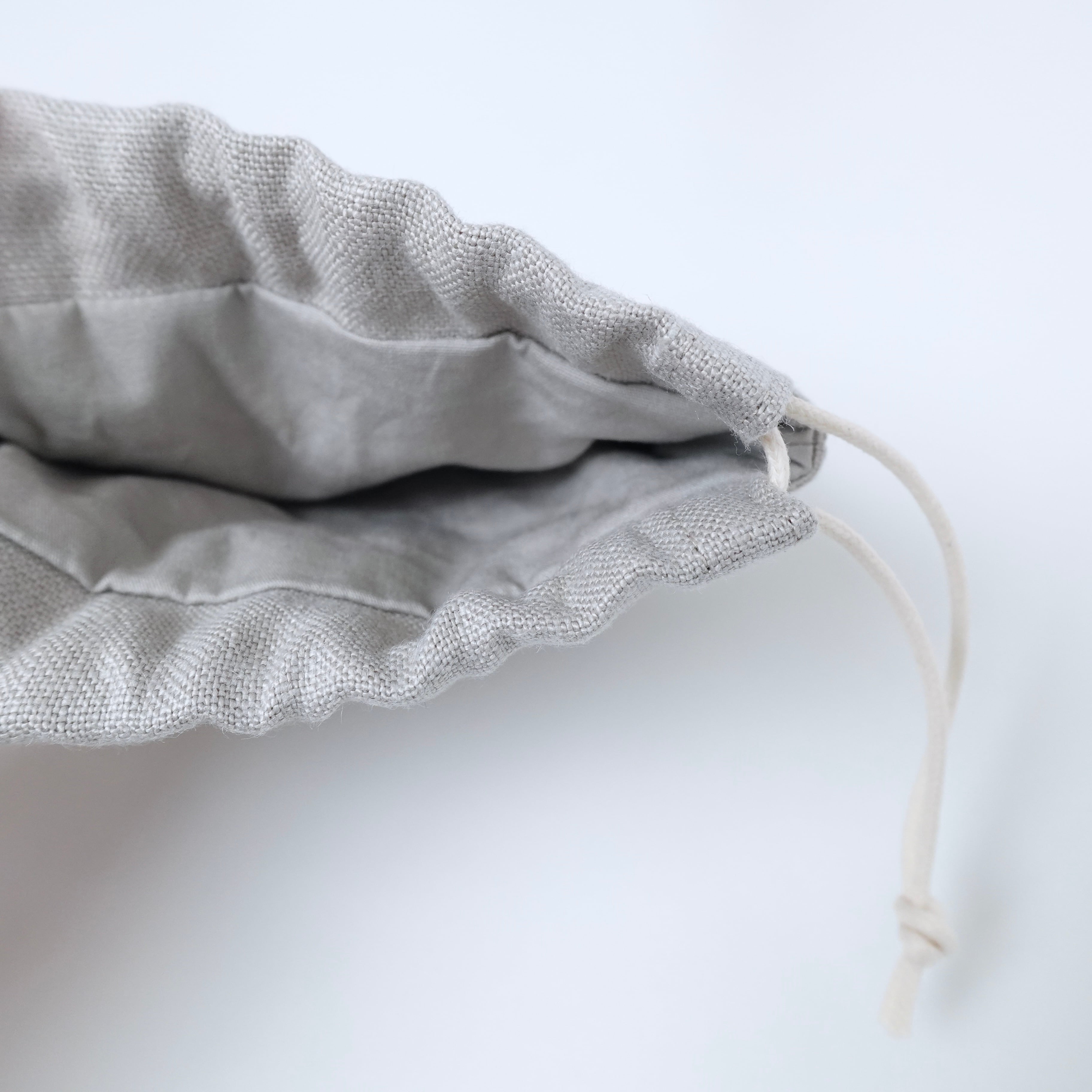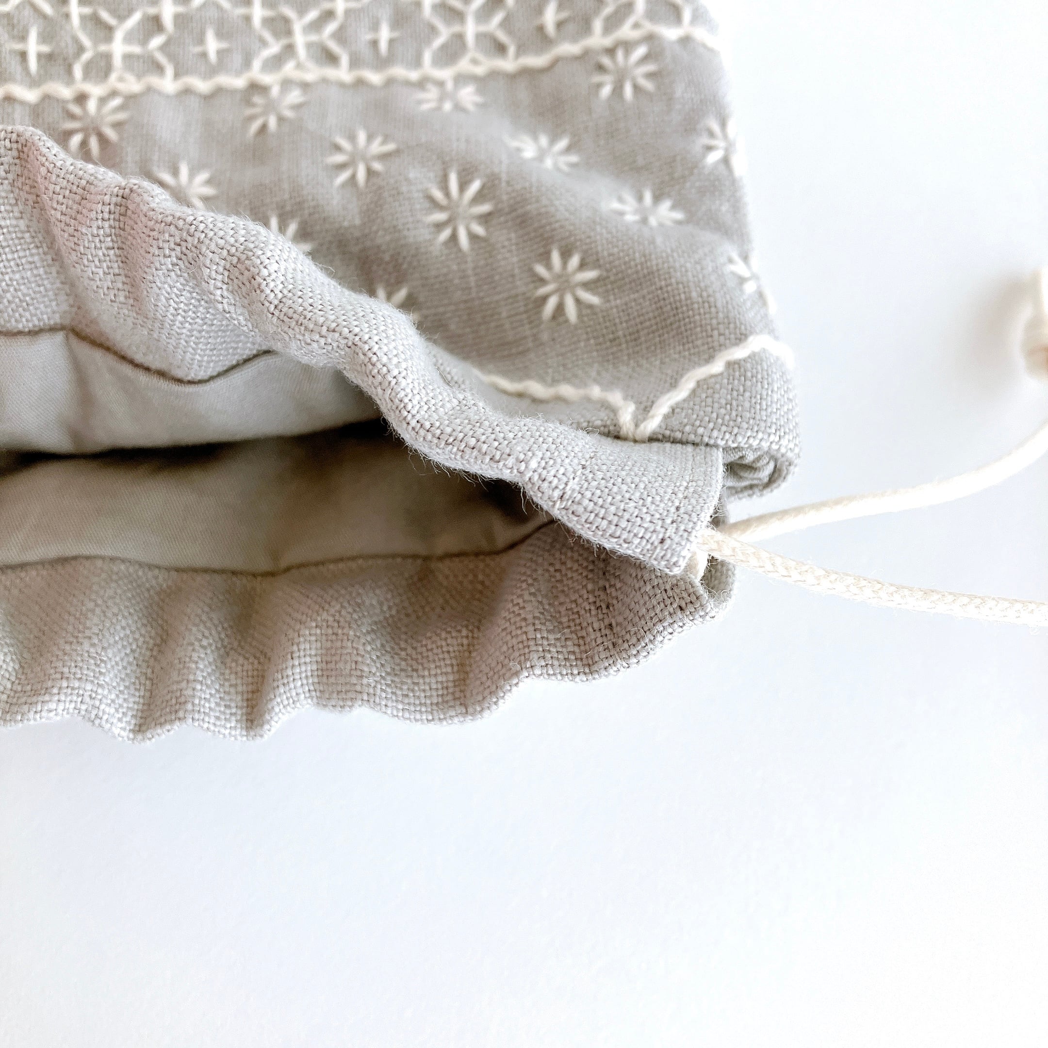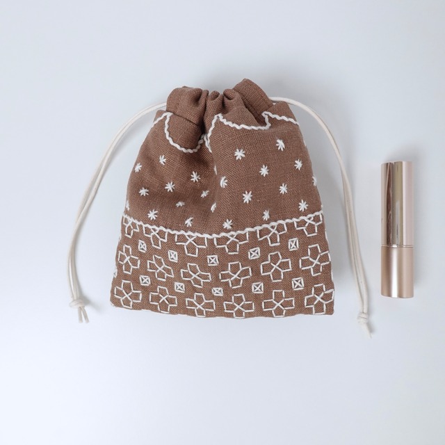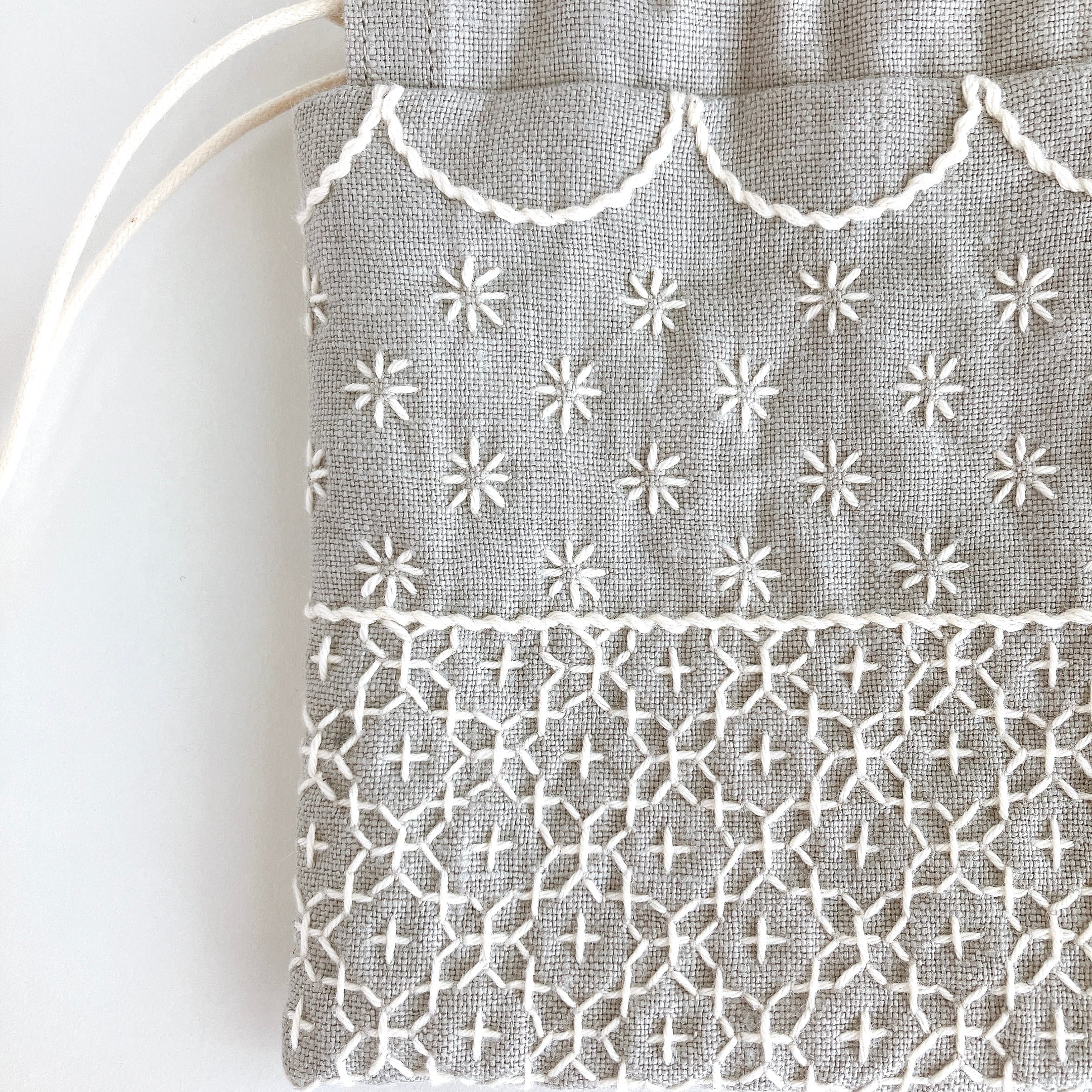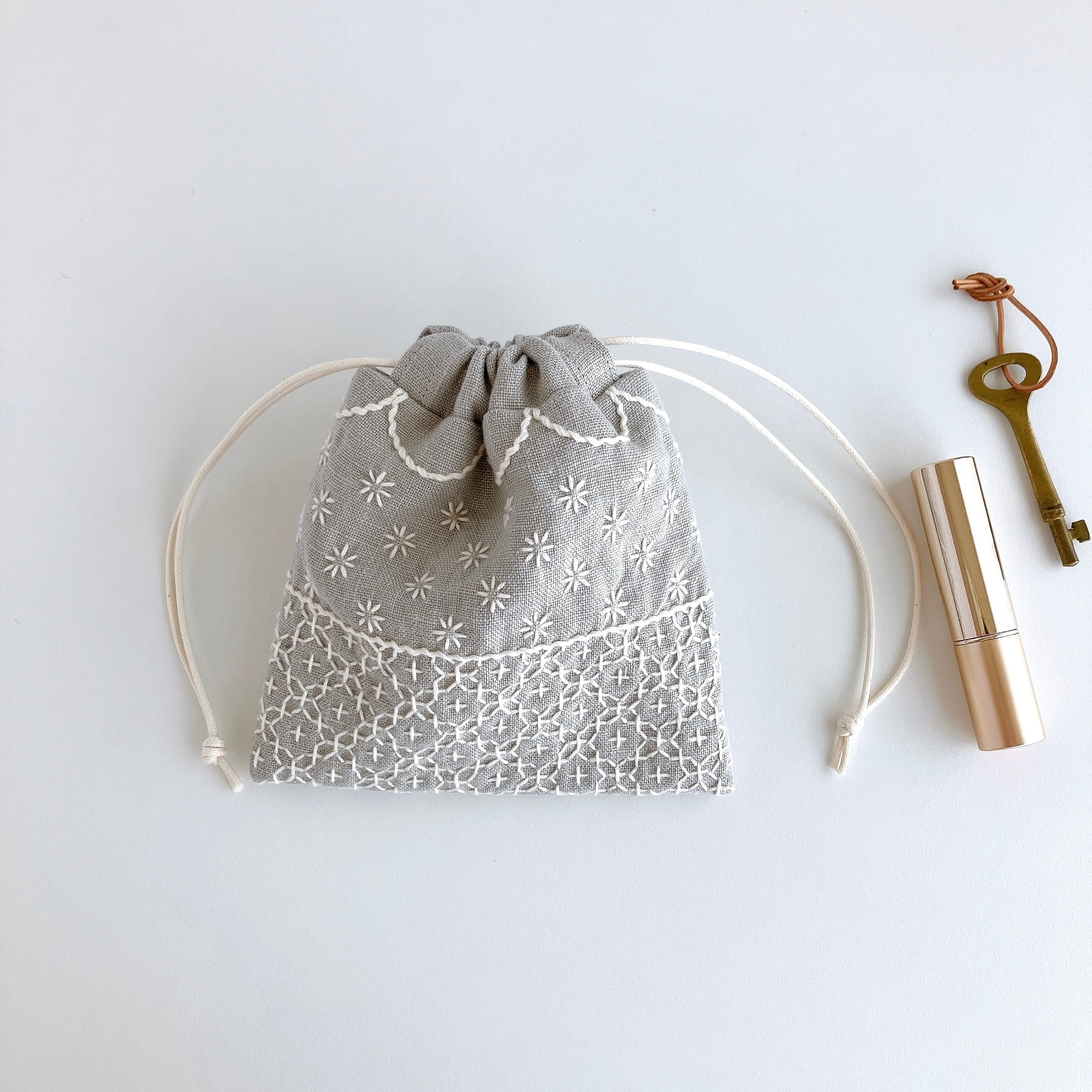 ライトグレー色のリネン生地に刺し子をして作った、小さな巾着袋です。