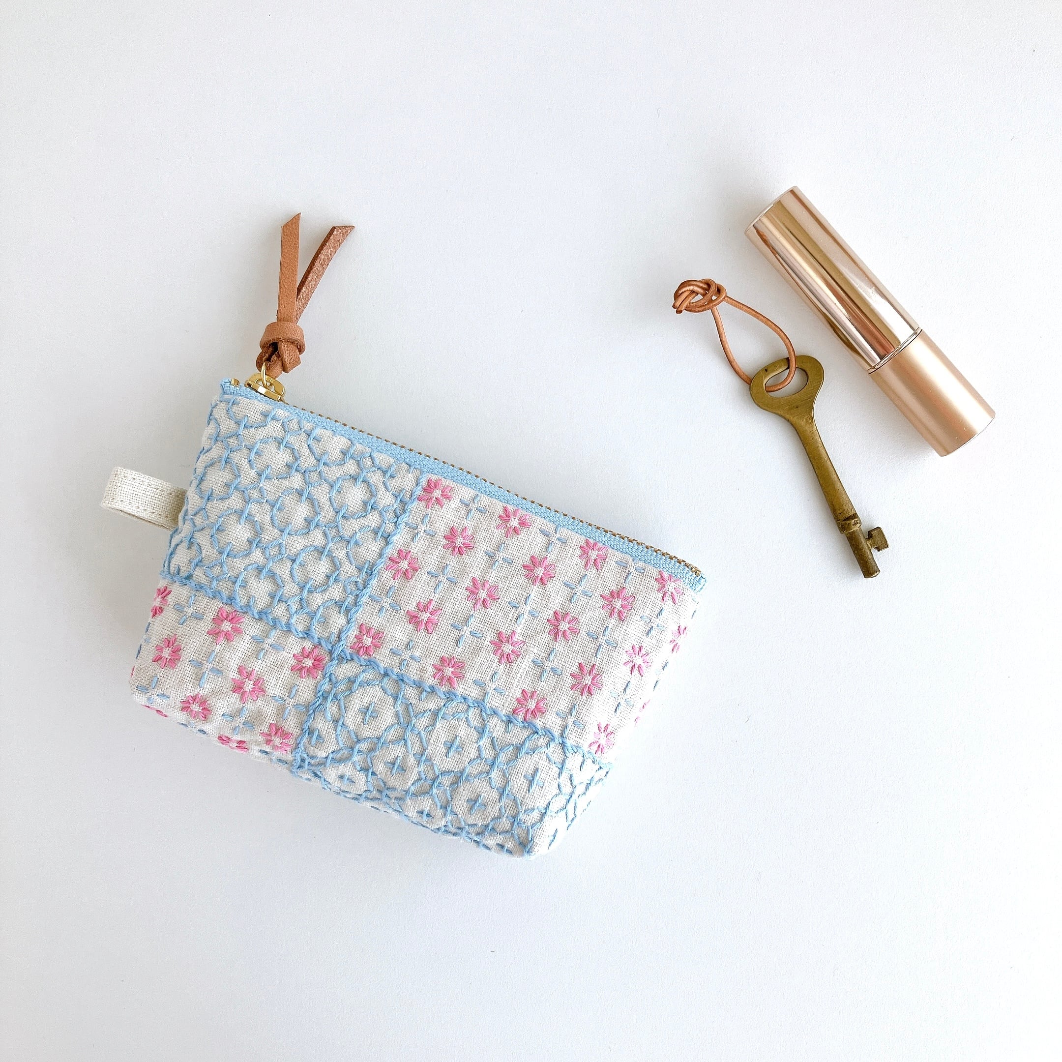 アイボリー色のリネン生地に、刺し子をして作ったファスナーポーチです。