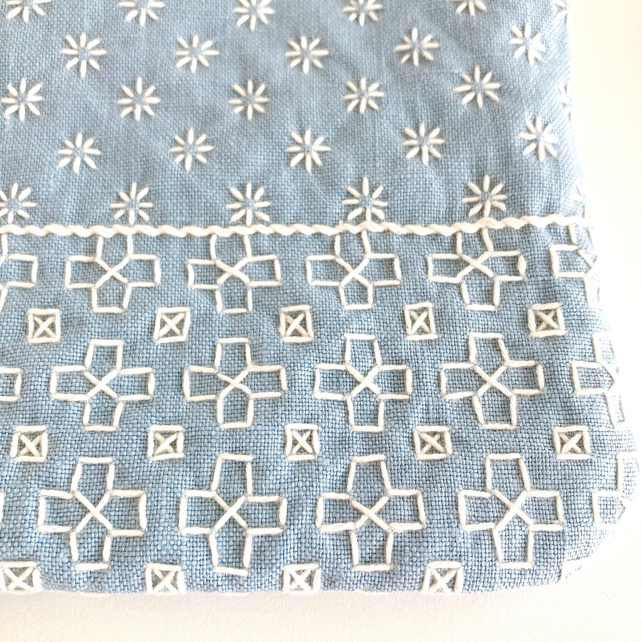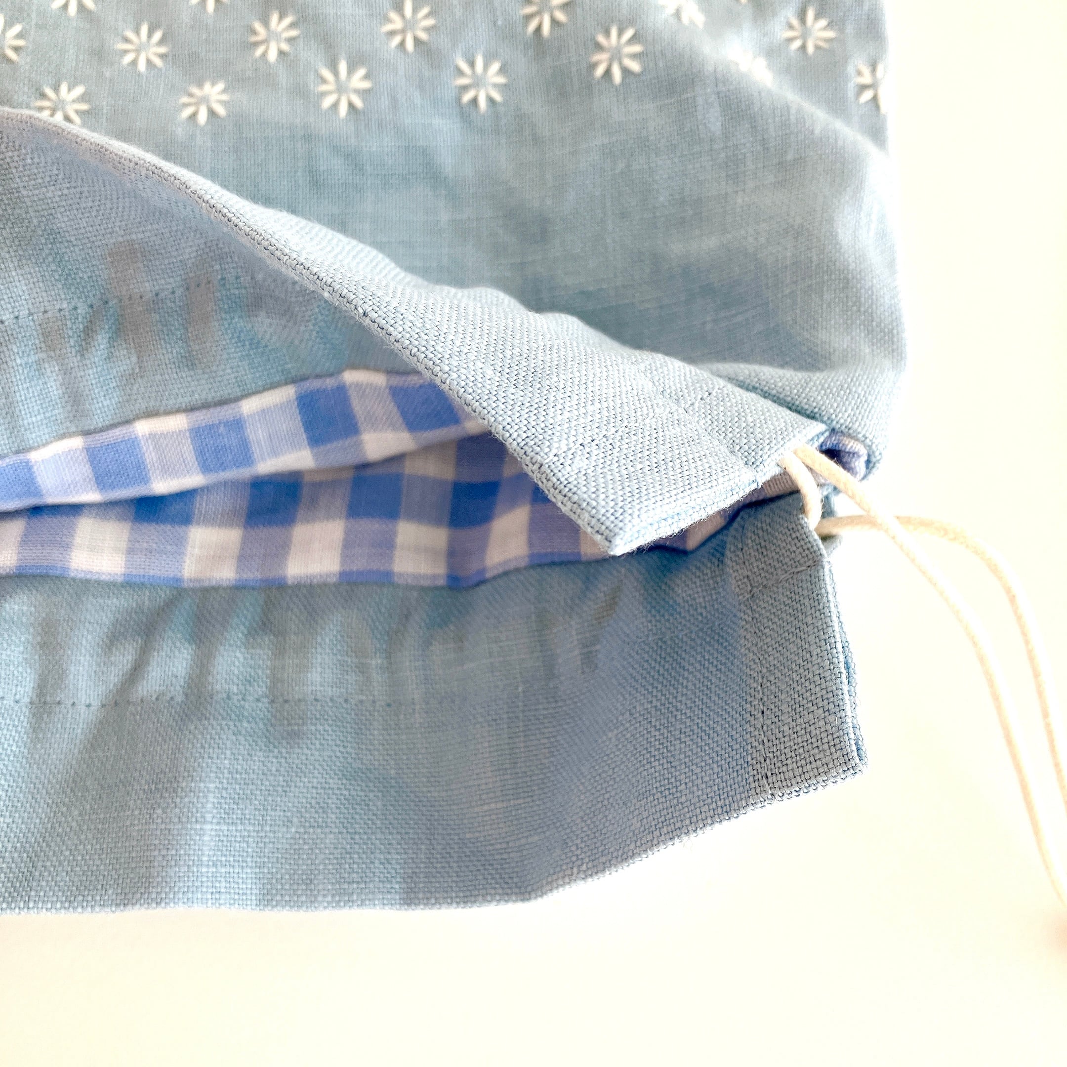 ライトブルー色のリネン生地に、刺し子をして制作した巾着袋です。