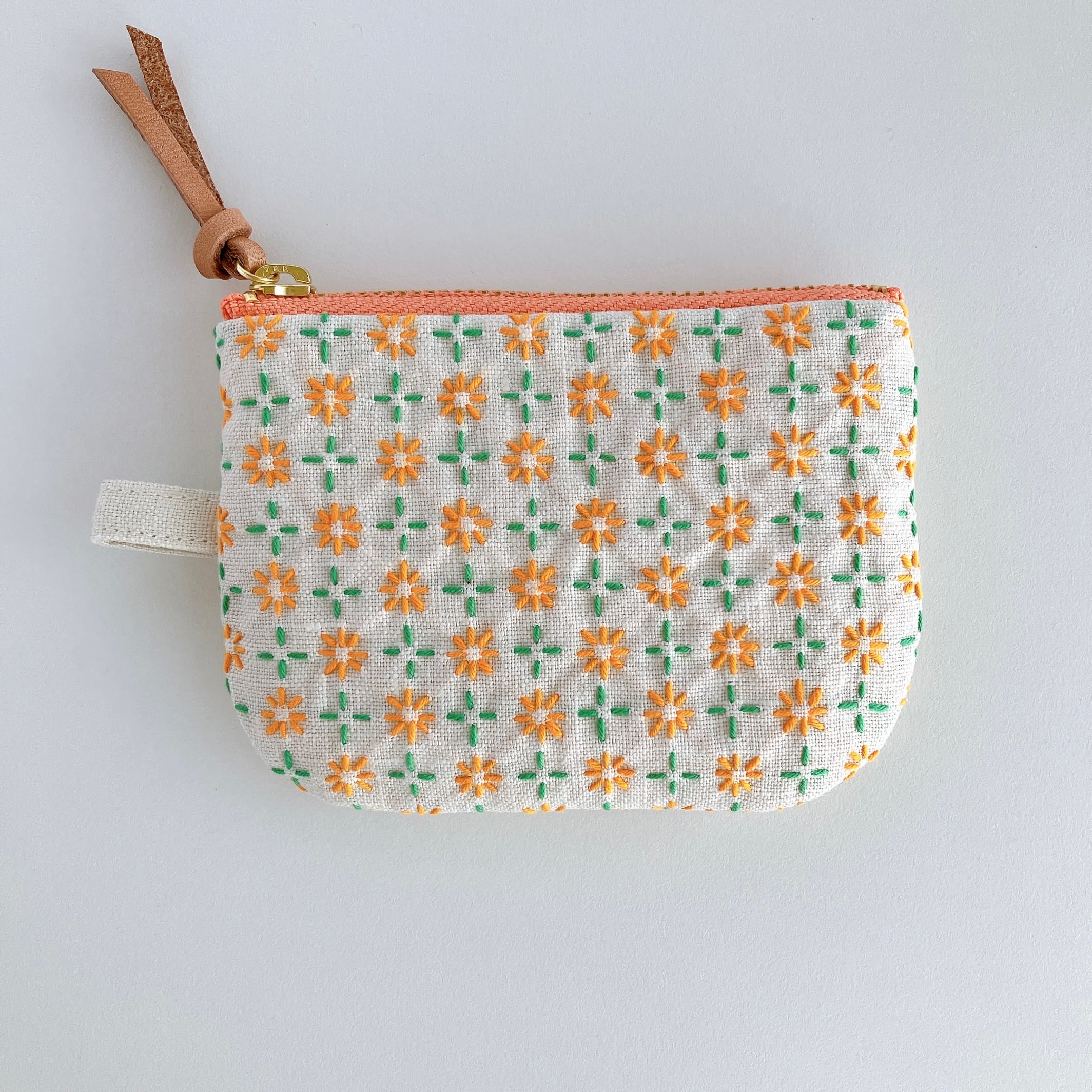 アイボリー色のリネン生地に刺し子をして作った、小さなファスナーポーチです。