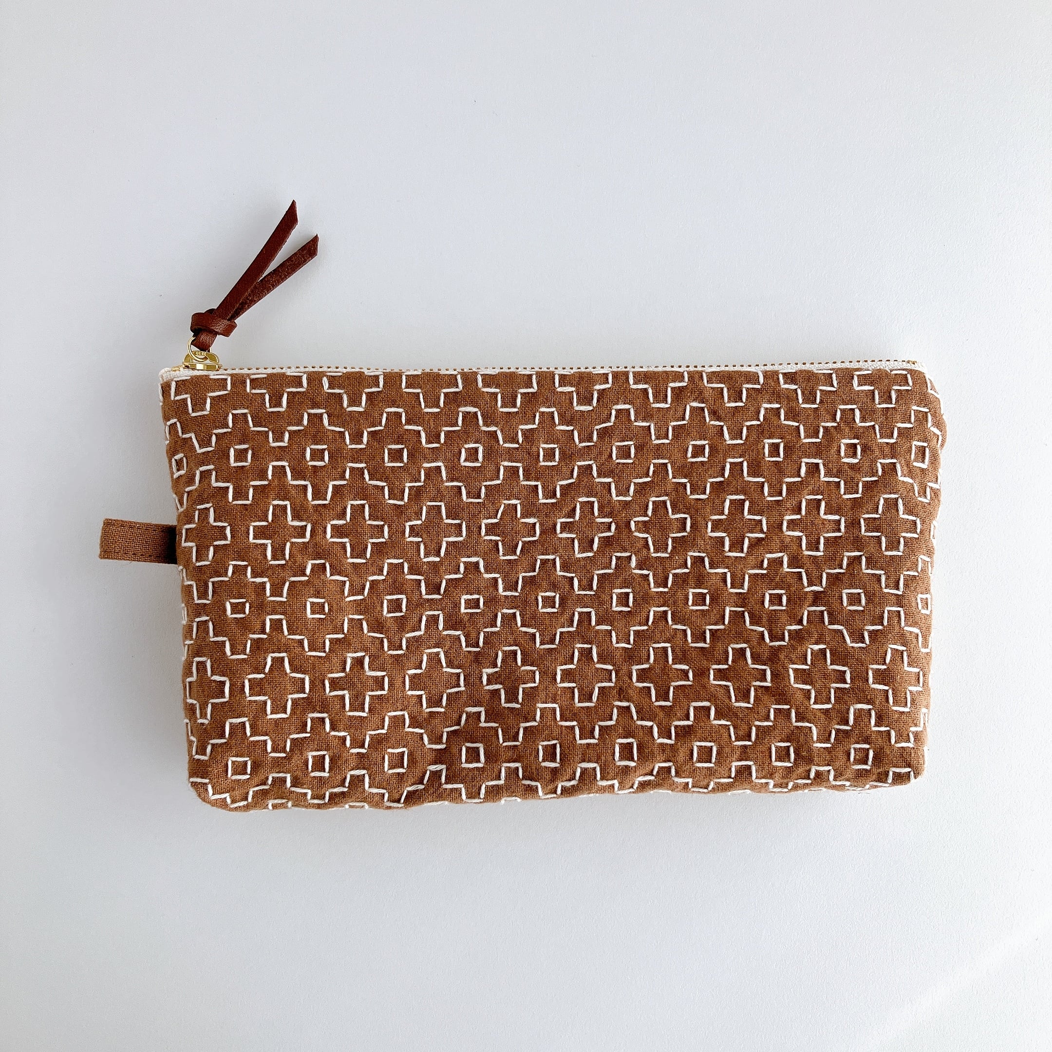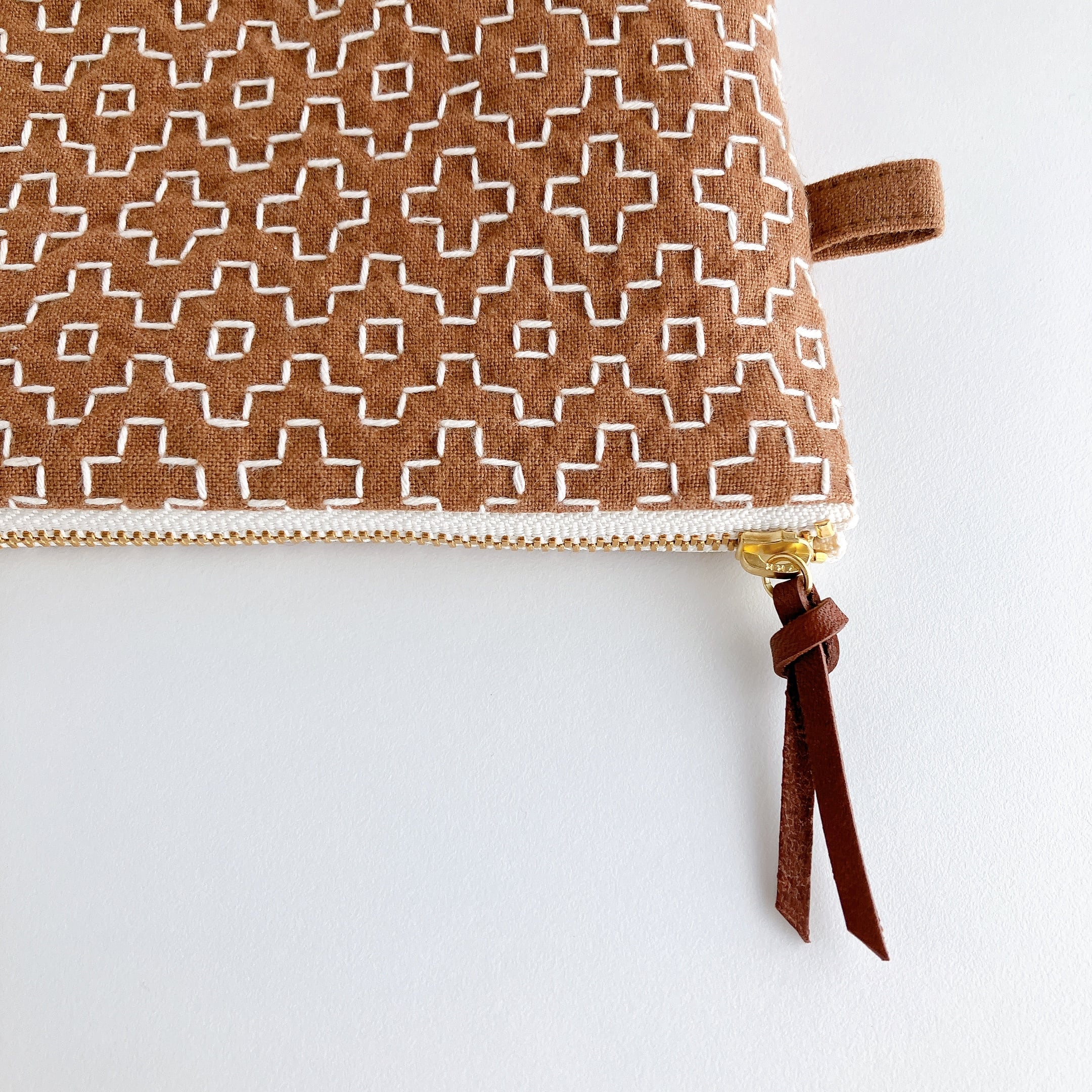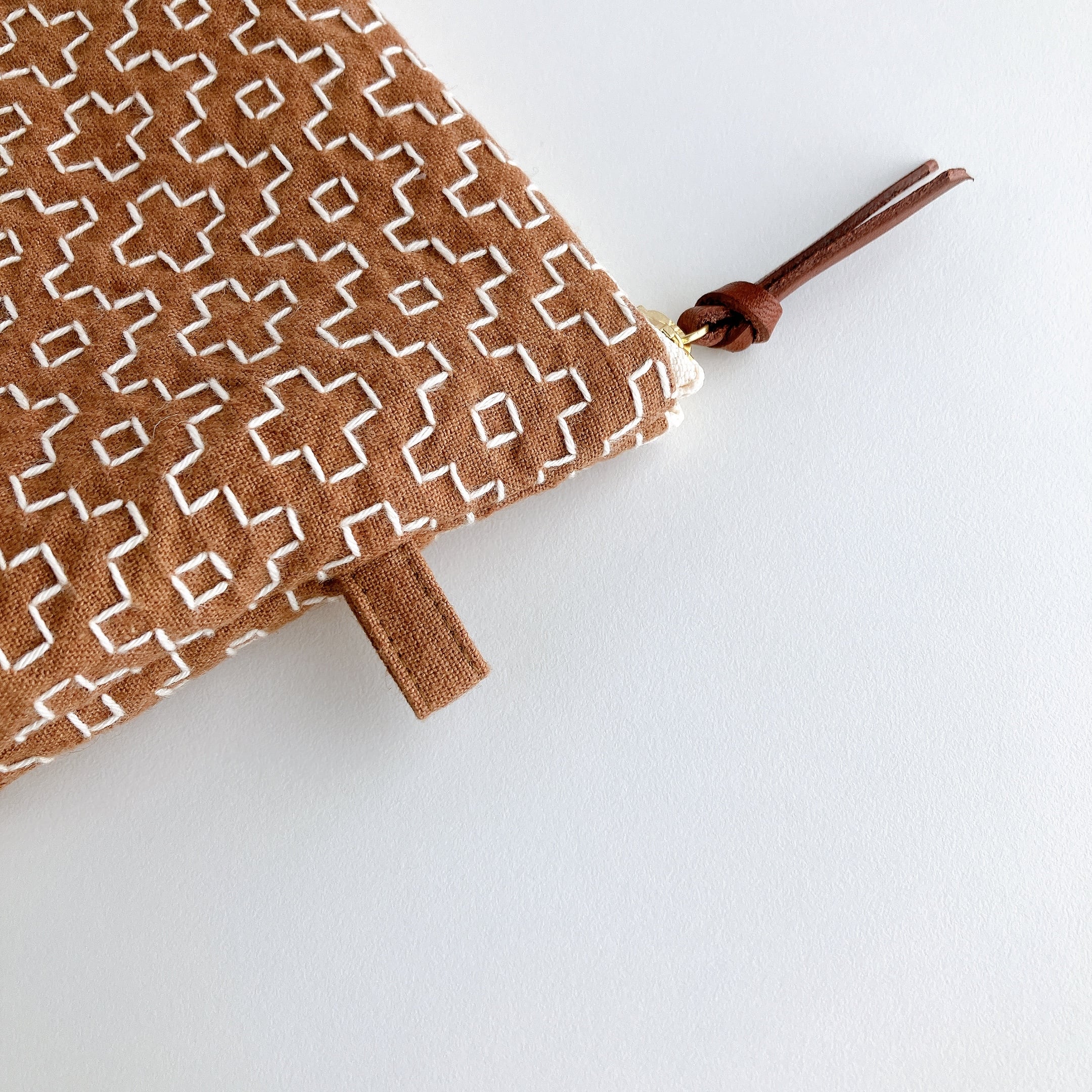 ブラウン色のコットンリネン生地に、刺し子をして作ったファスナーポーチです。