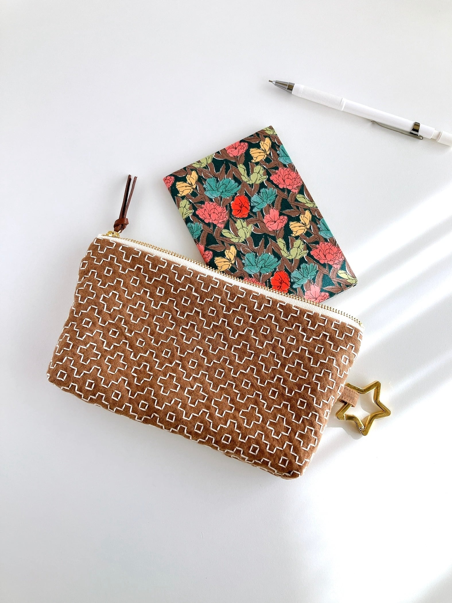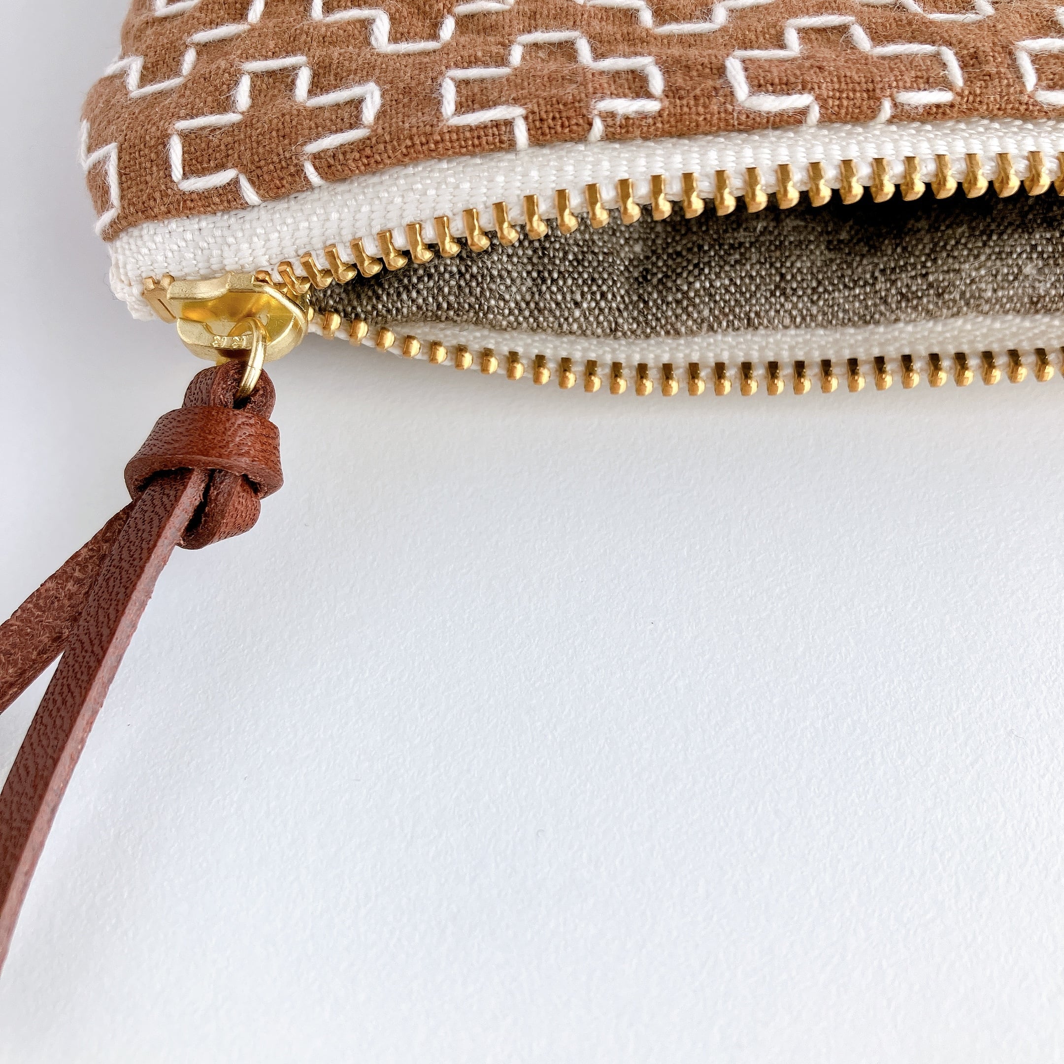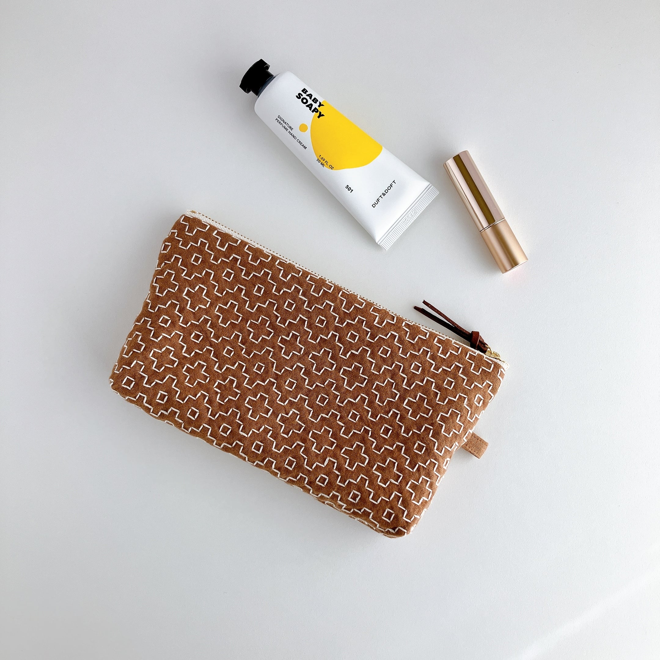 ブラウン色のコットンリネン生地に、刺し子をして作ったファスナーポーチです。