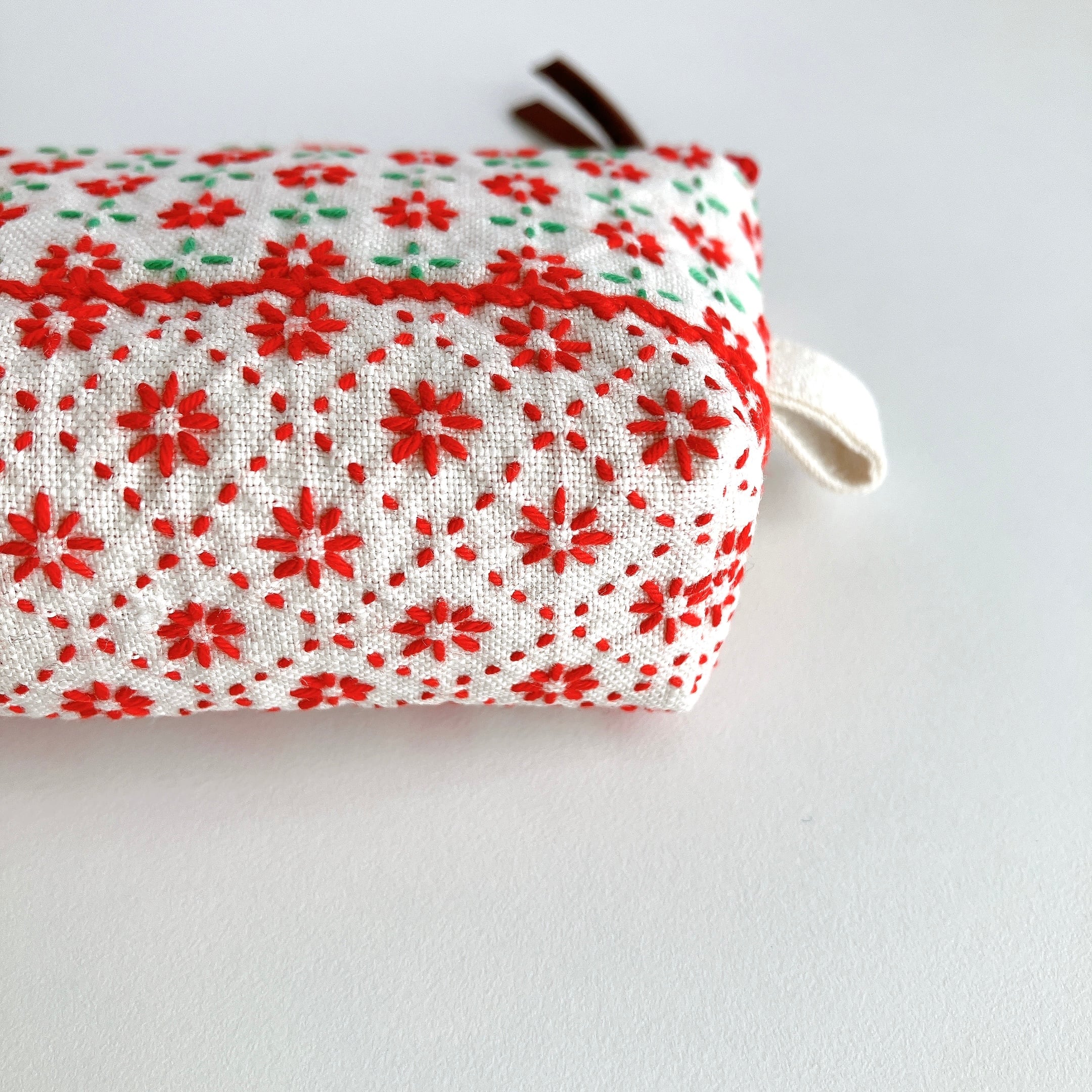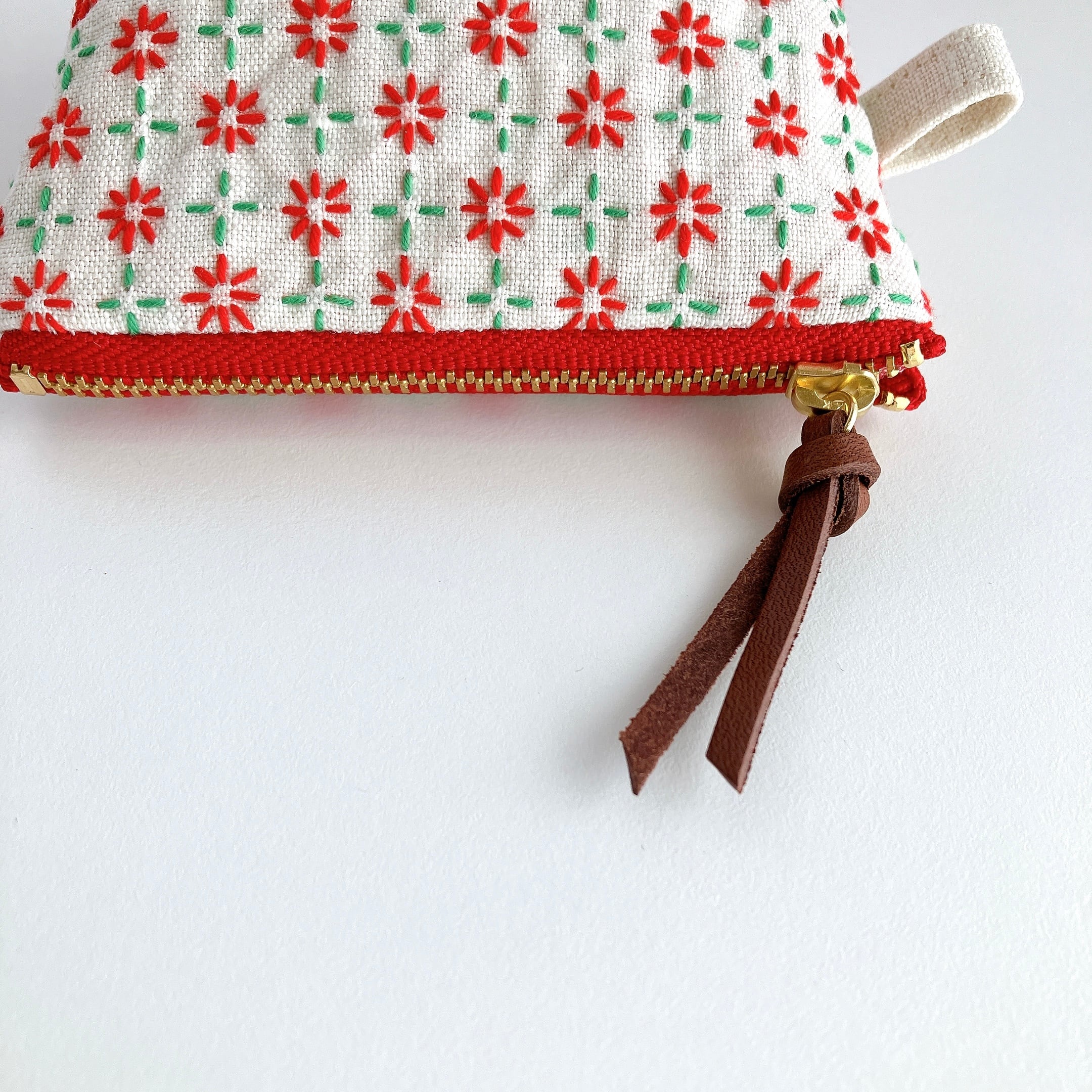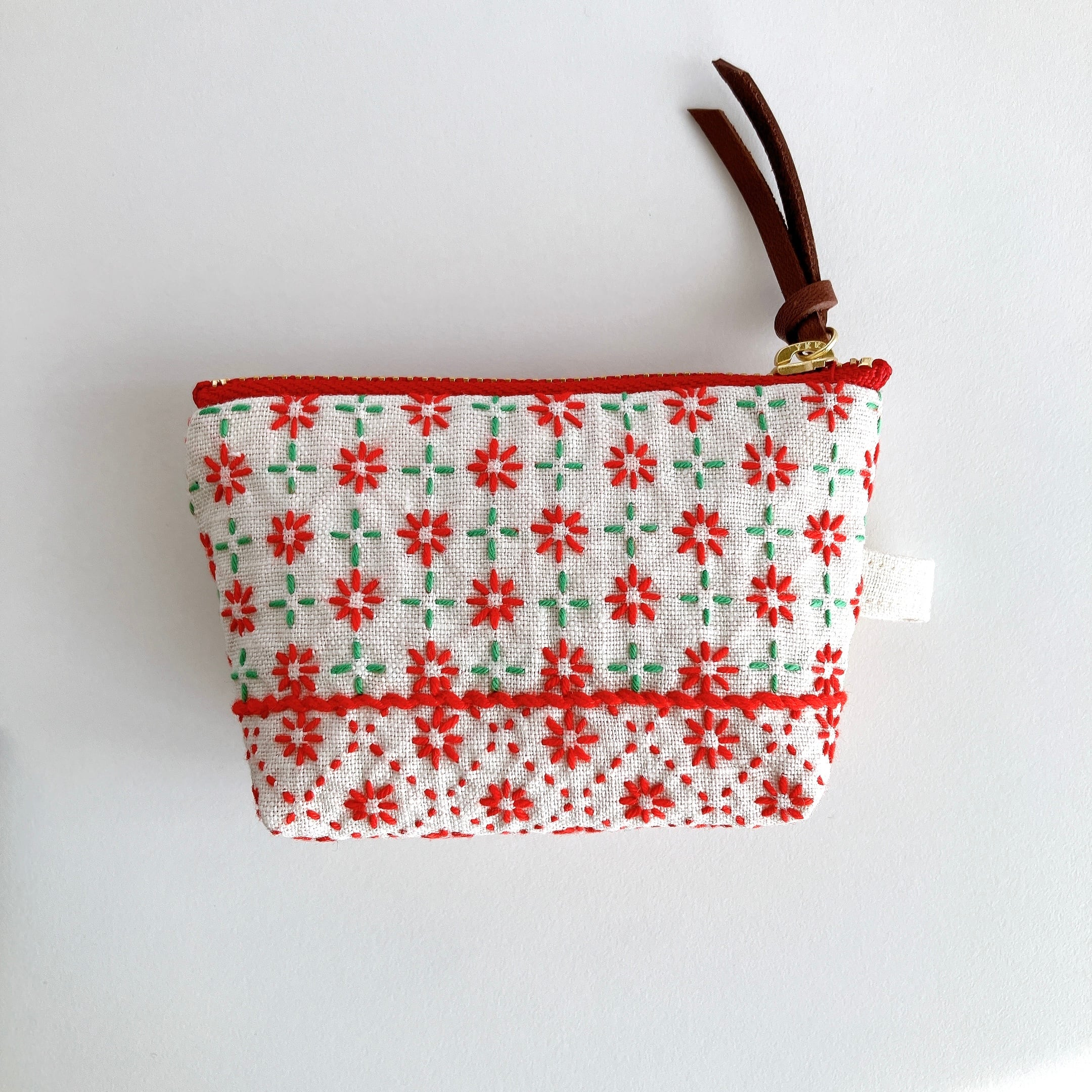 アイボリー色のリネン生地に刺し子をして作った、小さなファスナーポーチです。