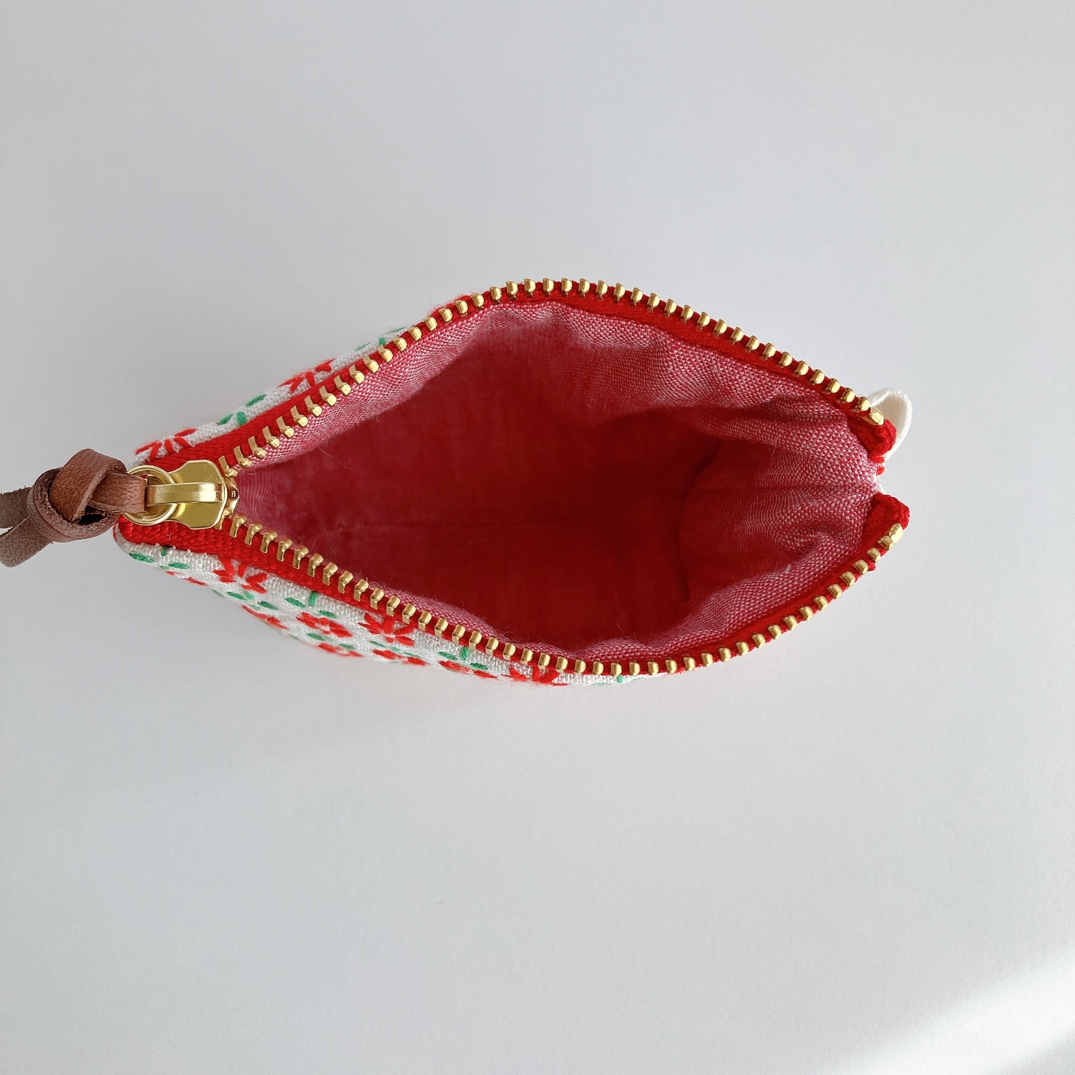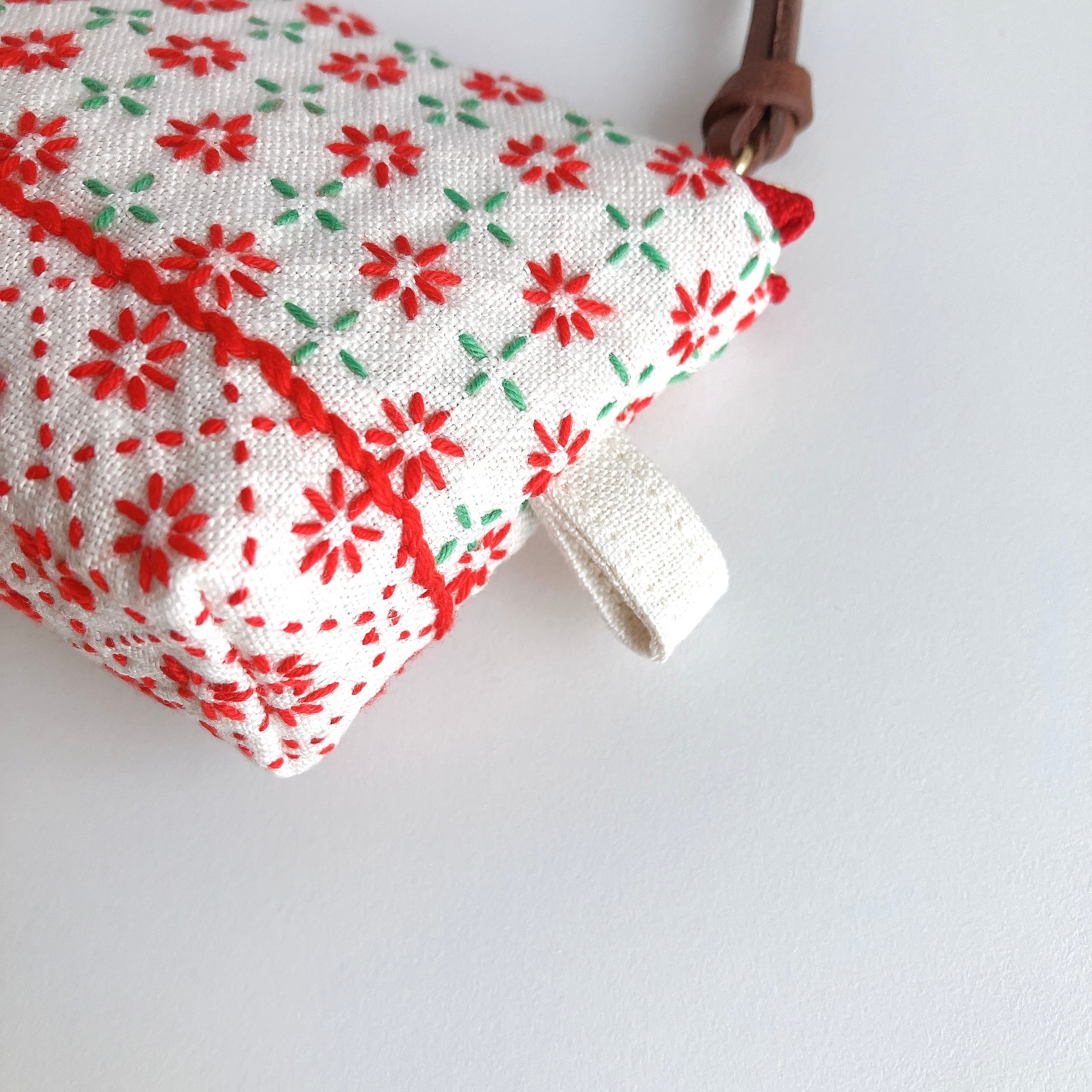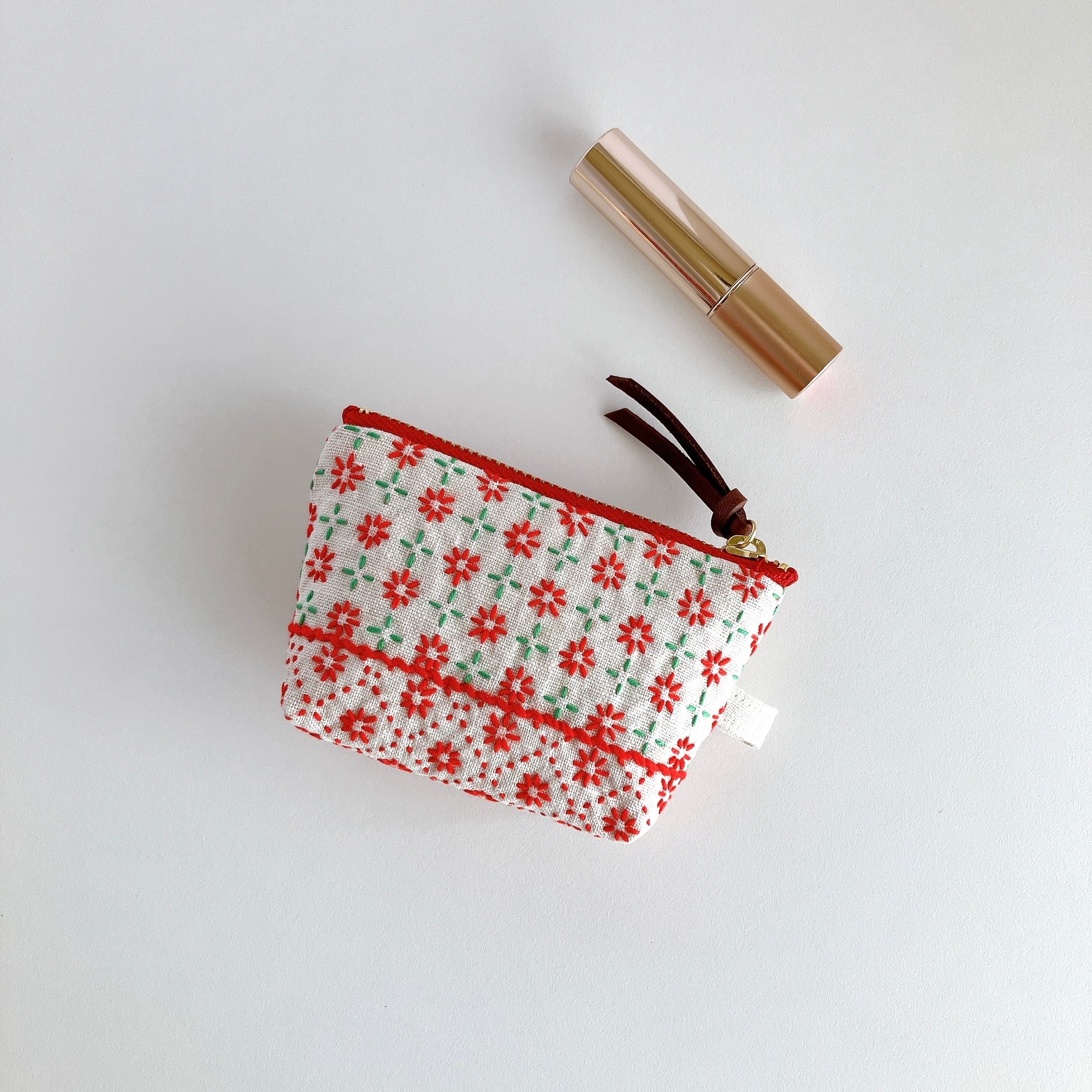 アイボリー色のリネン生地に刺し子をして作った、小さなファスナーポーチです。