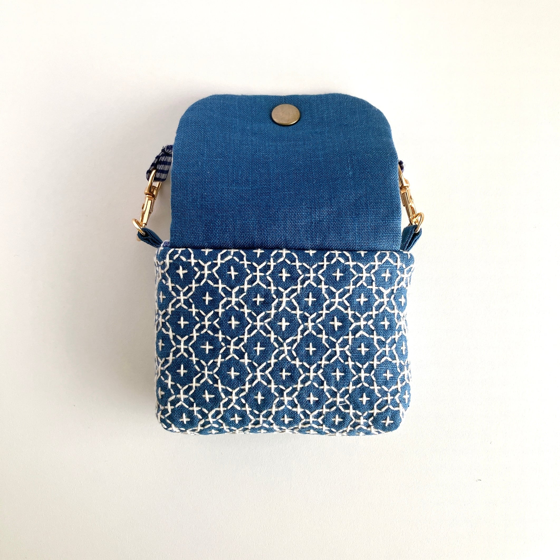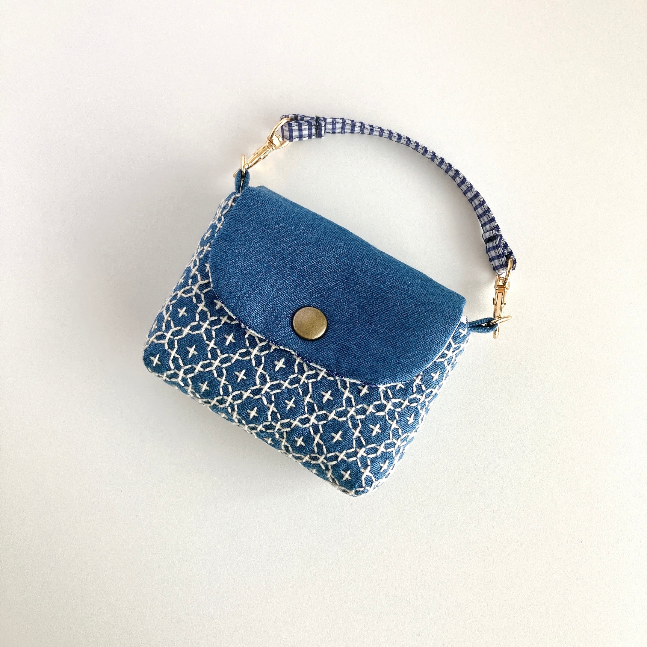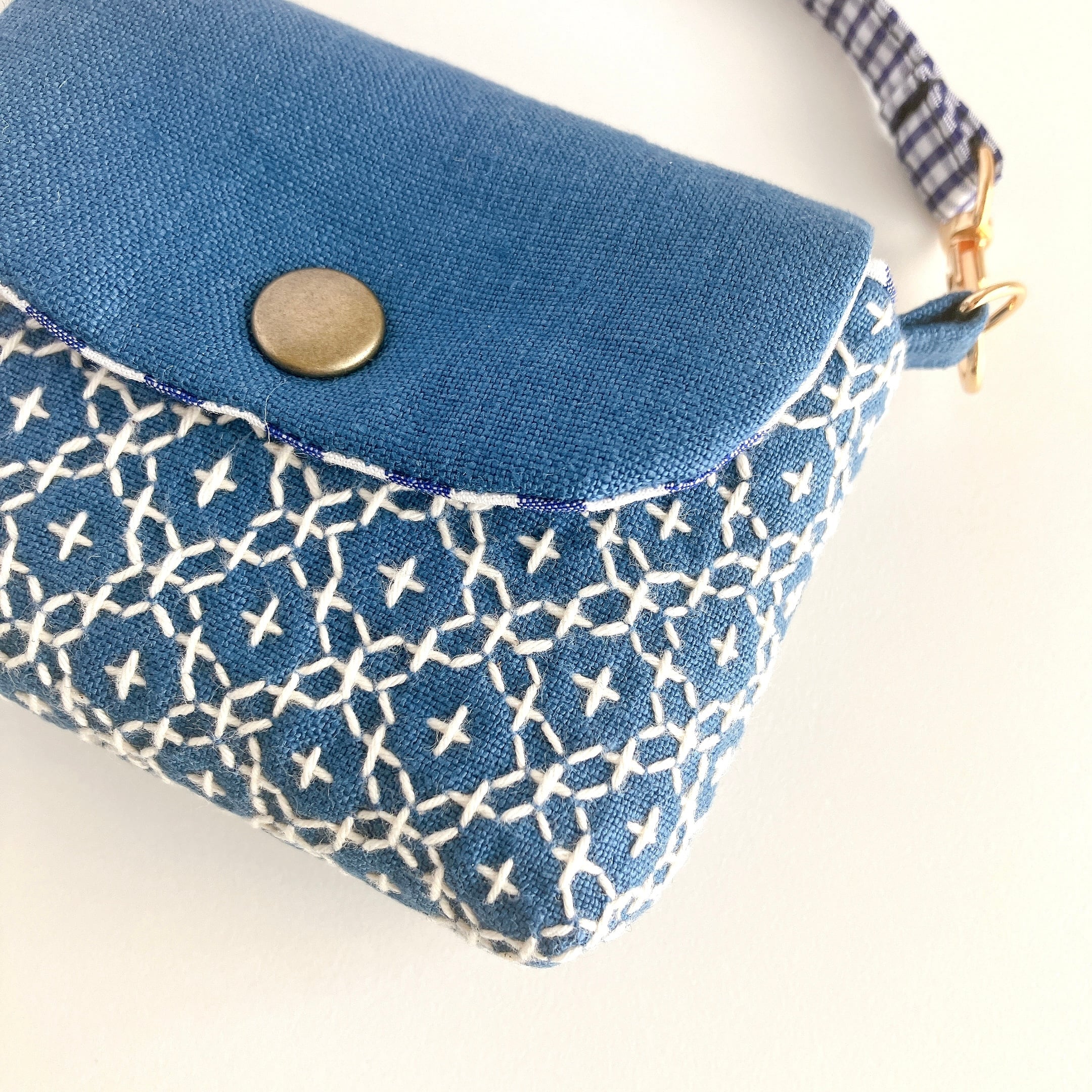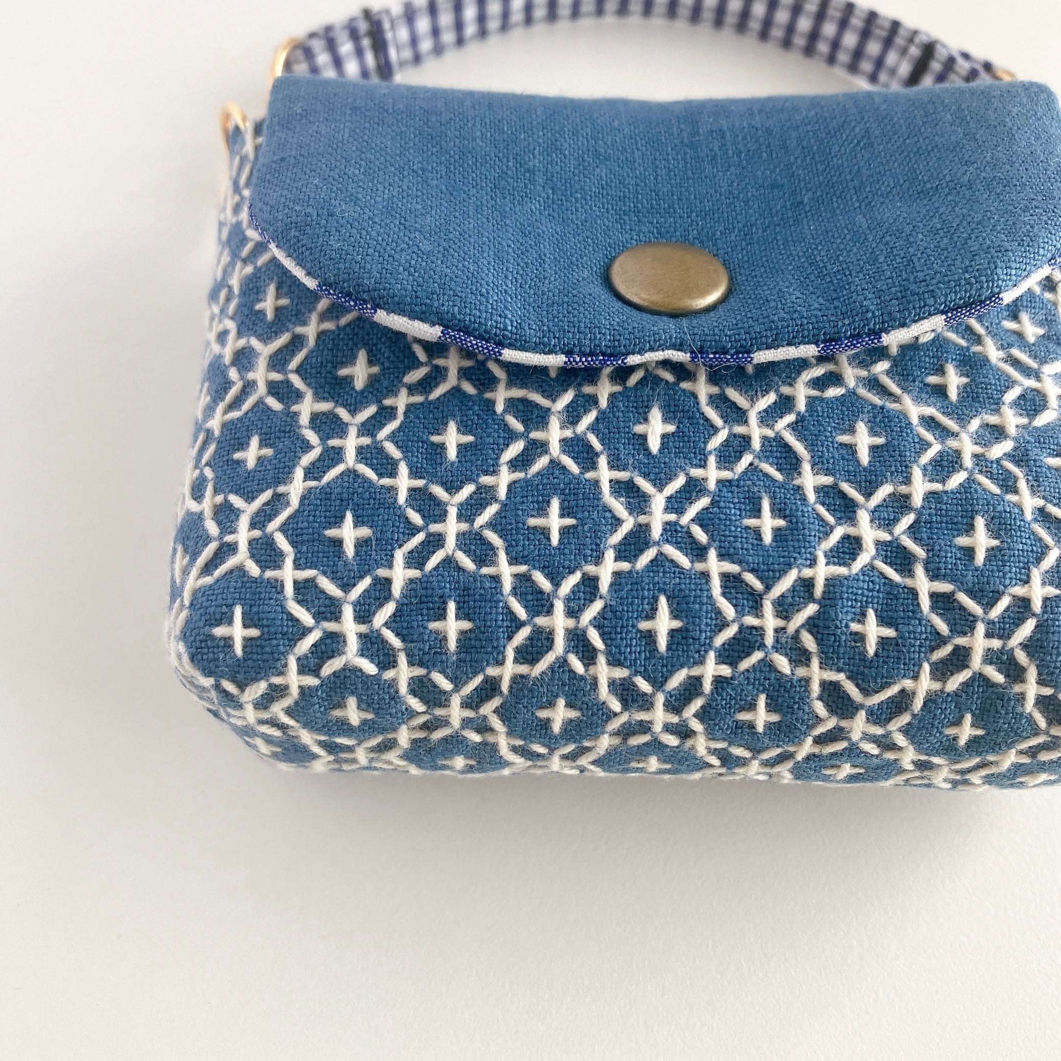 スモークブルー色のリネン生地に、刺し子をして作った小さなフラップポーチです。