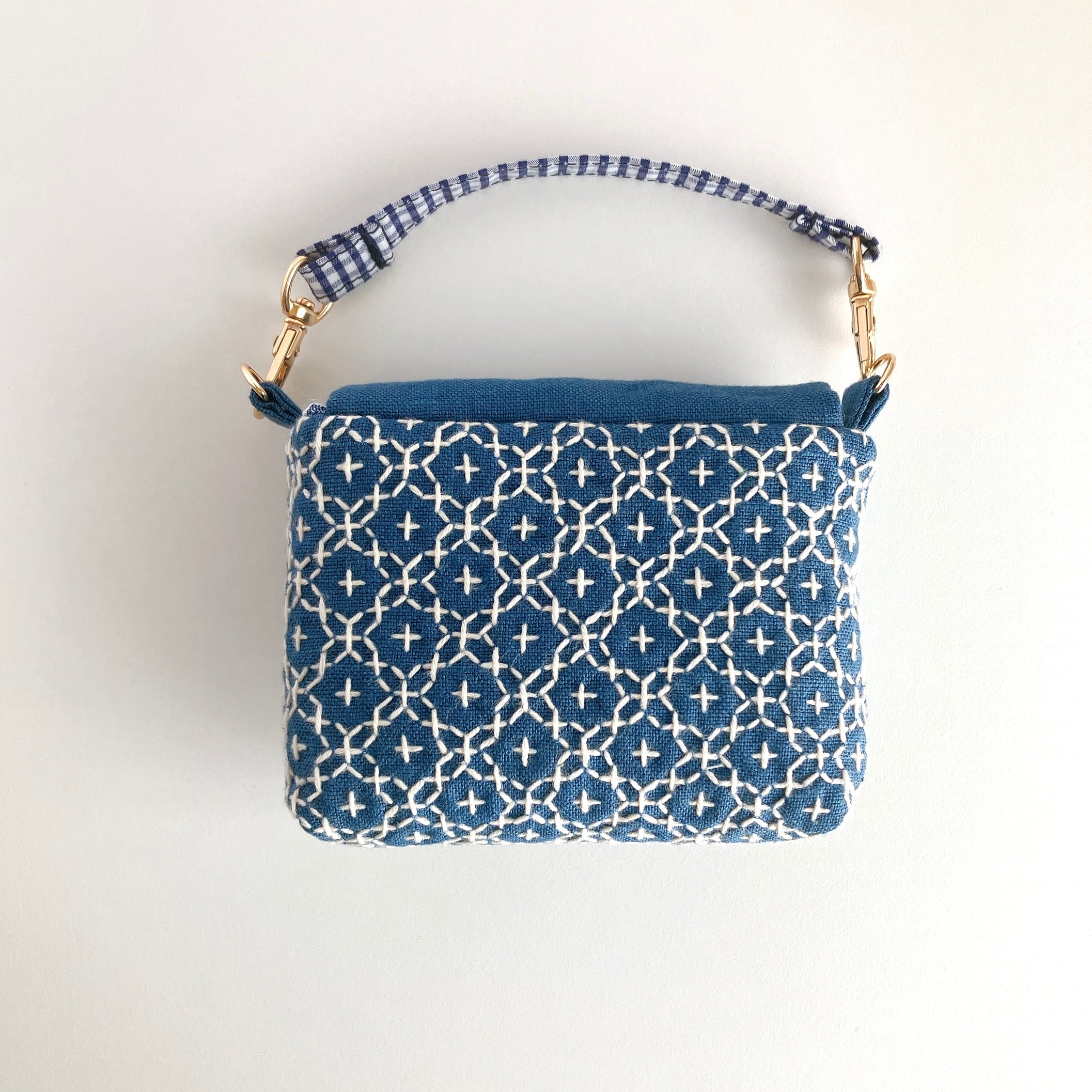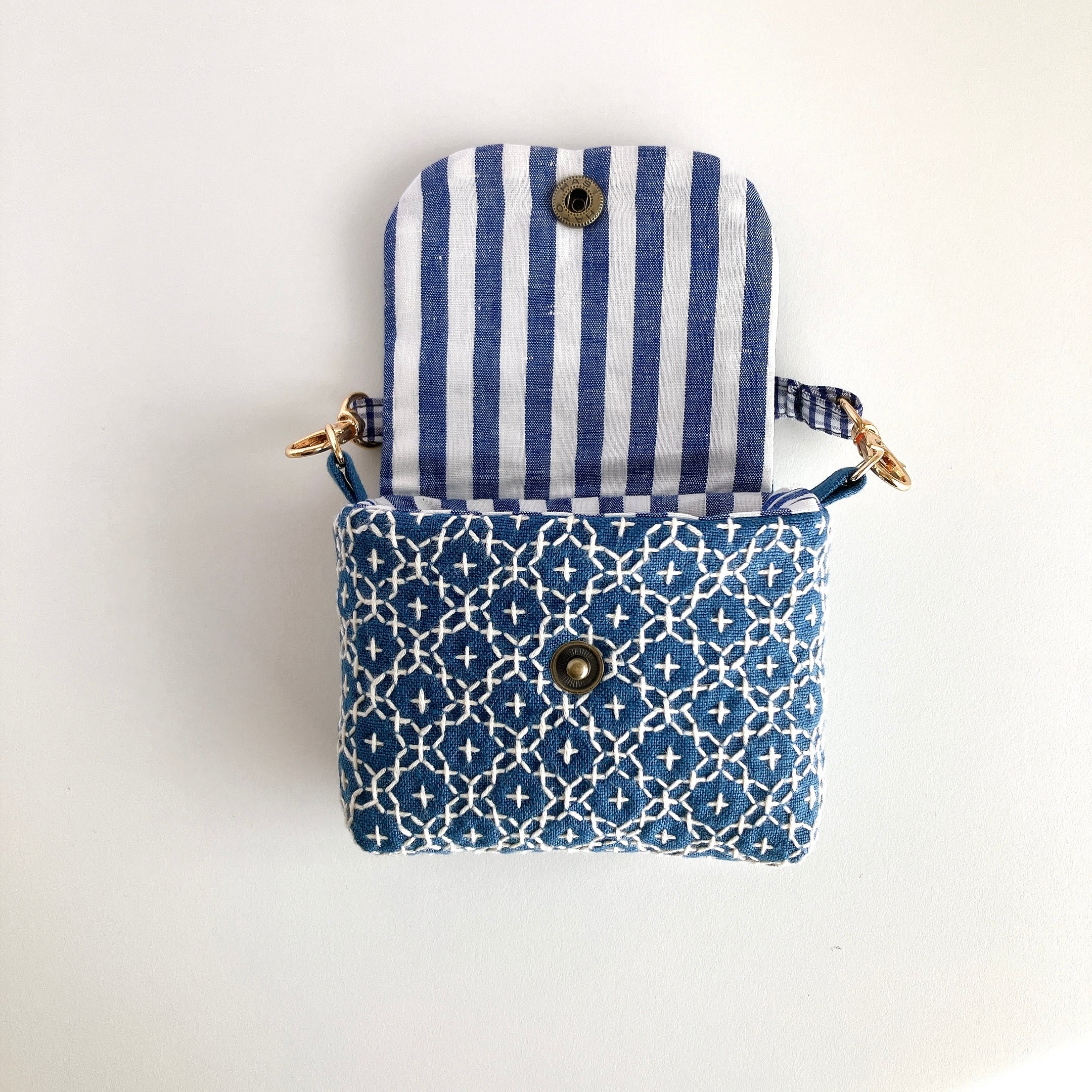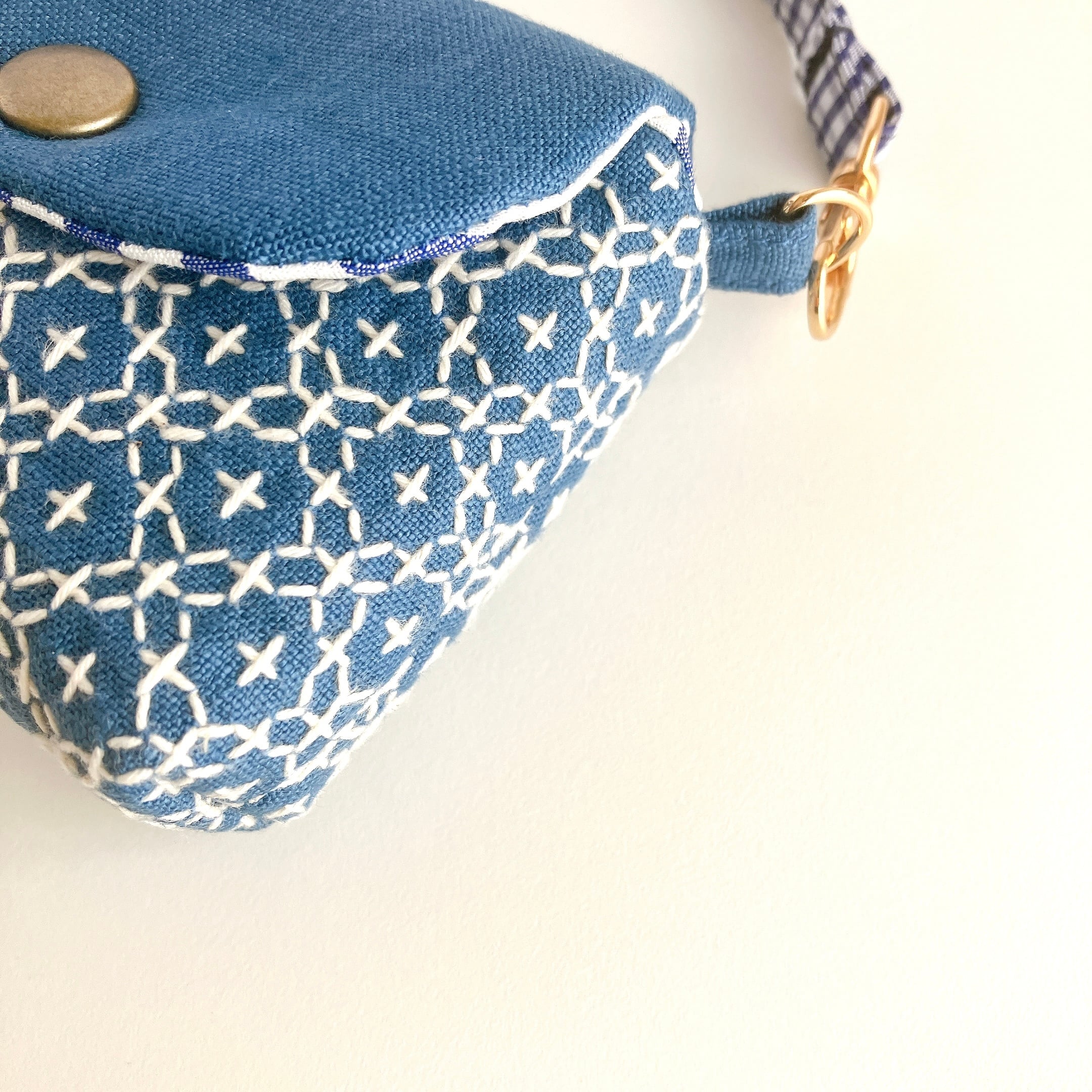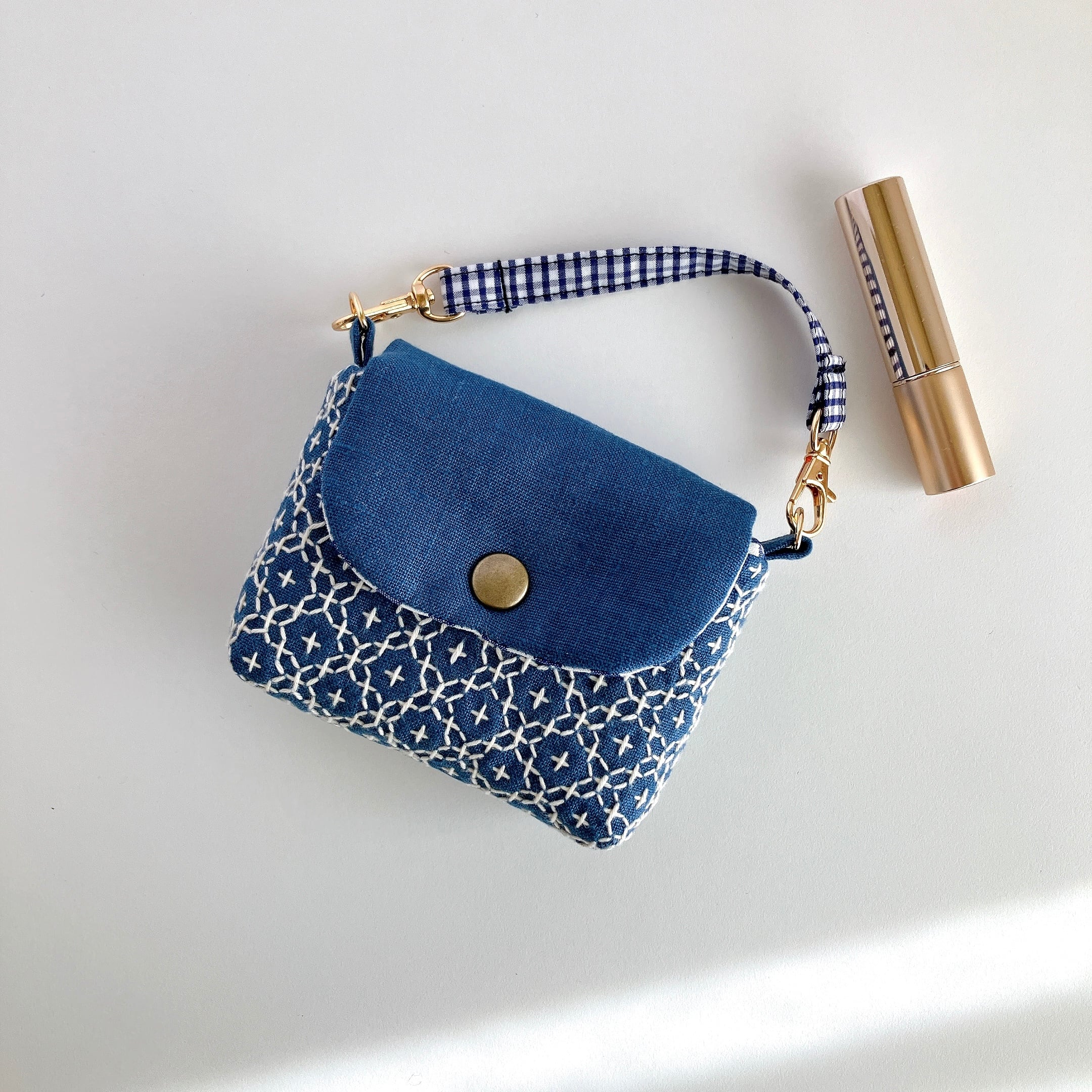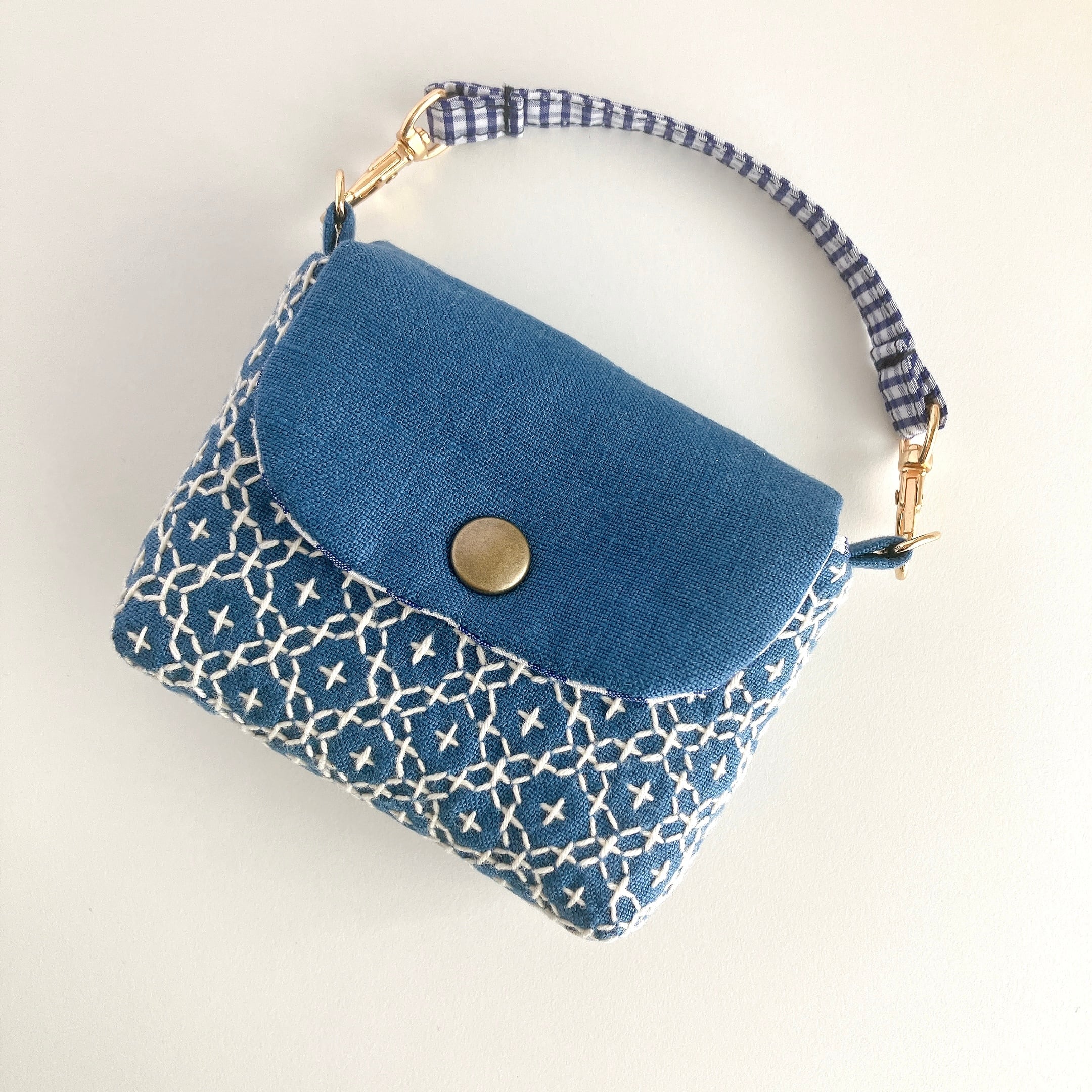 スモークブルー色のリネン生地に、刺し子をして作った小さなフラップポーチです。