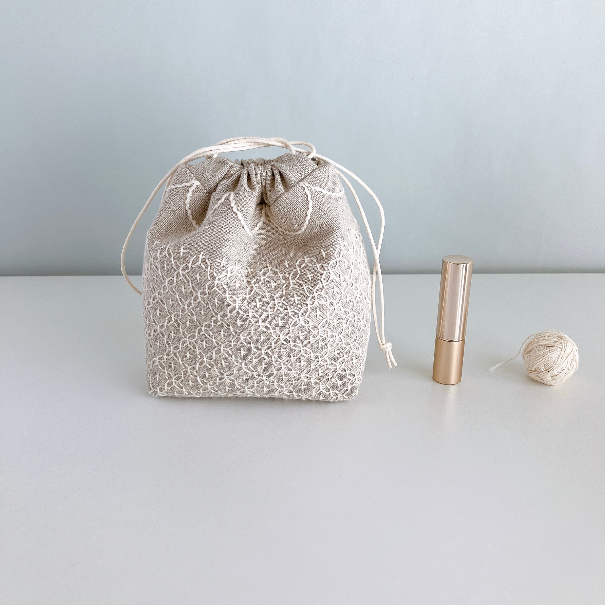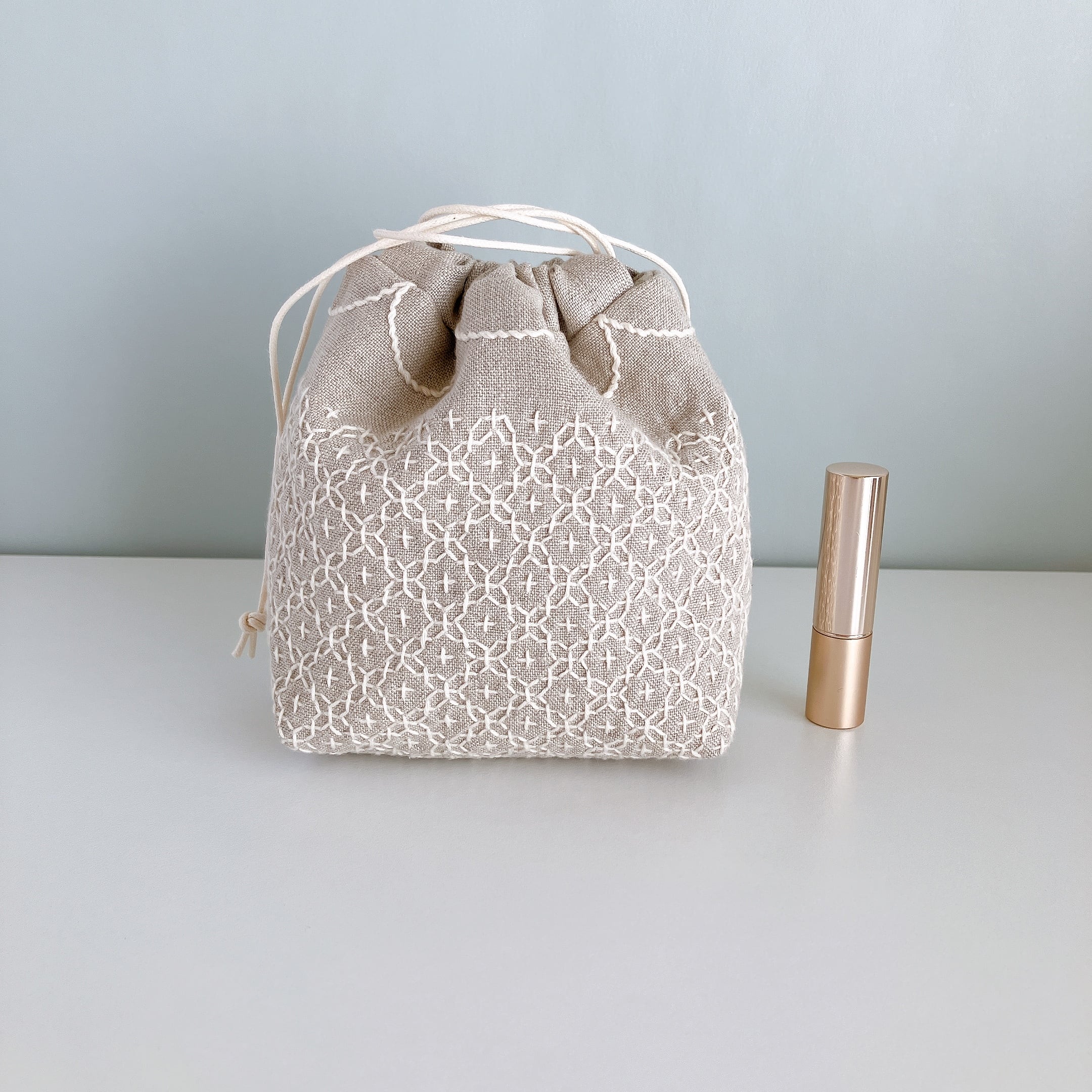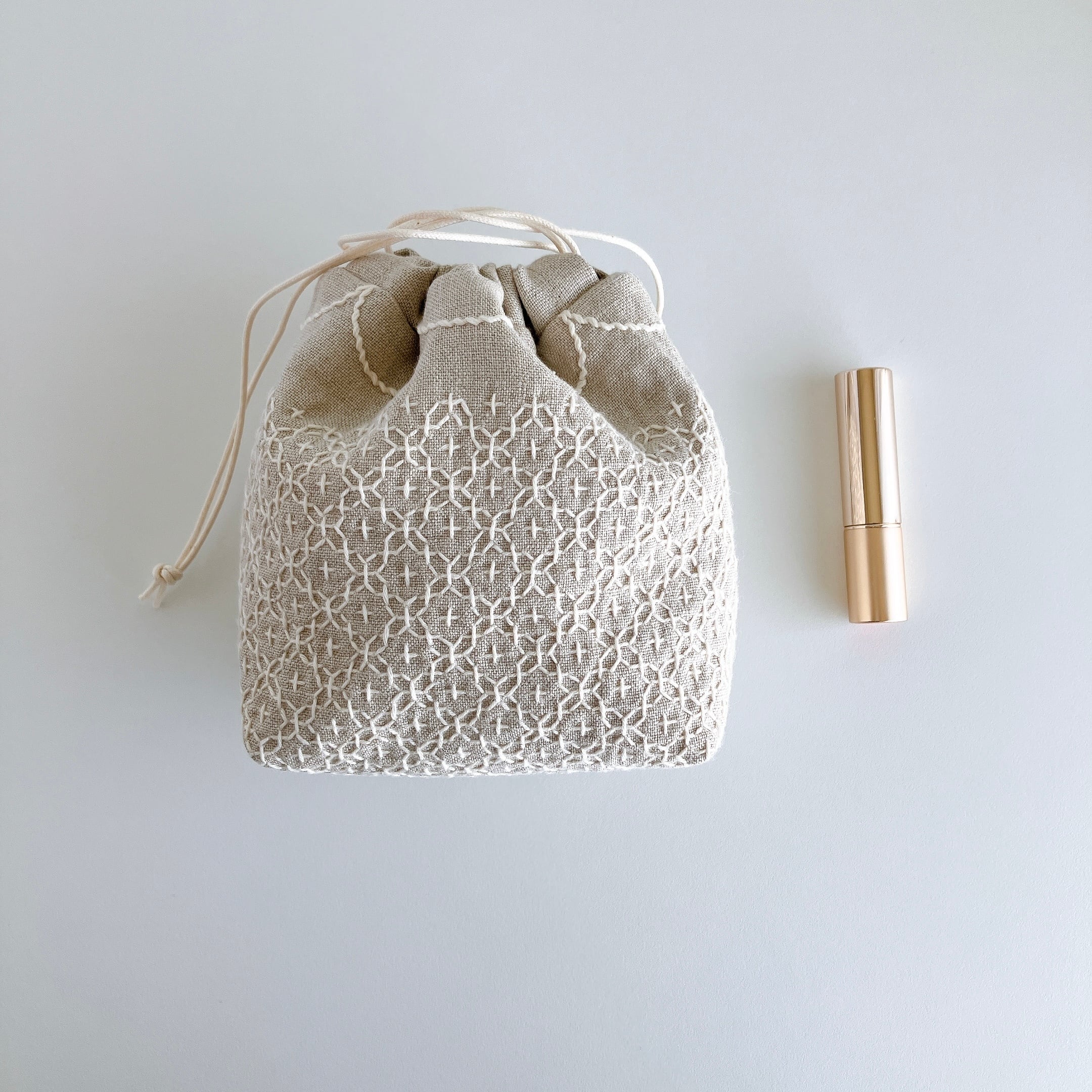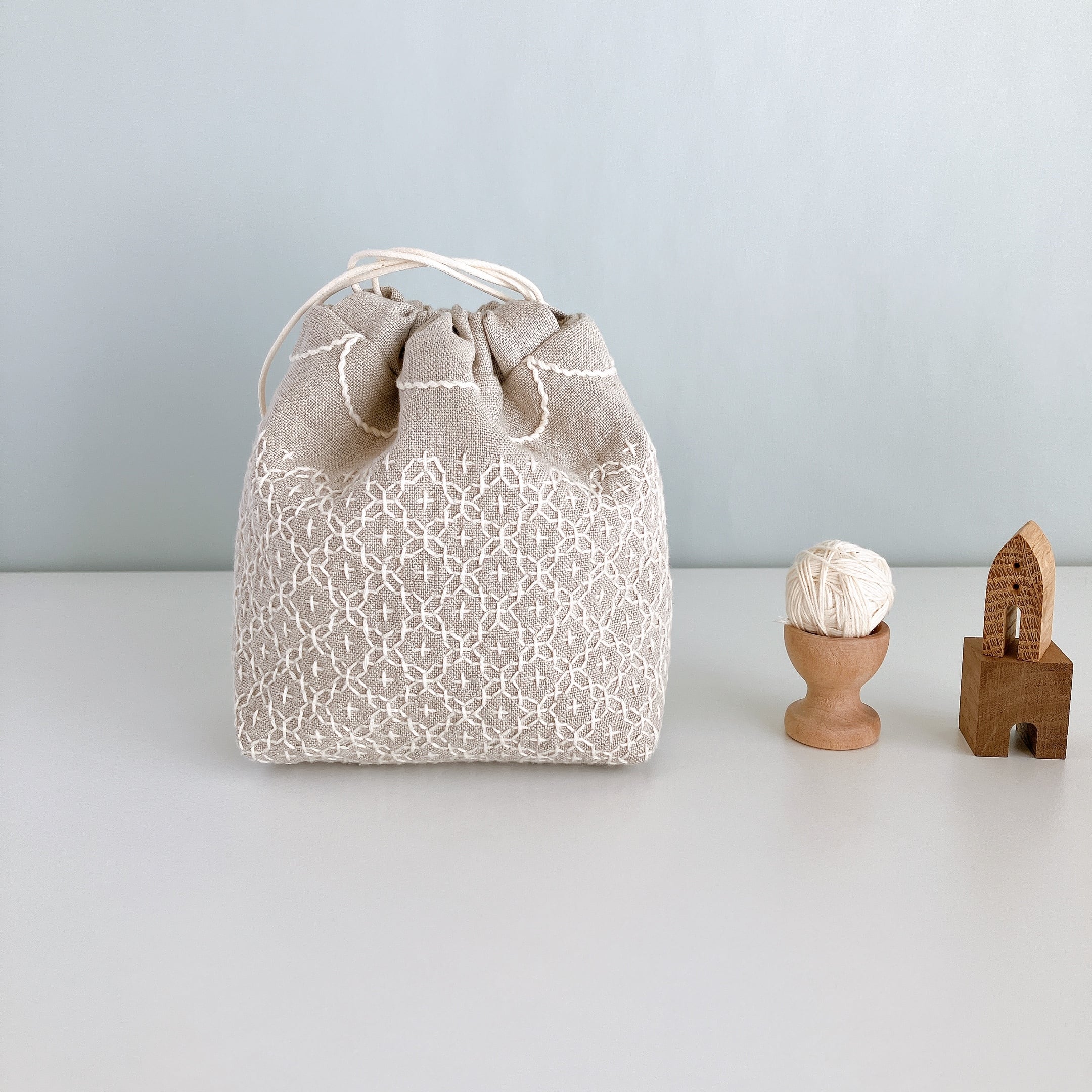 ベージュ色のリネン生地に刺し子をして作った巾着袋です。