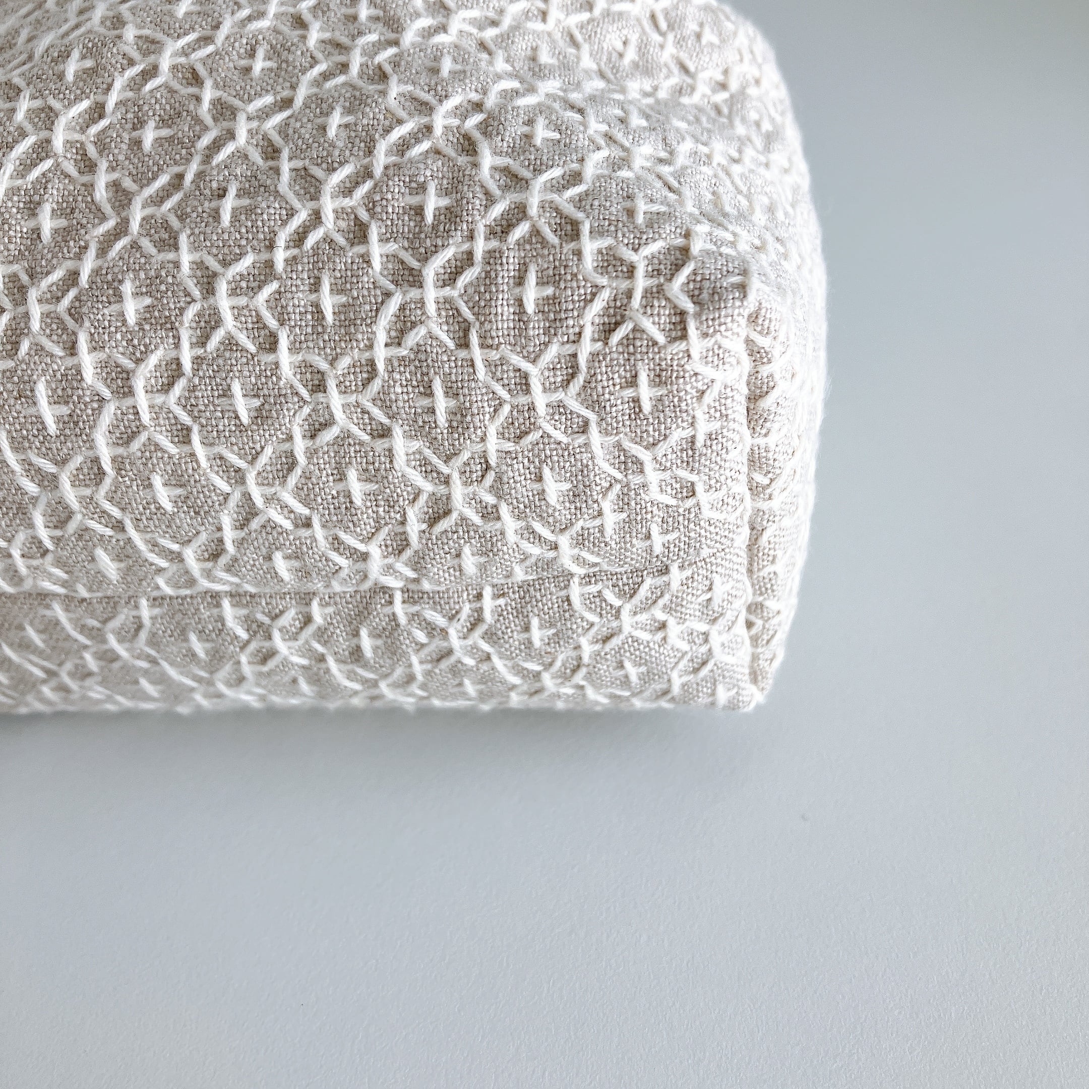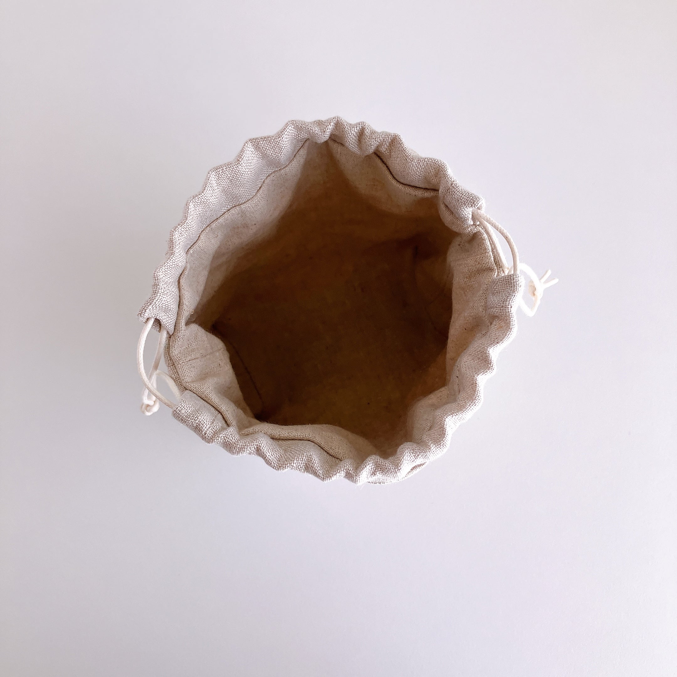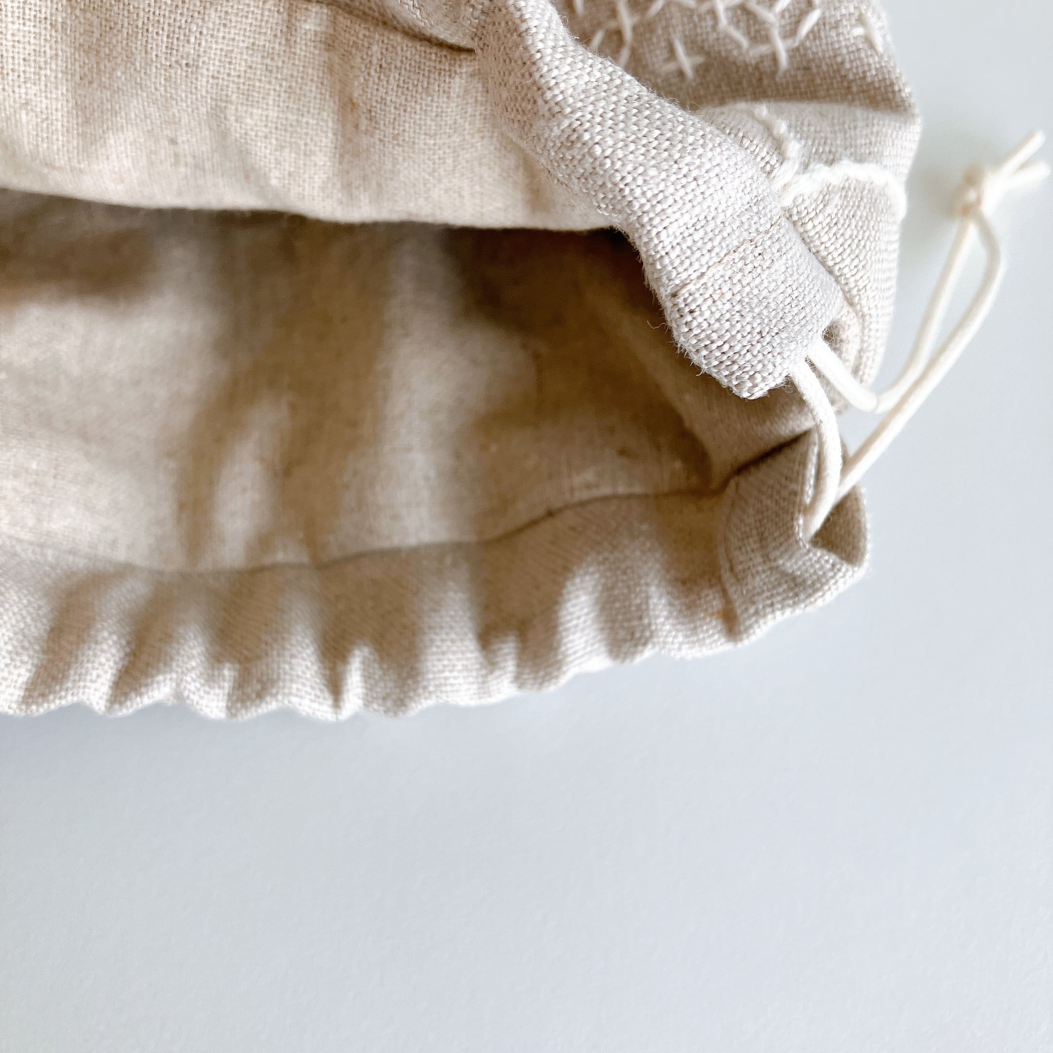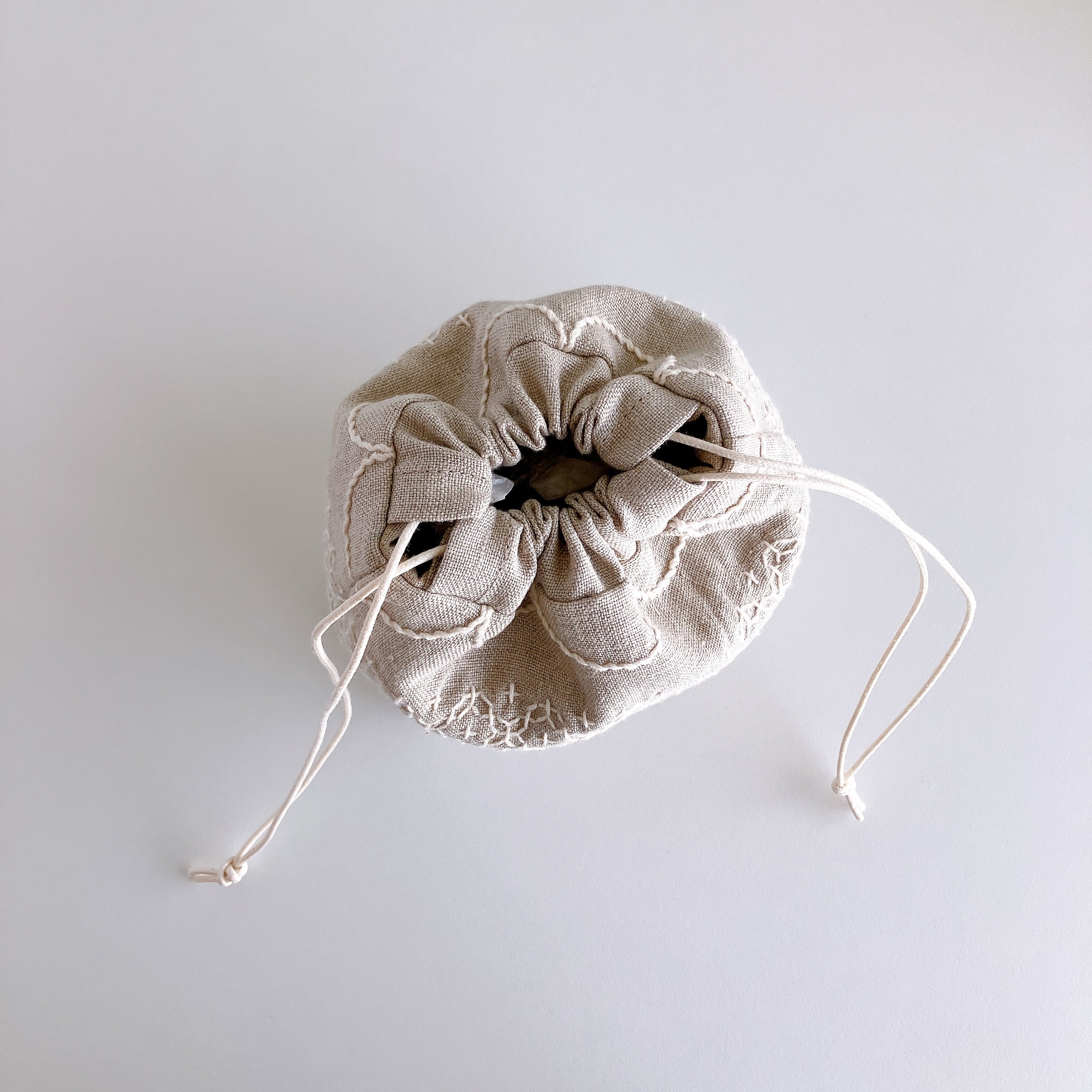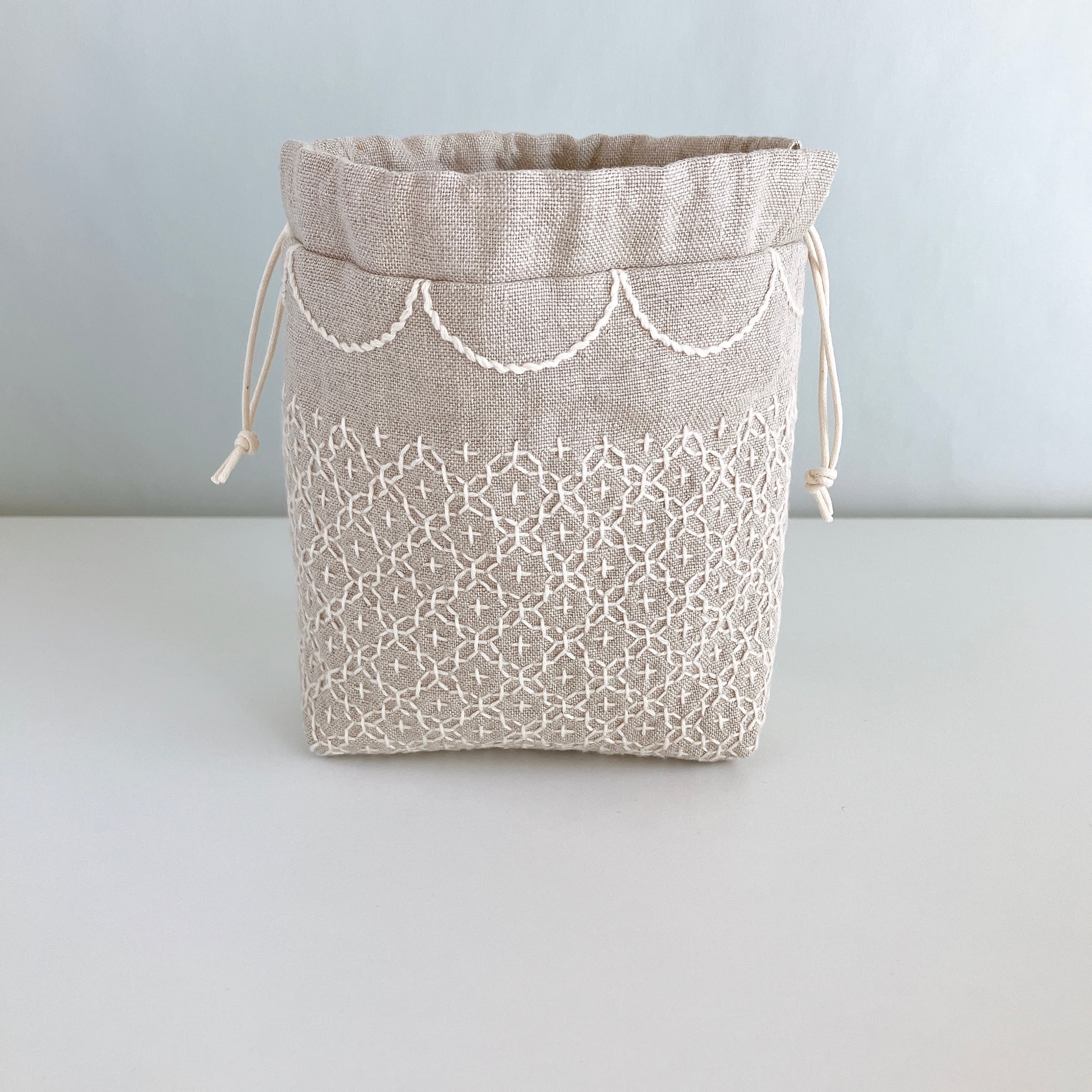 ベージュ色のリネン生地に刺し子をして作った巾着袋です。