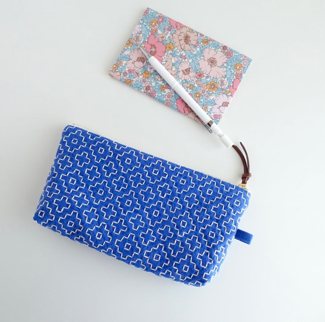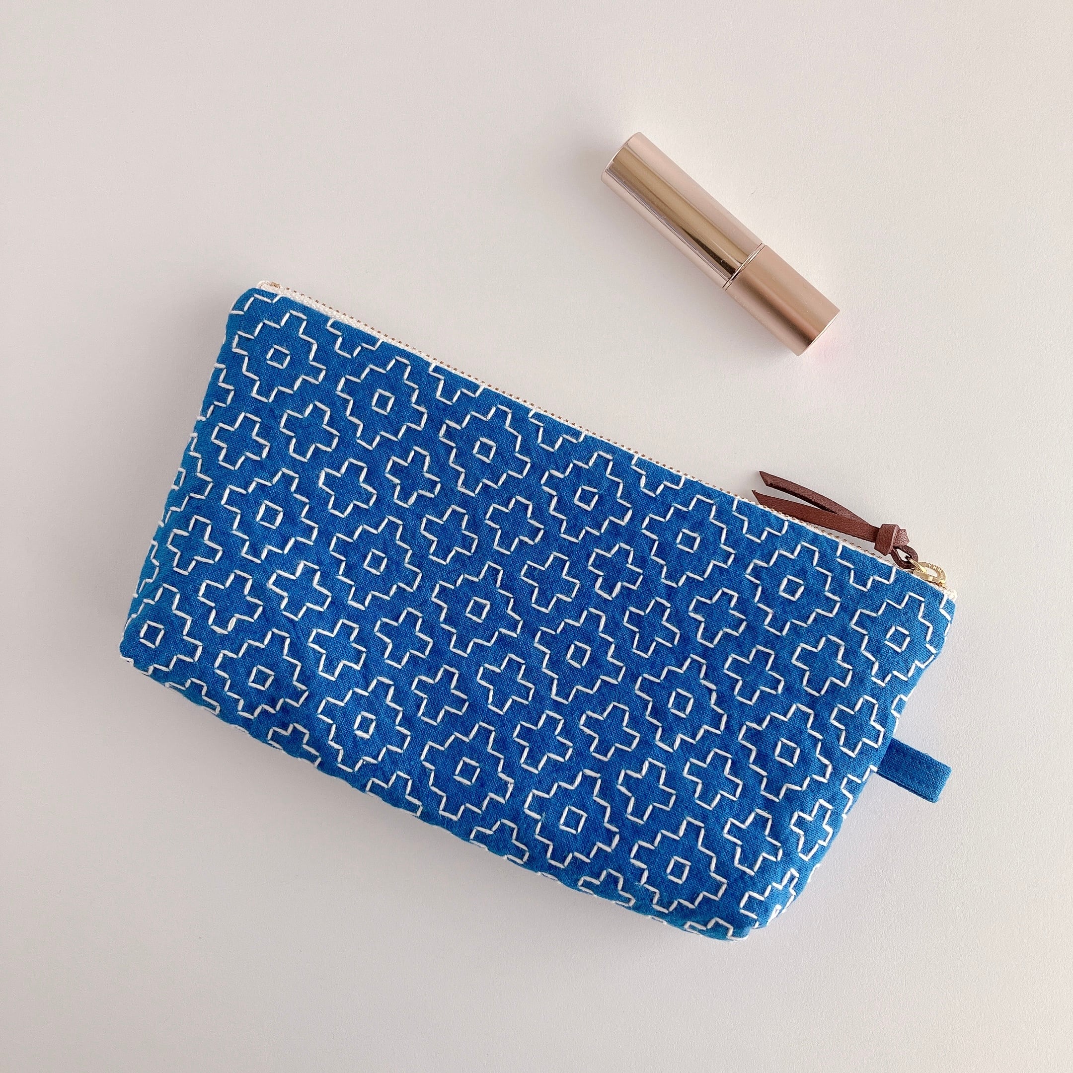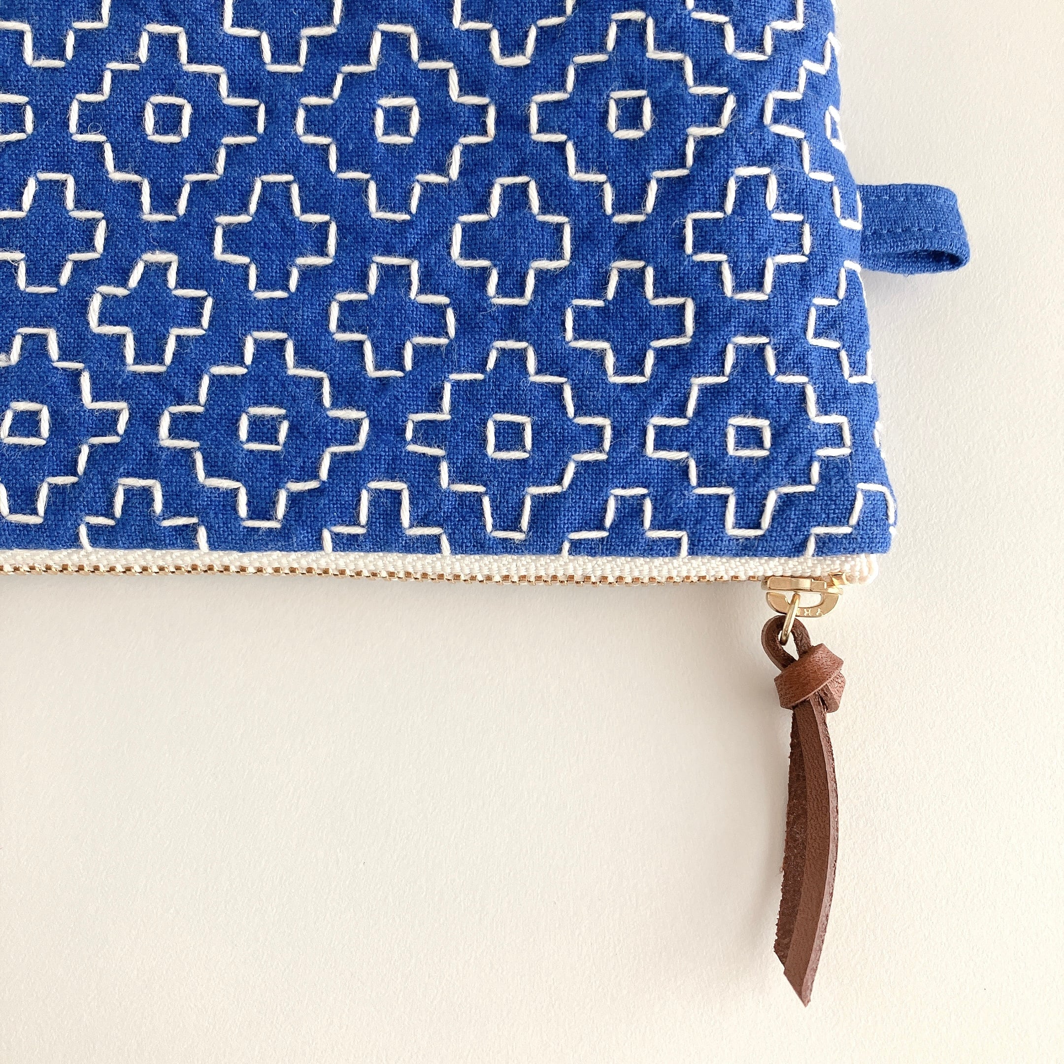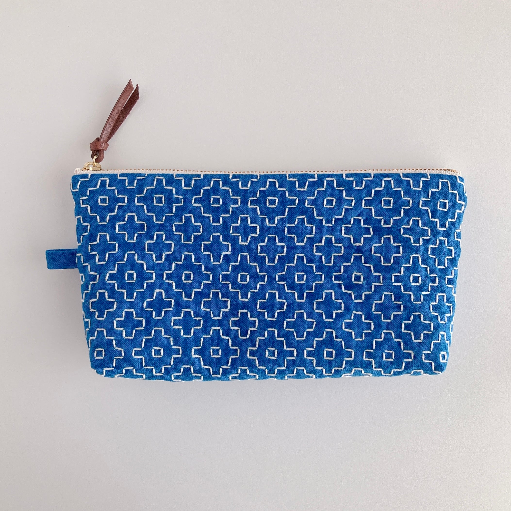 青色のコットンリネン生地に、刺し子をして作ったファスナーポーチです。