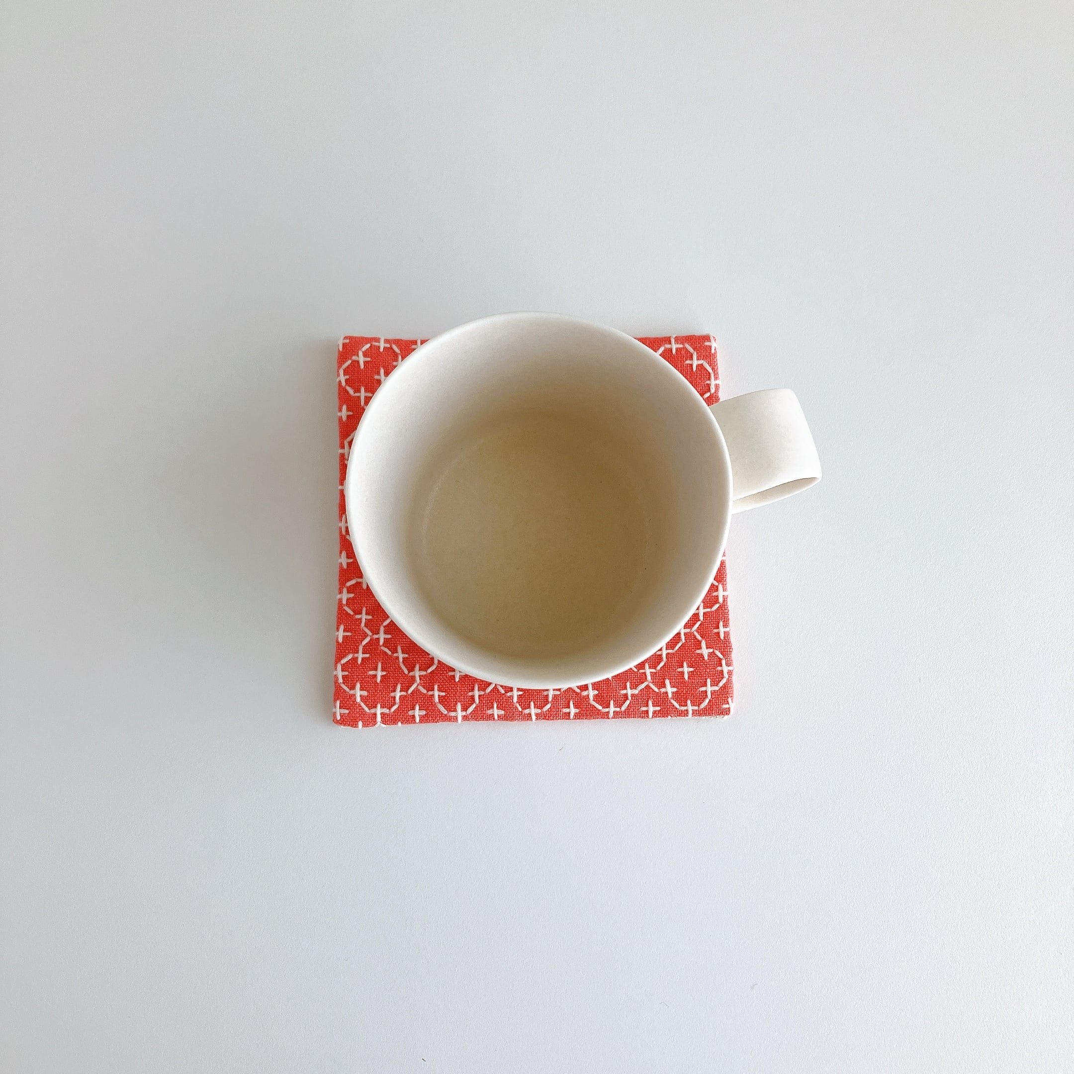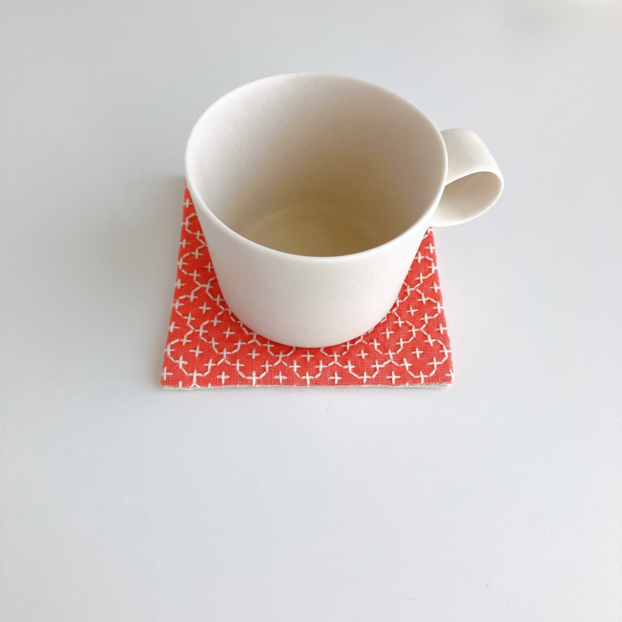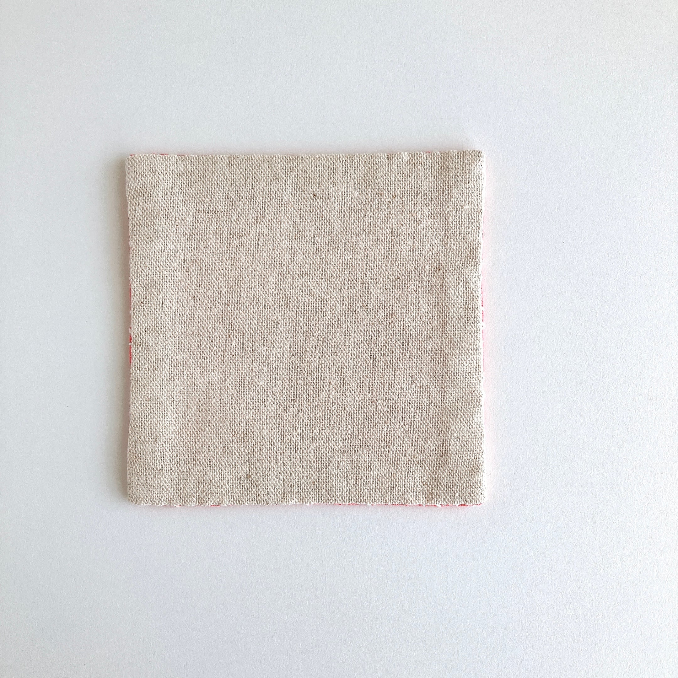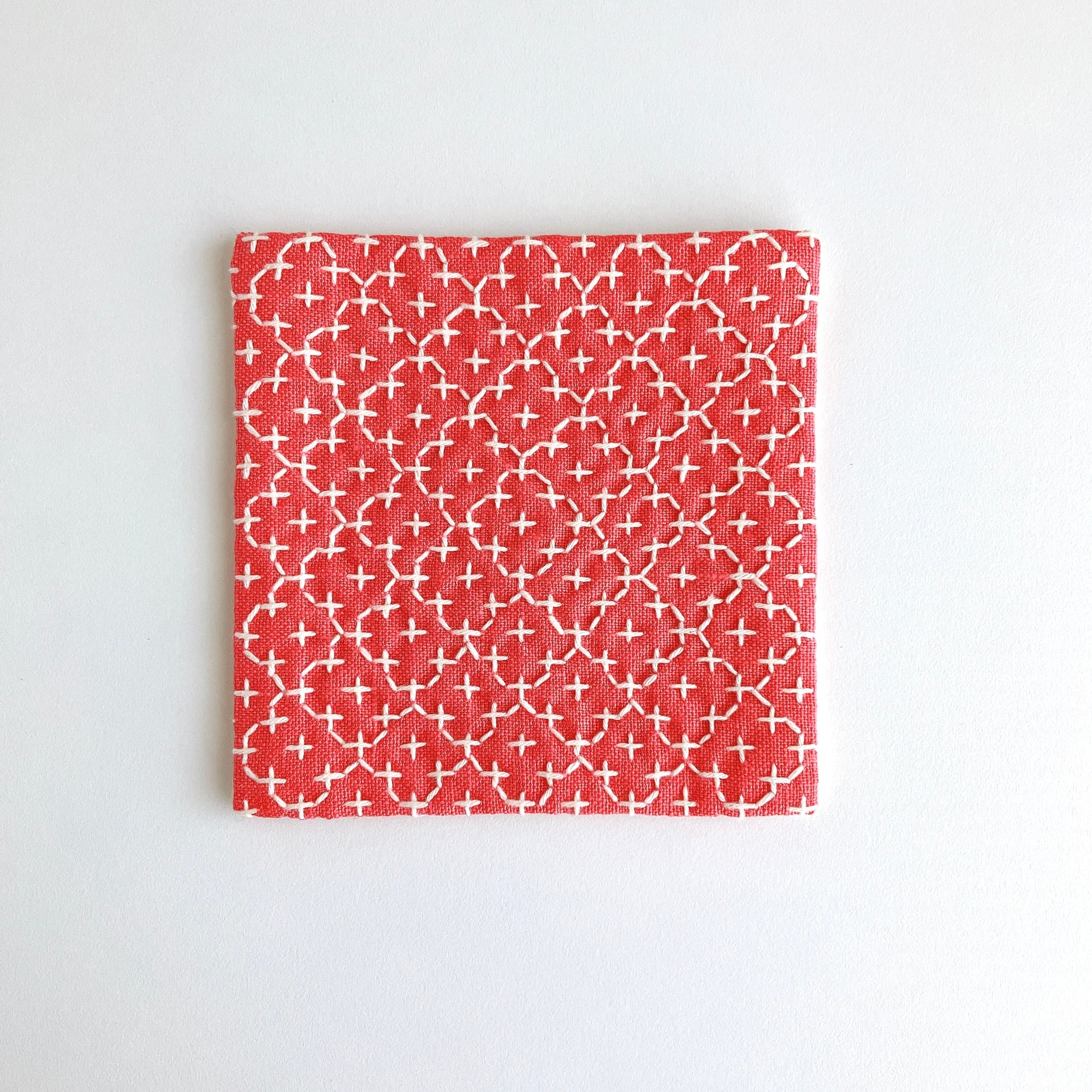 コーラル色のリネン生地を使った、刺し子コースターです。